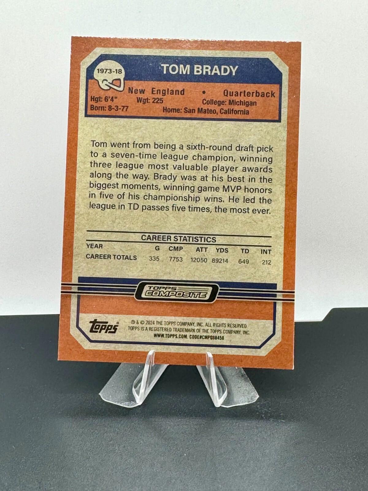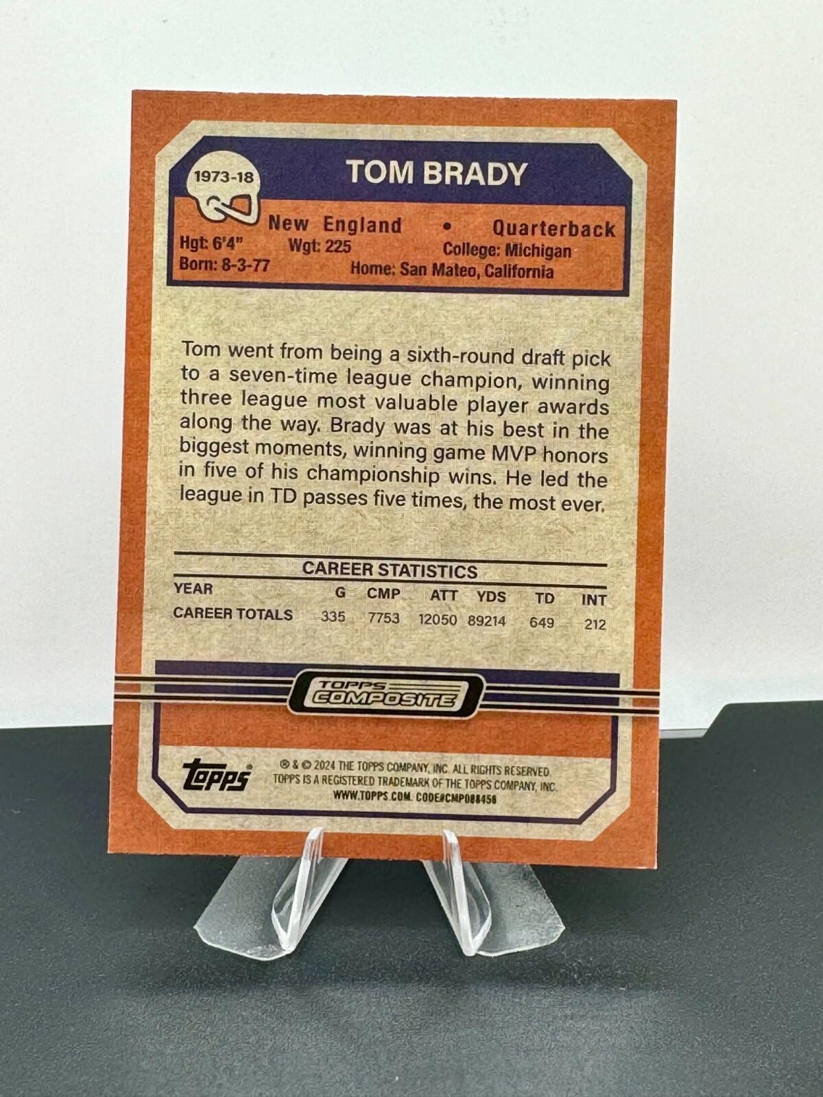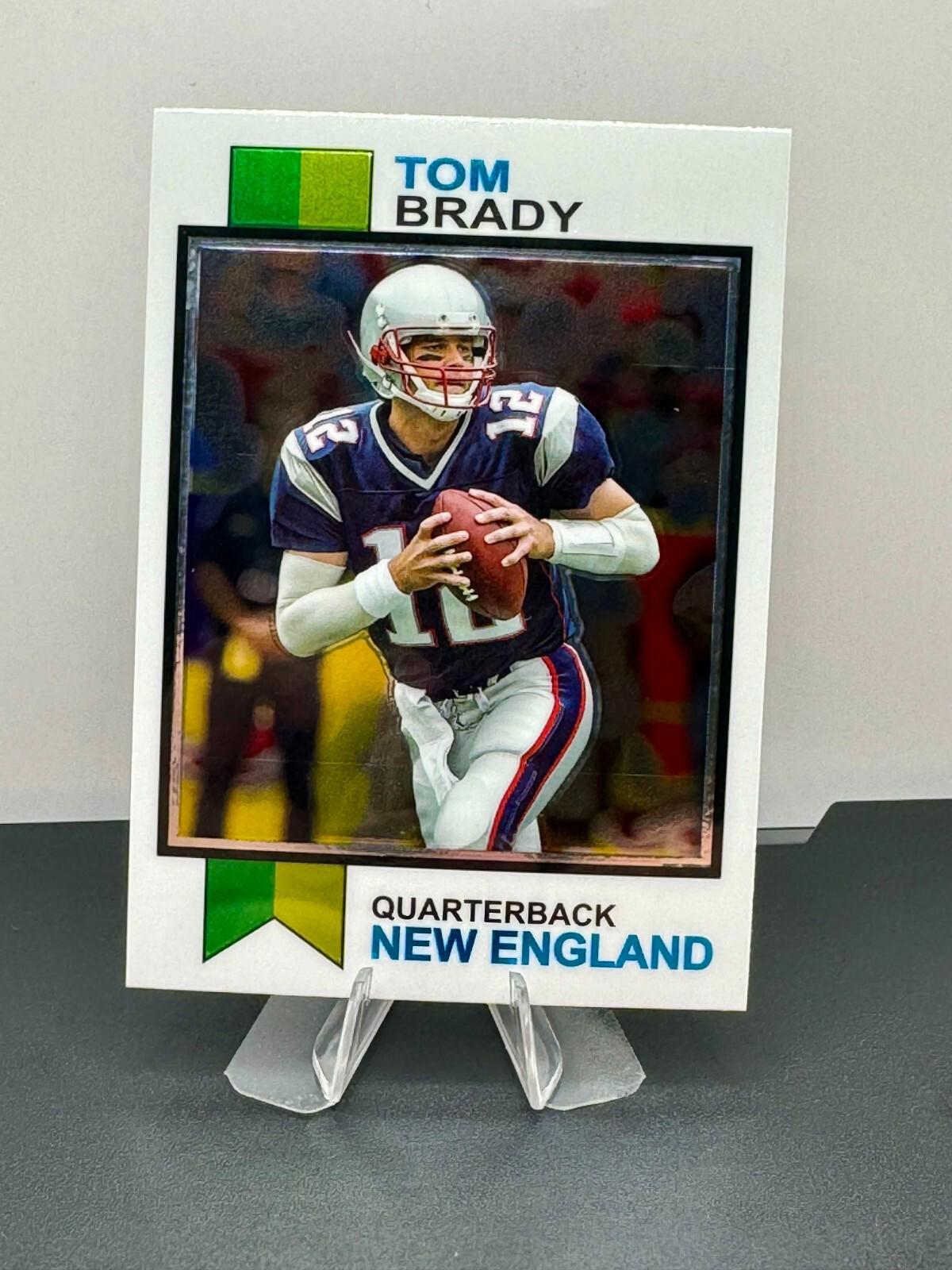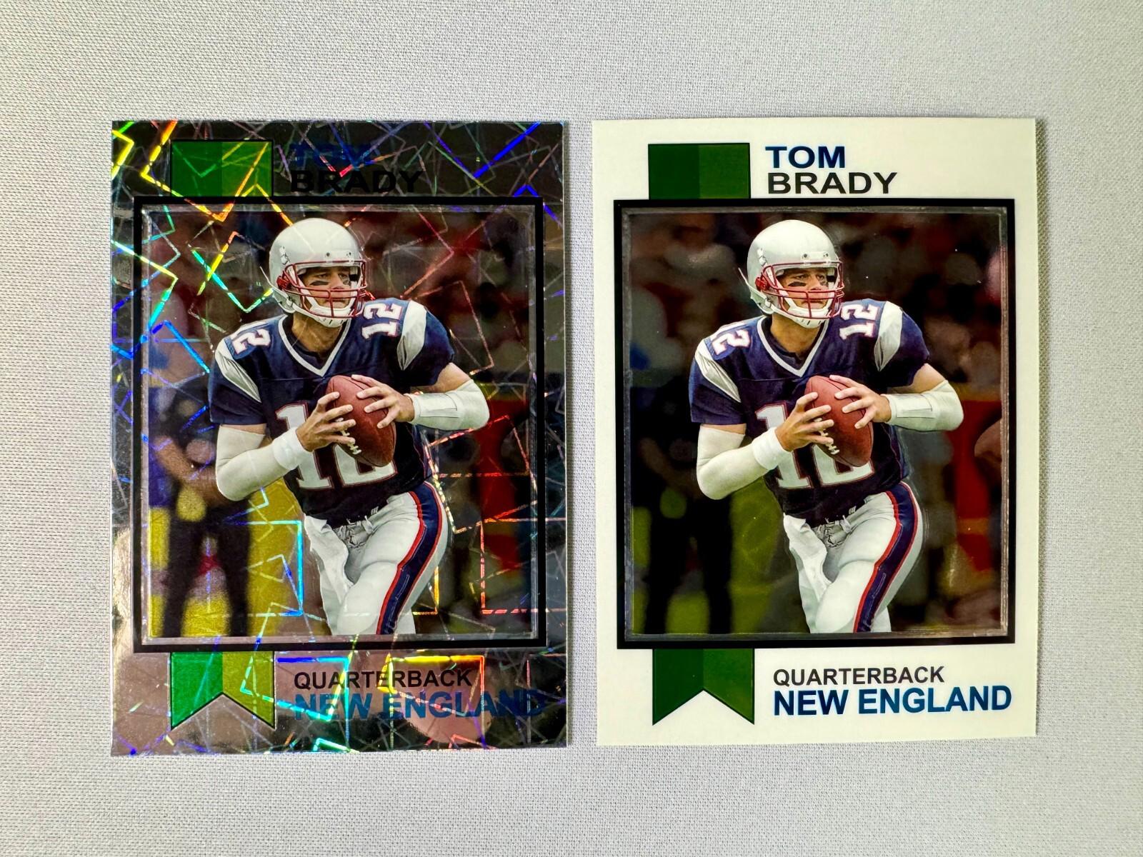 This listing includes two versions of the 2023 Topps Composite Football - 1973 Topps Tom Brady Instert #1973-18. The first card is the base card, and the second is a lazer refractor parallel.  You get both cards with this purchase! Please Read: This is for all of the cards listed.  All listings with the term "LOT" in the title are for all cards in the listing. SHIPPING We make every attempt to ship your item out quickly. Cards and Magazines are shipped out in padded or rigid envelopes are shipped in a semi rigid card protector and a penny sleeve. Larger items are boxed up properly. We cannot control the USPS or UPS when it comes to the timely delivery of an item, their methods and handling of the item. Please DO NOT hold us responsible for the efforts of a delivery service, however, if you suspect damage to the package, please take pictures prior to opening and record the opening.  This would help with any insurance claims and reimbursements. INTERNATIONAL SHIPPING We are not offering international shipping at this time. PICTURES All photos are of the item you are bidding on.  Your item will not be swapped out for a similar item. MULTIPLE PURCHASES When purchasing multiple item from us, please wait to discuss before paying.  We will combine shipping for you and try to save some money. RATINGS & FEEDBACK If you have an issue with something, please try and contact us first so that we may try and work it out. If we come to a satisfactory conclusion, please consider providing a favorable review and positive feedback. Thank you so much for any business that you do with us.