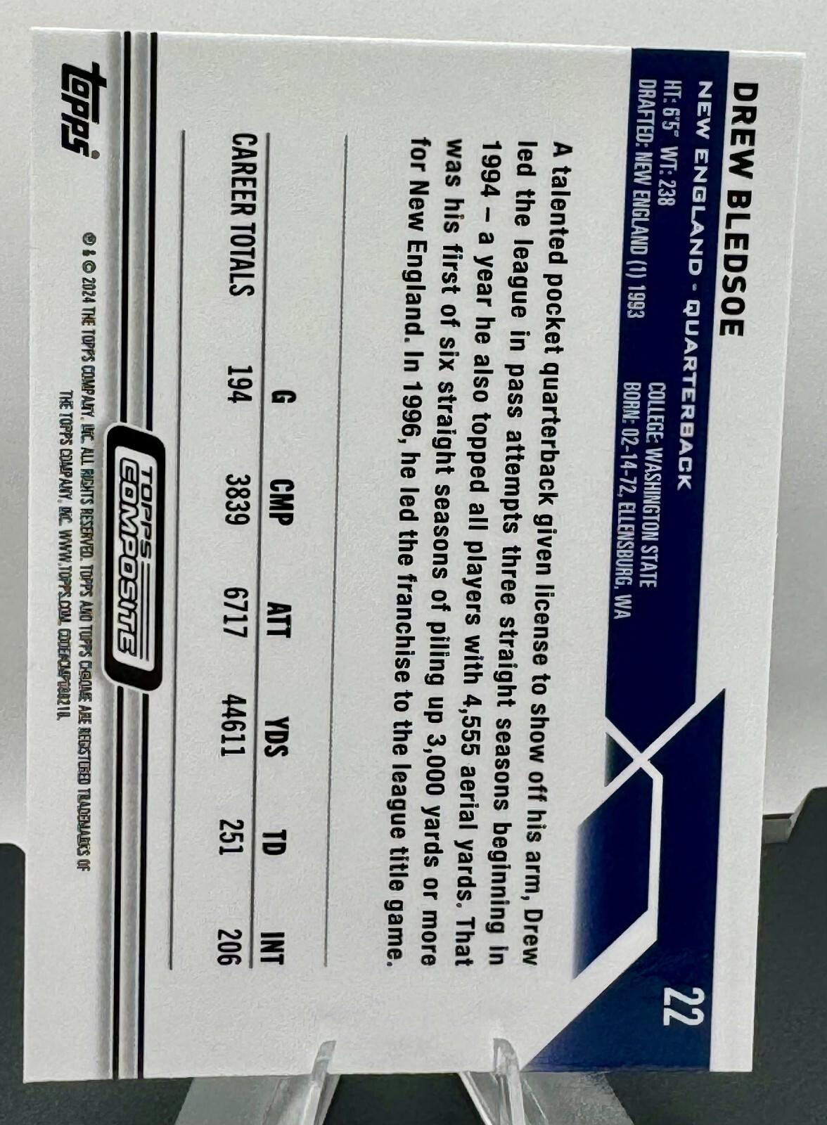 2023 TOPPS COMPOSITE -TOPPS CHROME CHECKERBOARD REFRACTOR DREW BLEDSOE #22 Please Read: SHIPPING SCHEDULE We make every attempt to ship your item out quickly.  Our standard shipping schedule is Tuesday, Thursday, and Saturday drops at the post office and we include all items that have been paid for up to 5PM central the day prior.  That is, all purchases that have been paid for by 5PM central on a Monday will be included in the Tuesday shipment.  If the payment is received after the 5PM deadline, it will be part of the Thursday order drop. SHIPPING DETAILS Cards and Magazines are shipped out in padded or rigid envelopes are shipped in a semi rigid card protector and a penny sleeve. Larger items are boxed up properly. We cannot control the USPS or UPS when it comes to the timely delivery of an item, their methods and handling of the item. Please DO NOT hold us responsible for the efforts of a delivery service, however, if you suspect damage to the package, please take pictures prior to opening and record the opening.  This would help with any insurance claims and reimbursements. INTERNATIONAL SHIPPING We are not offering international shipping at this time. PICTURES All photos are of the item you are bidding on.  Your item will not be swapped out for a similar item. MULTIPLE PURCHASES When purchasing multiple item from us, please wait to discuss before paying.  We will combine shipping for you and try to save some money. RATINGS & FEEDBACK If you have an issue with something, please try and contact us first so that we may try and work it out. If we come to a satisfactory conclusion, please consider providing a favorable review and positive feedback. Thank you so much for any business that you do with us.