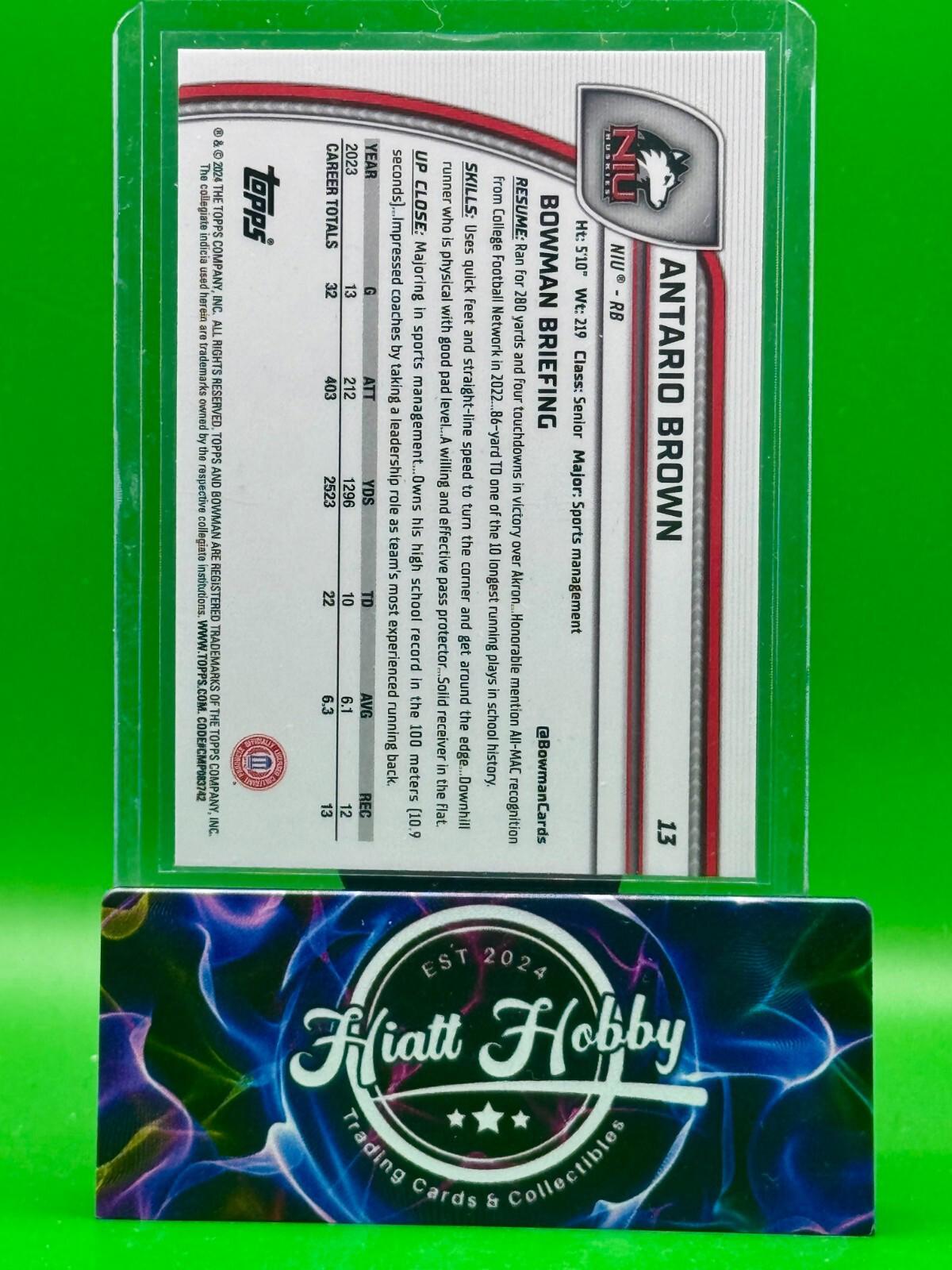The product is a 2024 Bowman Chrome Sapphire University trading card featuring Antario Brown of the Northern Illinois Huskies. This original rookie card is part of the 2024 Bowman University Chrome Sapphire set by Topps and is manufactured in the United States. The standard-sized card is in English and belongs to the National Collegiate Athletic Association (NCAA) league. It does not feature an autograph and is a base parallel/variety, making it a desirable collectible for football fans and card collectors alike.