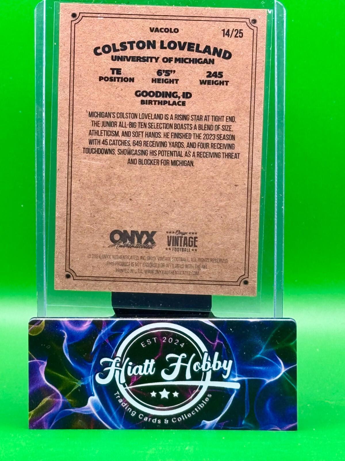 Capture a piece of football history with the 2024 Onyx Vintage Football card featuring Colston Loveland of the Michigan Wolverines. This limited edition collectible, numbered to just 25, boasts an authentic autograph by Loveland himself, making it a coveted treasure for fans and collectors alike. The card, numbered VACOLO, is part of the distinguished 2024 Onyx Vintage Football set, known for its quality and prestige.With its striking red parallel variety, this card stands out in both design and significance. The card stock material ensures durability, while the card's inclusion in the original series underscores its value. This sports trading card, manufactured in the United States, celebrates Loveland's rookie season, adding a unique aspect to its collectibility. Whether for display or as part of a larger collection, this card is a remarkable keepsake from the NCAA's vibrant football legacy.