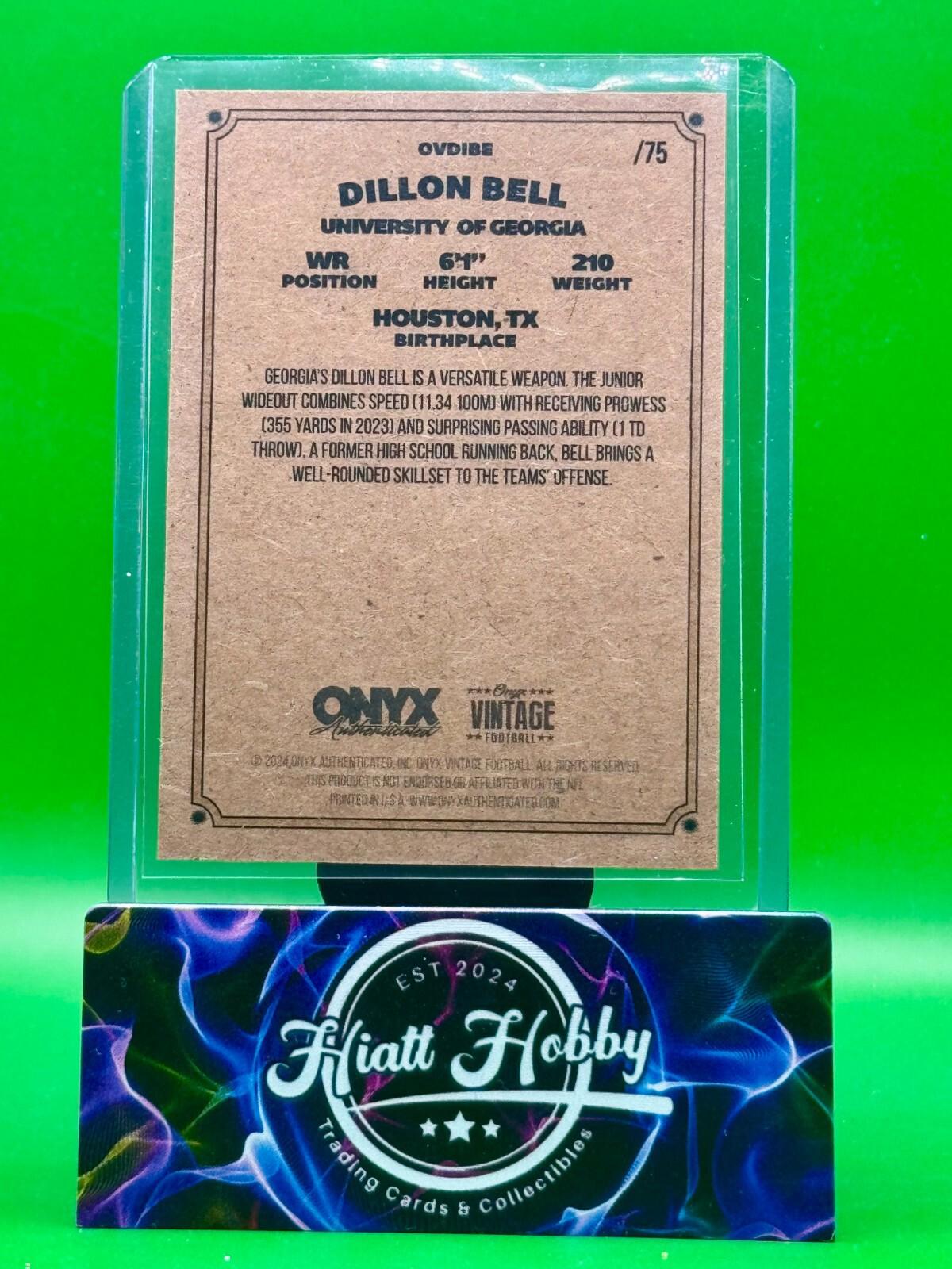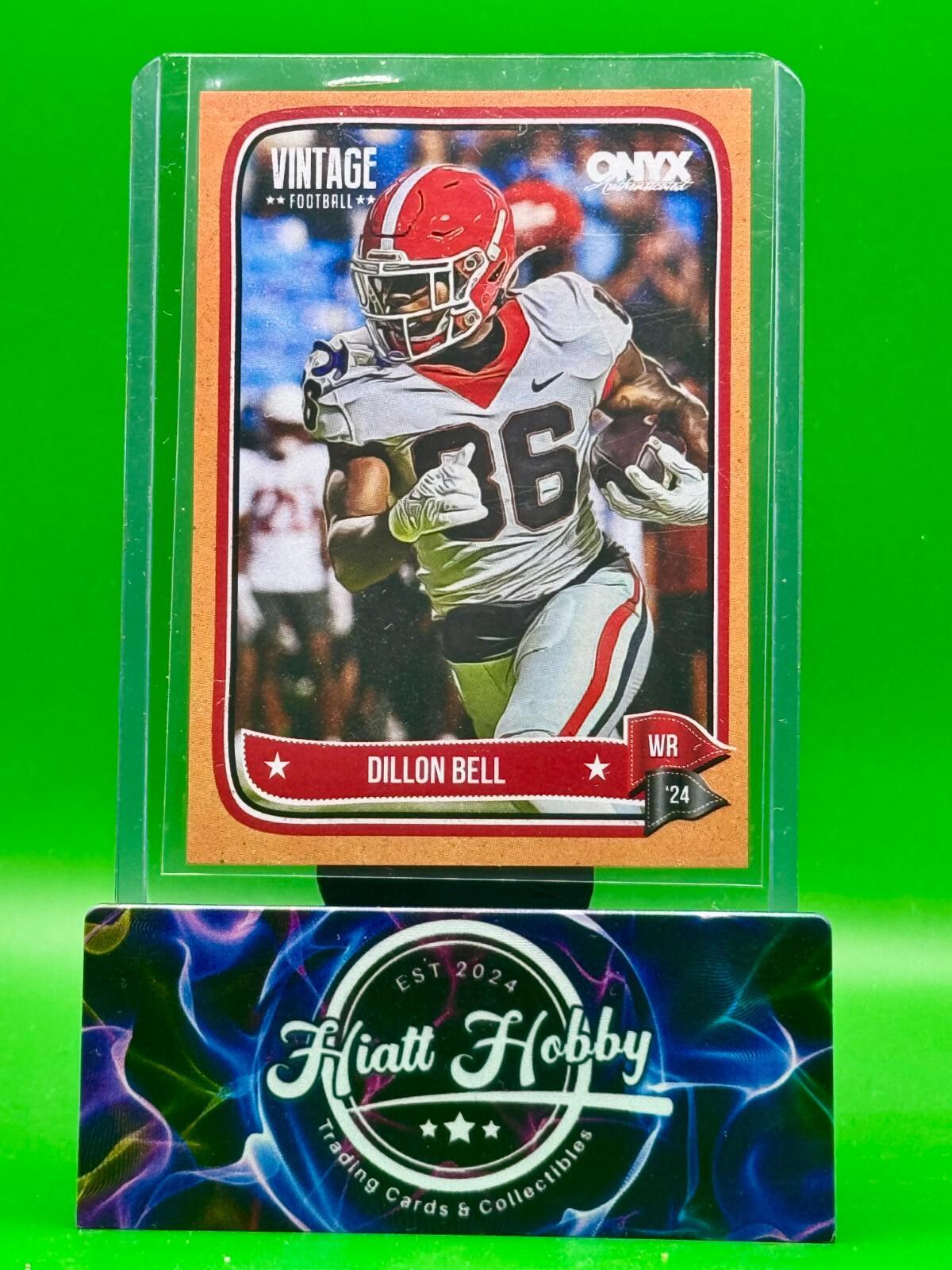 The 2024 Onyx Vintage Football card featuring Dillon Bell, player from the Georgia Bulldogs, is a limited edition collectible with a print run of only 75. This original sports trading card is part of the 2024 Onyx Vintage Football set and is autographed, making it a valuable addition to any football card collection. The card showcases a unique orange border, serial numbering, and is considered a rookie card, adding to its desirability among collectors and fans of the sport.
