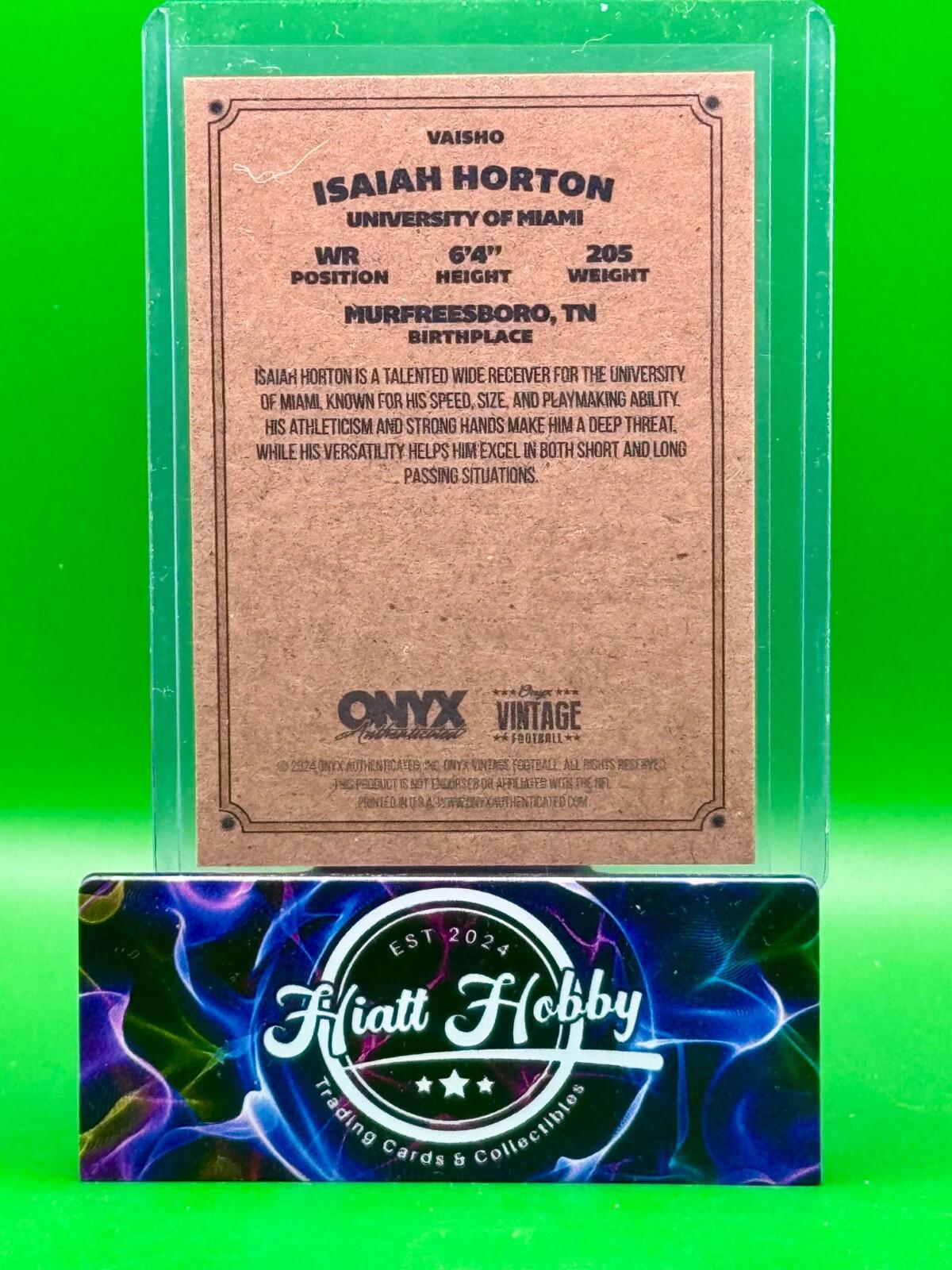 Capture the essence of college football with the 2024 Onyx Vintage Football card featuring Isaiah Horton of the Miami Hurricanes. As a rookie card, it's an essential collectible for fans and collectors alike, showcasing the promise of this up-and-coming athlete. The card, numbered VAISHO, is part of the base set and is crafted from high-quality card stock.The card is a genuine piece of sports memorabilia manufactured in the United States and is presented in English. While it is not autographed, it maintains its originality, ensuring its value as an authentic collectible. Add this piece of NCAA history to your collection and celebrate the legacy and future of Isaiah Horton and the Miami Hurricanes.