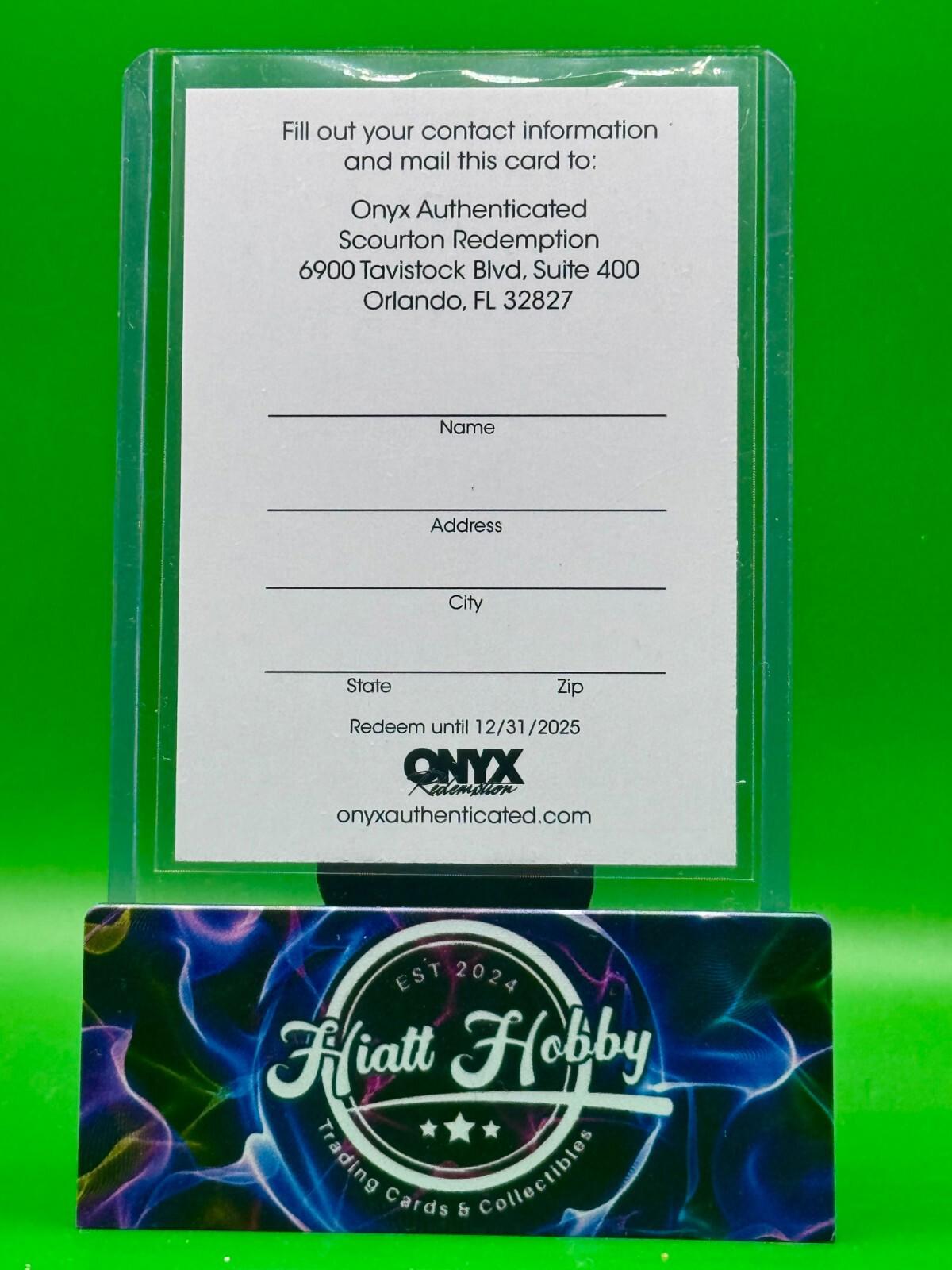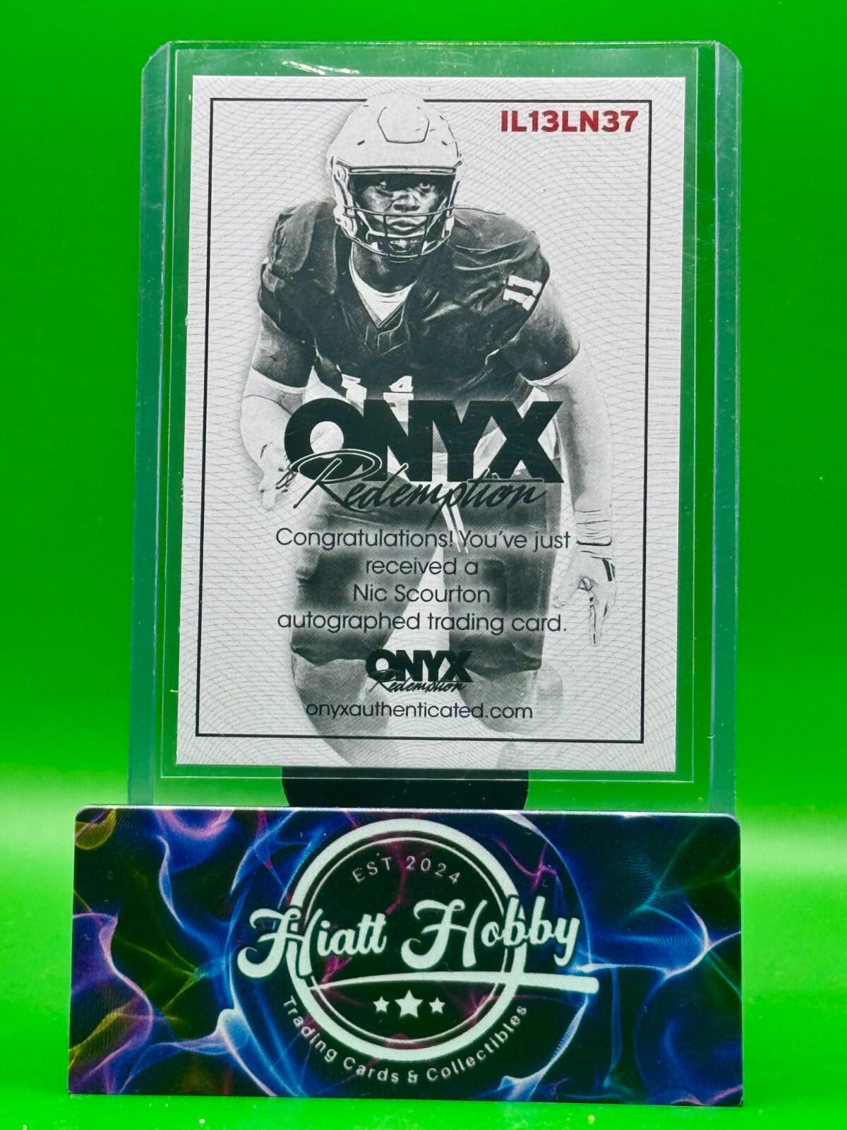 The 2024 Onyx Vintage Football trading card featuring Nic Scourton is a rare and collectible item that includes an autograph from the player himself. This officially licensed card, manufactured by Onyx Authenticated, is part of the Onyx Redemption set and showcases Scourton as a member of the Texas A&M Aggies football team. With a hard-signed autograph and unique redemption feature, this card offers a special addition to any football card collection, making it a valuable piece for fans and collectors alike.