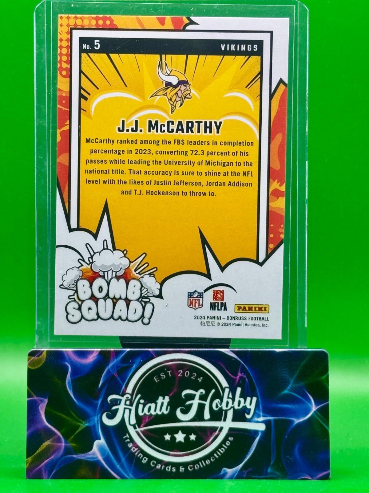 The product is a 2024 Panini Donruss sports trading card featuring J.J. McCarthy from the Minnesota Vikings. This specific card is from the Bomb Squad insert set, labeled as card number 5 in the set. It is a standard size card manufactured by Panini in the United States, part of the National Football League (NFL) season of 2024. The card does not include an autograph and is classified as a rookie insert, making it a desirable collectible for football fans and trading card enthusiasts.