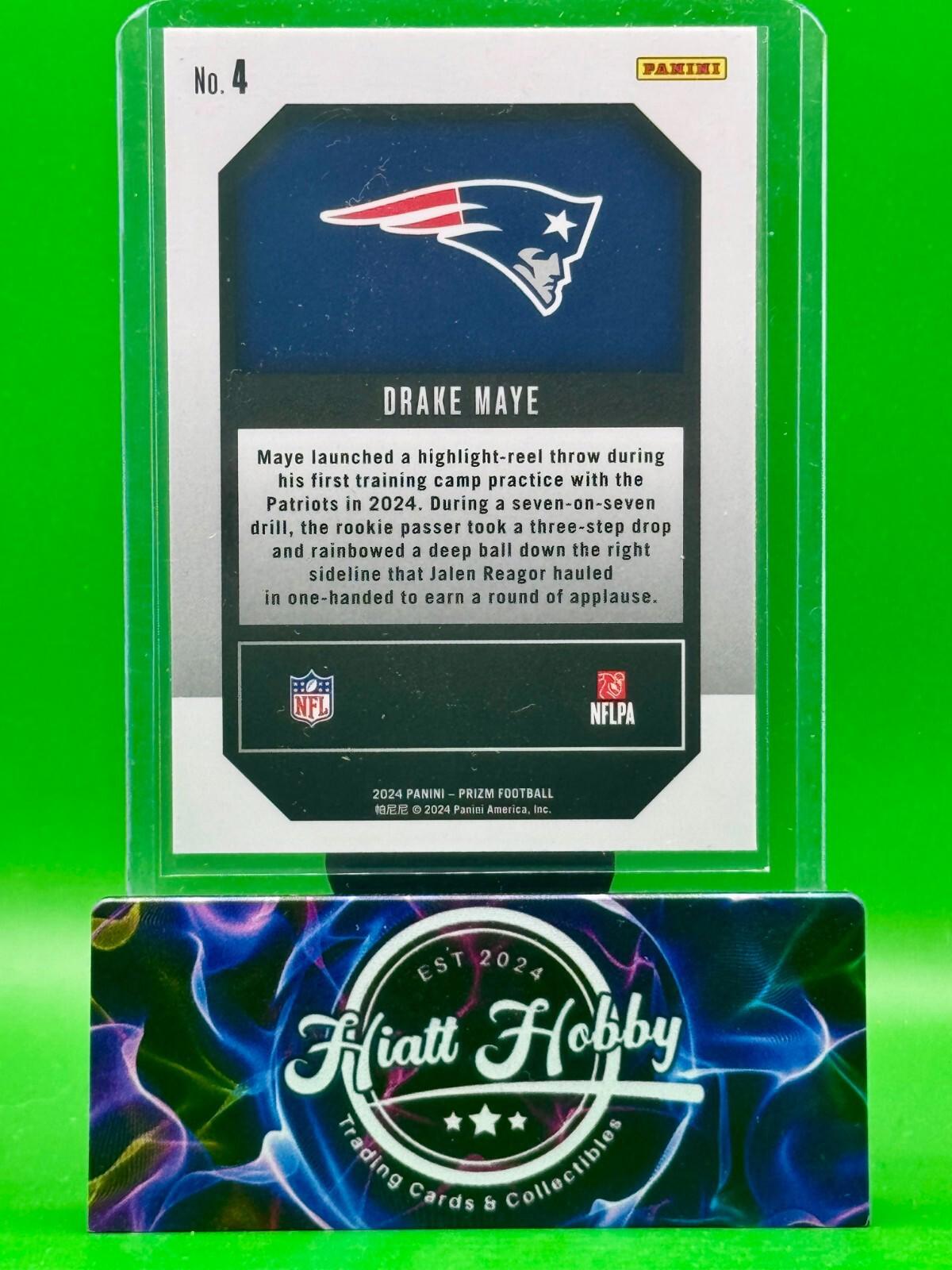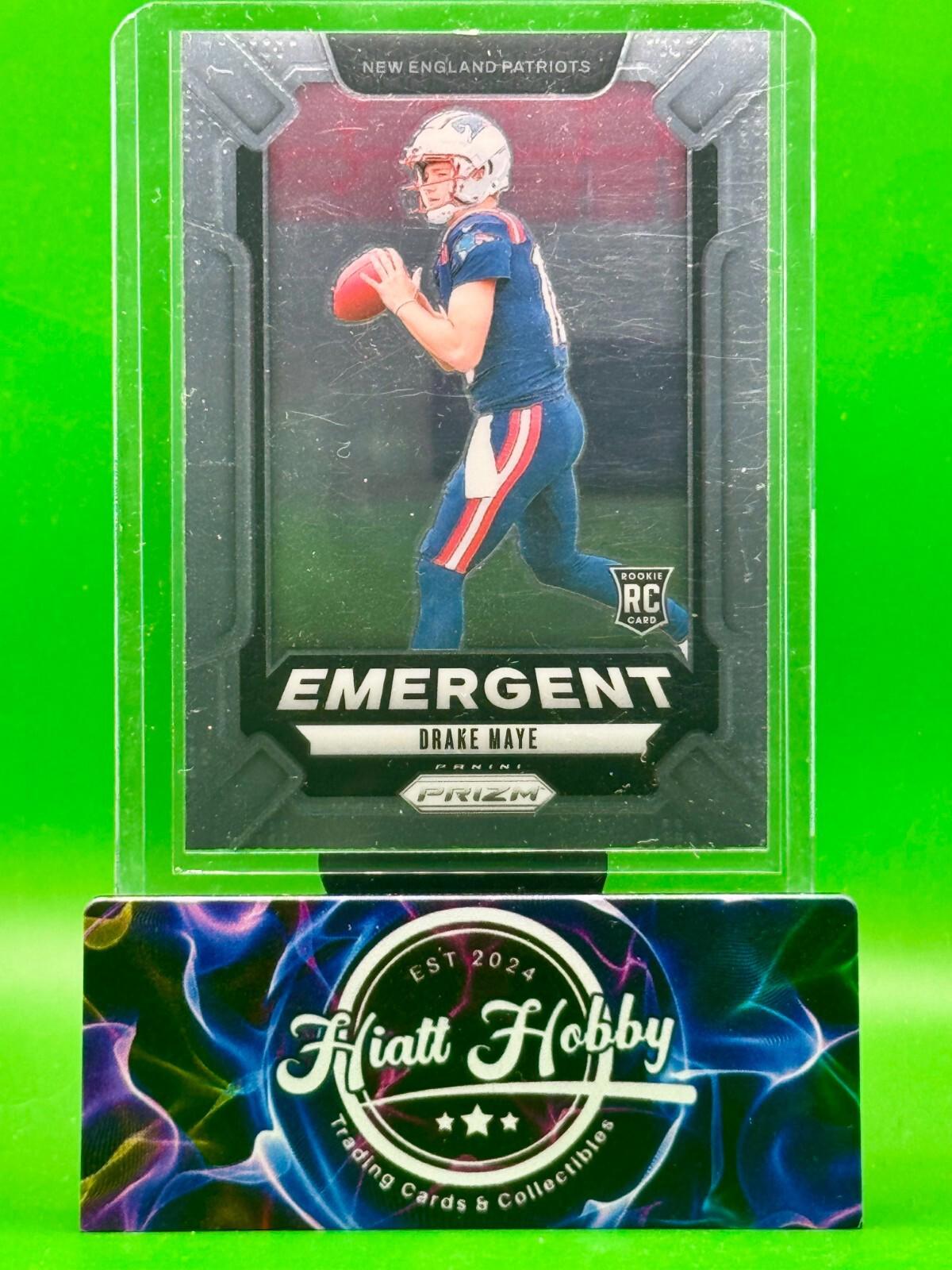 The 2024 Panini Prizm Emergent Drake Maye #4 trading card is a rookie insert featuring the highly sought-after Prizm parallel variety. This original card showcases the standout player from the National Football League (NFL) in his debut season with the New England Patriots. Manufactured by Panini in the United States, this card is part of the 2024 set and is a valuable addition to any sports trading card collection. With its English language text and football sport theme, this card captures the excitement of the game and celebrates the talent of Drake Maye as he makes his mark in the league. Please Read: SHIPPING SCHEDULE We make every attempt to ship your item out quickly.  Our standard shipping schedule is Tuesday, Thursday, and Saturday drops at the post office and we include all items that have been paid for up to 5PM central the day prior.  That is, all purchases that have been paid for by 5PM central on a Monday will be included in the Tuesday shipment.  If the payment is received after the 5PM deadline, it will be part of the Thursday order drop. SHIPPING DETAILS Cards and Magazines are shipped out in padded or rigid envelopes and/or inserts to protect the item.  Individual cards are typically are shipped in a semi rigid card protector and a penny sleeve.  Combined orders will be packaged securely, but may not have a semi-rigid card protector (item will still be well protected) . Larger items are boxed up properly. We cannot control the USPS or UPS when it comes to the timely delivery of an item, their methods and handling of the item. Please DO NOT hold us responsible for the efforts of a delivery service, however, if you suspect damage to the package, please take pictures prior to opening and record the opening.  This would help with any insurance claims and reimbursements. For orders Exceeding $100, a handling charge is added to offset the cost of insuring your purchase.  This fee will ensure that both parties are protected from loss or damage We offer eBay Standard Envelope Shipping for orders at or below $20.  If your order exceeds $20, you must select USPS Ground Advantage for shipping in order for the order to be processed. INTERNATIONAL SHIPPING We are not offering international shipping at this time. PICTURES All photos are of the item you are bidding on.  Your item will not be swapped out for a similar item. MULTIPLE PURCHASES When purchasing multiple item from us, please wait to discuss before paying.  We will combine shipping for you and try to save some money. RATINGS & FEEDBACK If you have an issue with something, please try and contact us first so that we may try and work it out. If we come to a satisfactory conclusion, please consider providing a favorable review and positive feedback. Thank you so much for any business that you do with us.
