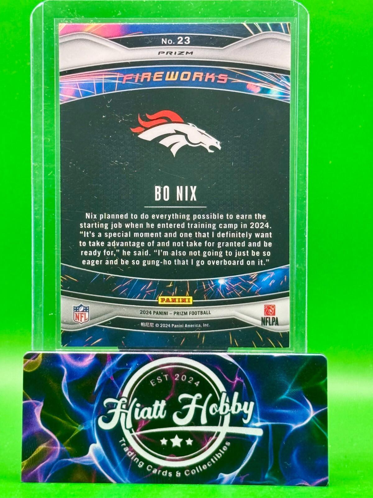 The 2024 Panini Prizm Fireworks Bo Nix #23 Green Prizm (RC) trading card is a standard-sized sports card featuring the talented quarterback from the Denver Broncos. This original card is part of the Fireworks insert set for the 2024 season, showcasing Bo Nix in a green ice prizm parallel variety design that adds a unique touch to any football card collection. With its rookie designation and English language text, this card is a must-have for fans and collectors looking to celebrate the exciting career of Bo Nix in the National Football League.