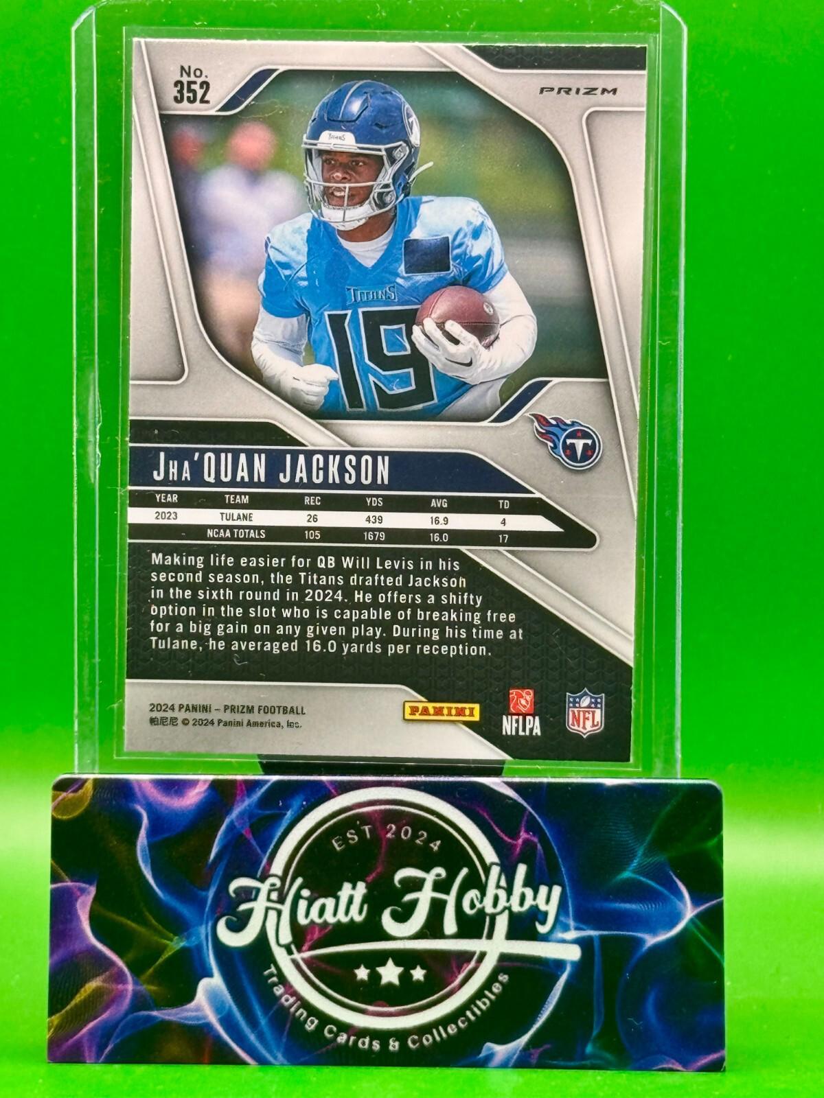 The product is a 2024 Panini Prizm sports trading card featuring Jha'Quan Jackson, a player from the Tennessee Titans in the National Football League (NFL). This rookie card is a Black & White Checker Prizm parallel variety, part of the original 2024 Panini Prizm set. The card is in standard size and is an original licensed reprint, not a vintage collectible. It is a sought-after item for football card collectors and fans of the sport. Please Read: SHIPPING SCHEDULE We make every attempt to ship your item out quickly.  Our standard shipping schedule is Tuesday, Thursday, and Saturday drops at the post office and we include all items that have been paid for up to 5PM central the day prior.  That is, all purchases that have been paid for by 5PM central on a Monday will be included in the Tuesday shipment.  If the payment is received after the 5PM deadline, it will be part of the Thursday order drop. SHIPPING DETAILS Cards and Magazines are shipped out in padded or rigid envelopes and/or inserts to protect the item.  Individual cards are typically are shipped in a semi rigid card protector and a penny sleeve.  Combined orders will be packaged securely, but may not have a semi-rigid card protector (item will still be well protected) . Larger items are boxed up properly. We cannot control the USPS or UPS when it comes to the timely delivery of an item, their methods and handling of the item. Please DO NOT hold us responsible for the efforts of a delivery service, however, if you suspect damage to the package, please take pictures prior to opening and record the opening.  This would help with any insurance claims and reimbursements. For orders Exceeding $100, a handling charge is added to offset the cost of insuring your purchase.  This fee will ensure that both parties are protected from loss or damage We offer eBay Standard Envelope Shipping for orders at or below $20.  If your order exceeds $20, you must select USPS Ground Advantage for shipping in order for the order to be processed. INTERNATIONAL SHIPPING We are not offering international shipping at this time. PICTURES All photos are of the item you are bidding on.  Your item will not be swapped out for a similar item. MULTIPLE PURCHASES When purchasing multiple item from us, please wait to discuss before paying.  We will combine shipping for you and try to save some money. RATINGS & FEEDBACK If you have an issue with something, please try and contact us first so that we may try and work it out. If we come to a satisfactory conclusion, please consider providing a favorable review and positive feedback. Thank you so much for any business that you do with us.