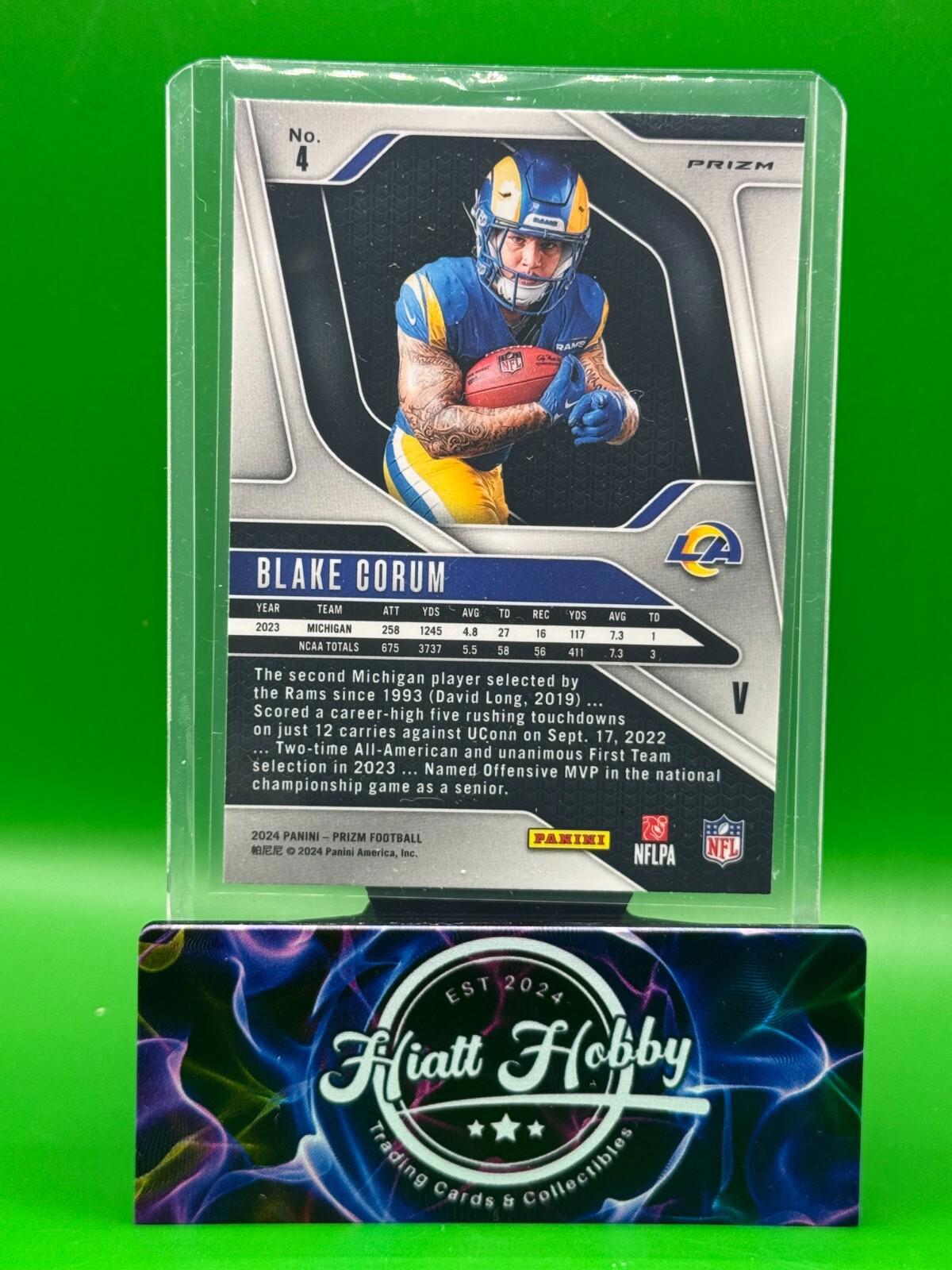 Capture the excitement of the gridiron with this 2024 Panini Prizm Rookie Variations Silver Prizm #4 featuring the up-and-coming Los Angeles Rams player, Blake Corum. A must-have for football enthusiasts and card collectors alike, this card celebrates the rookie's potential and showcases his debut season in the National Football League.Distinguished by its Silver Prizm parallel, this trading card is part of the highly sought-after 2024 Panini Prizm set. The insert highlights Corum's early career and is a valuable addition to any collection. As card #4 in the series, it's a unique find that commemorates the athlete's entry into the professional league.