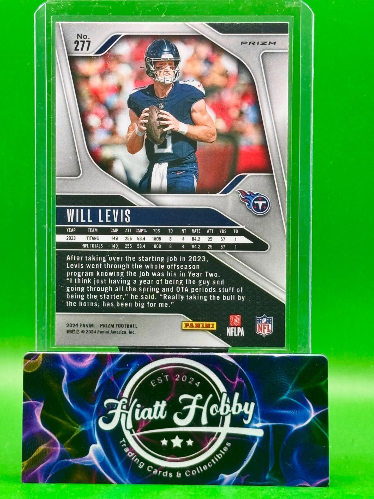 The 2024 Panini Prizm football trading card featuring Will Levis #277 in Black & White Checker Prizm is a standard-sized card manufactured by Panini. This original card showcases the player from the Tennessee Titans in the National Football League (NFL) for the 2024 season. With a unique parallel variety, this collectible item represents a piece of the sports trading card market and is a must-have for football enthusiasts and collectors alike.