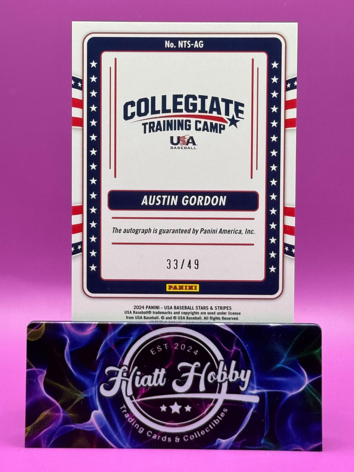 Capture a piece of baseball history with the 2024 Panini Stars and Stripes Collegiate National Team Signatures Red card featuring Austin Gordon. As a limited edition collectible, this card bears the autograph of the promising athlete, authenticated by Panini Authentic, ensuring its legitimacy and value. With a limited print run of just 49, this rookie card is a must-have for fans and collectors alike.Embellished with a bold red parallel variety, the card showcases Gordon in his USA Baseball Collegiate National Team uniform, capturing the essence of his debut season. The standard card size ensures it fits seamlessly into any collection, while the English language card is perfect for an American audience. Celebrate the Major League Baseball legacy with this exquisite piece of memorabilia.