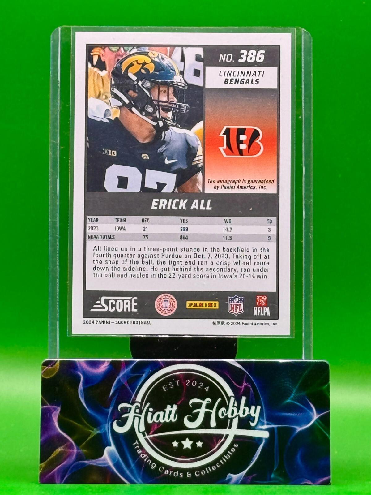 The product is a 2024 Panini Score Football trading card featuring rookie player Erick All from the Cincinnati Bengals. This autographed card, signed by Erick All himself with a label or sticker, is authenticated by Panini Authentic and is part of the 2024 Score set. It is a standard-sized card in English language, manufactured in the United States, and is a valuable collectible for fans of NFL football and sports trading cards.