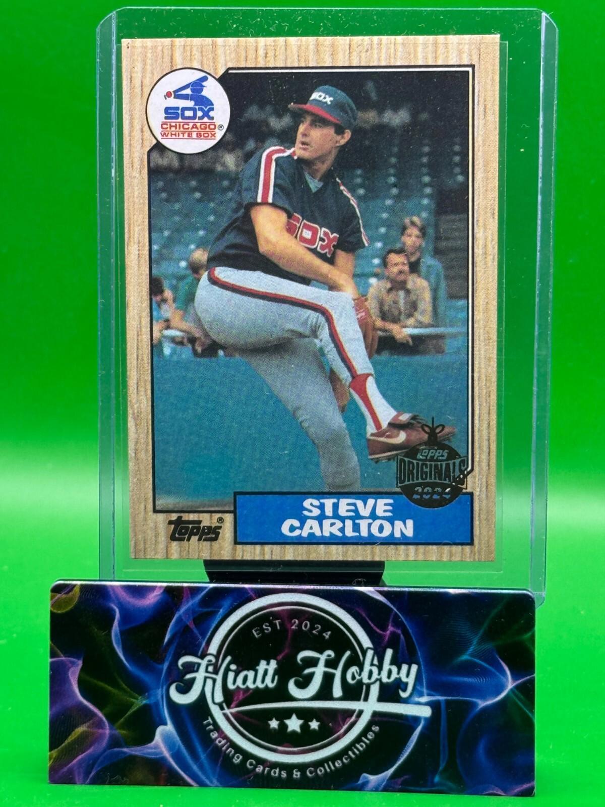 This 2024 Topps Baseball card features Steve Carlton, a legendary player for the Chicago White Sox. The card is part of the 1987 Topps Originals set and has the card number 718. It is an original, licensed reprint and is made of card stock material. The card is in near mint or better condition and is ungraded. It is not autographed, but it does have the autograph authentication of Topps. The card is in English language and is a base set card. This card is a great addition to any baseball fan's collection and is perfect for those who admire Steve Carlton's talent.