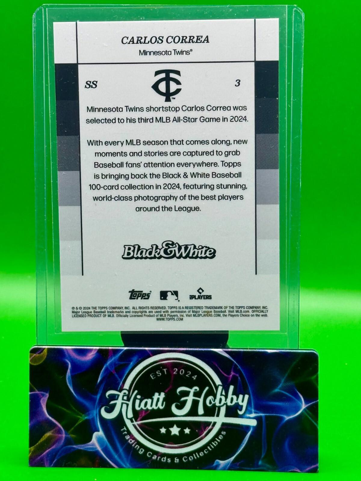 Elevate your baseball card collection with the 2024 Topps Black & White Carlos Correa card, numbered #3. This standard-sized gem features the Minnesota Twins' star in a striking yellow parallel variety, adding a vibrant touch to this collectible. With a limited print run of just 75, this card is not just a keepsake but a piece of sports memorabilia that celebrates the craftsmanship of Topps and the skill of the player.Crafted from quality card stock and produced in the United States, this card captures the essence of the MLB World Series season. As an original release, it's a must-have for enthusiasts and fans of the sport. Note that this card is not autographed and has not been graded, ensuring that it arrives at your collection in its pristine form, ready to be the centerpiece of your 2024 baseball card compilation.