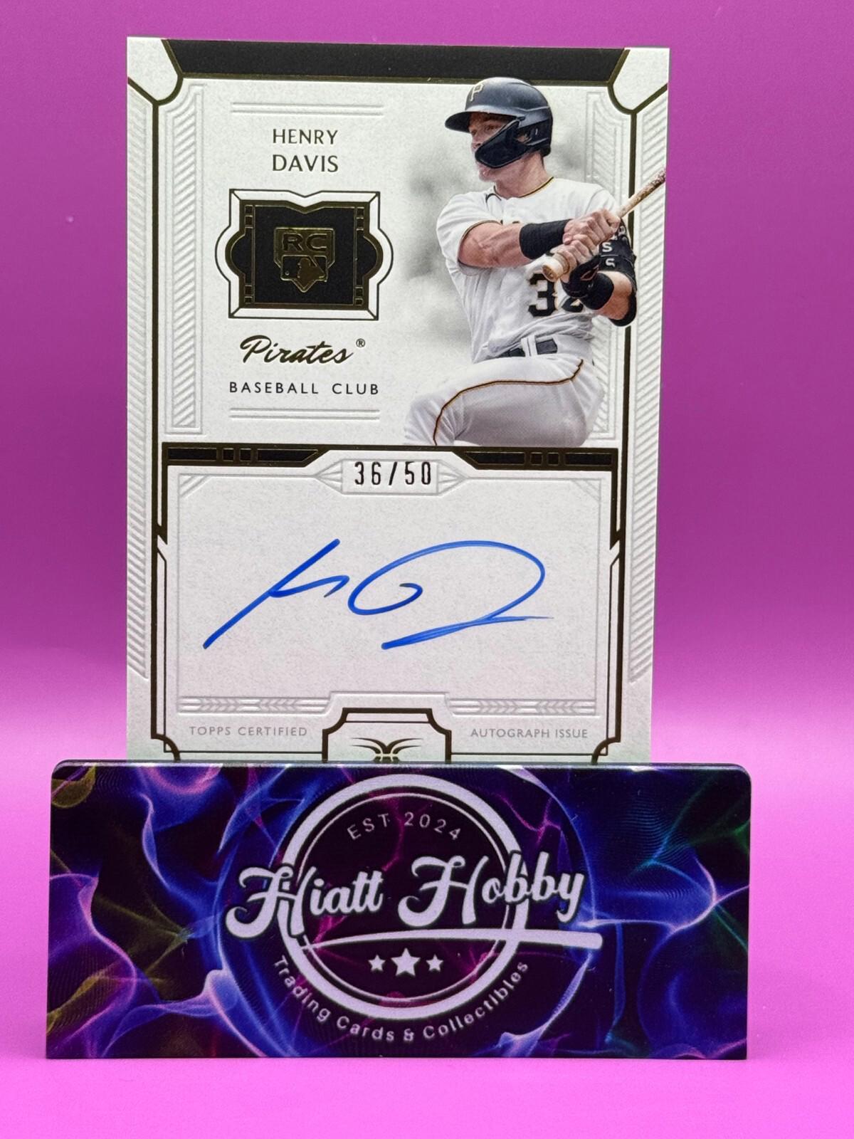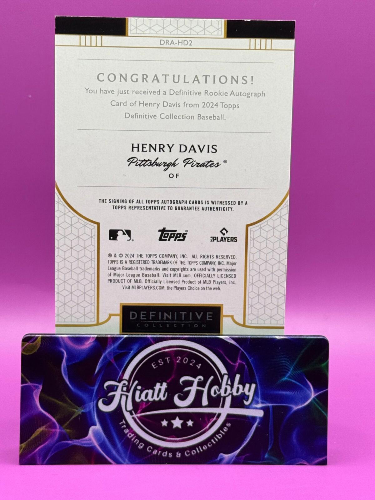 The 2024 Topps Definitive Collection features a rare card of Henry Davis, the rookie catcher for the Pittsburgh Pirates. This limited edition card, numbered DRA-HD2, is part of a parallel variety with a print run of only 50. It is made of high-quality card stock and features an autograph from Henry Davis himself, authenticated by Topps and mounted on the card itself. This card is a must-have for any serious baseball collector, especially those who support the Pirates. It is a great way to show your love for the team and add a unique piece to your collection. Don't miss out on this rare opportunity to own a piece of baseball history!