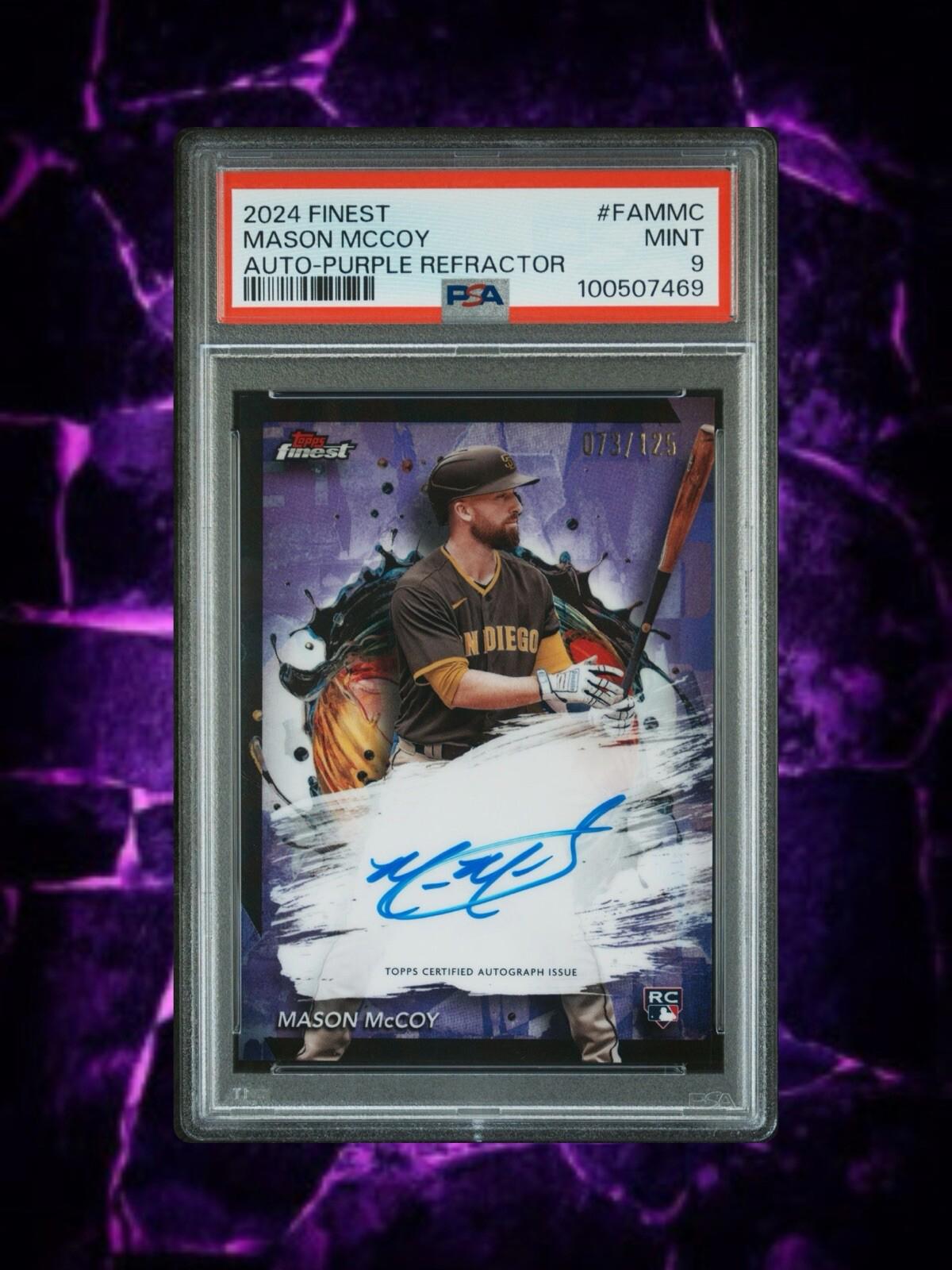 This is a rare and collectible 2024 Topps Finest sports trading card featuring Mason McCoy of the San Diego Padres. The card is part of the Finest Autographs insert set and has a print run of 125. It is a parallel variety card with a purple refractor design and is serial numbered for added authenticity.