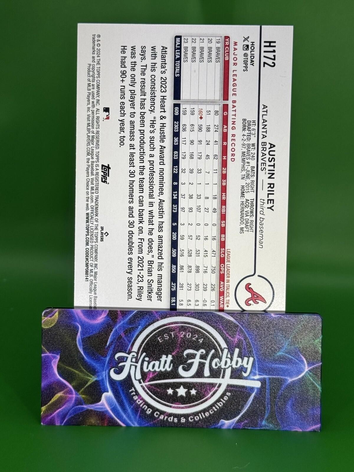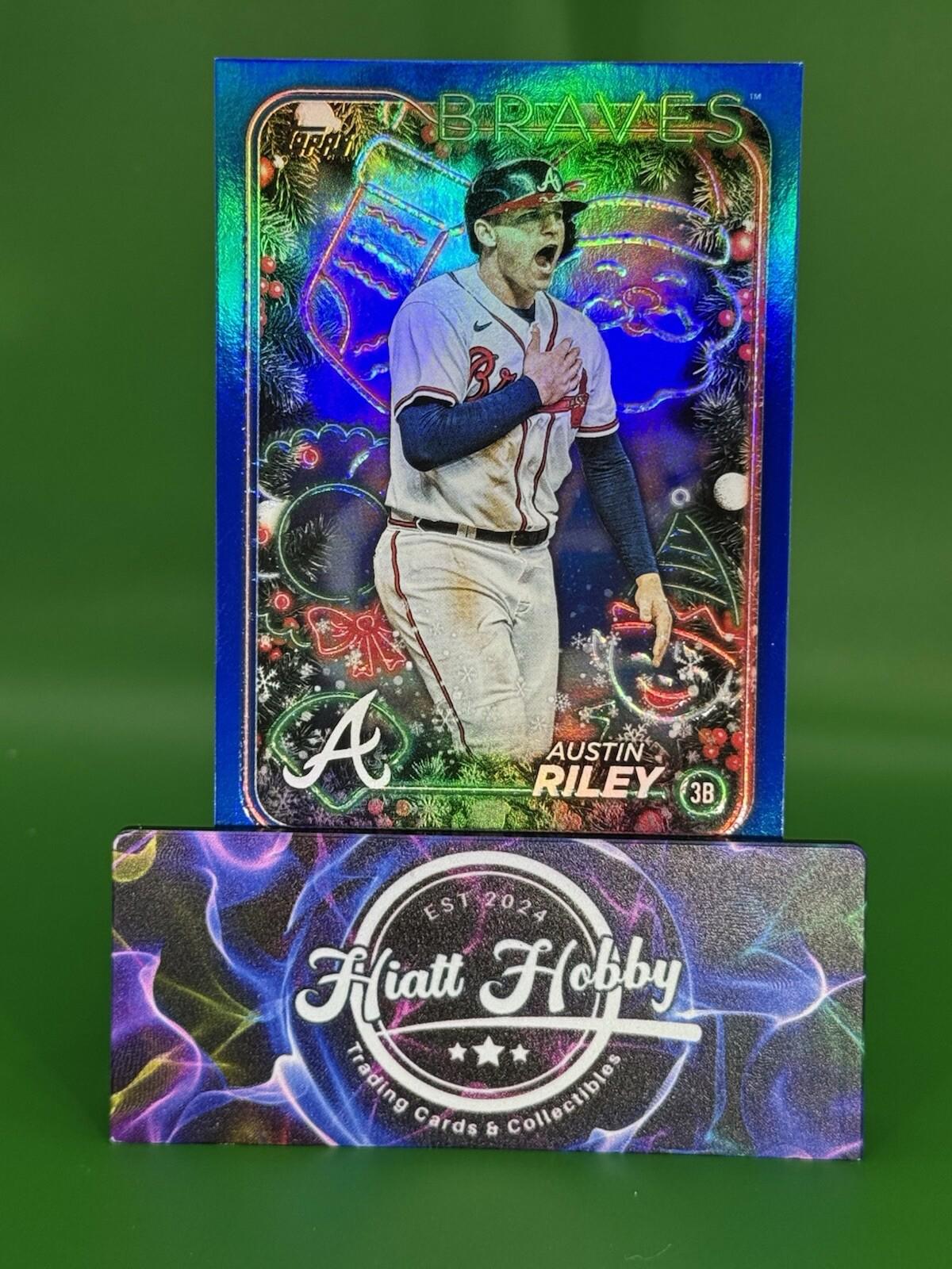 This 2024 Topps Holiday sports trading card features Austin Riley of the Atlanta Braves in a Holo Blue parallel/variety. The card is part of the 2024 Topps Holiday set and has the card number H172. It is a great addition for any Major League (MLB) fan looking to complete their collection.