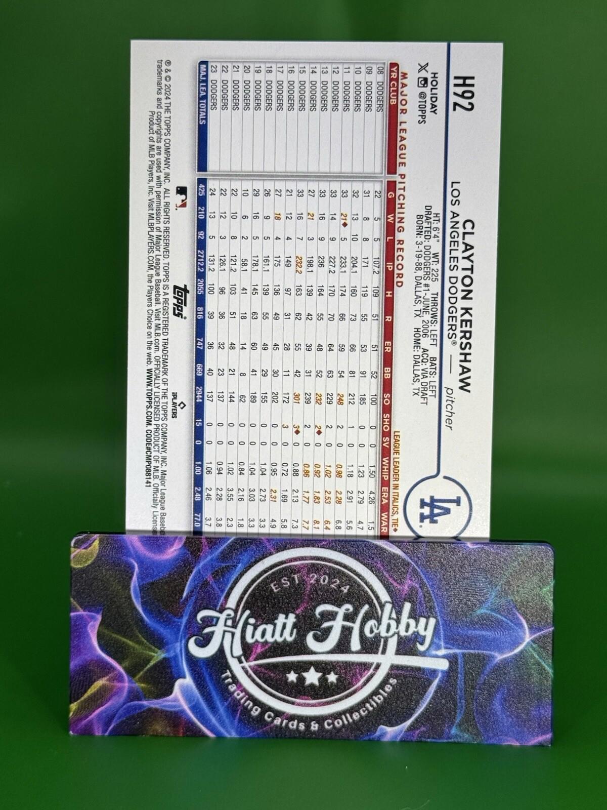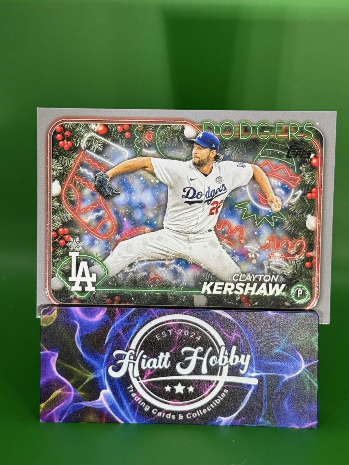 From the 2024 Topps Holiday set, this card is a unique addition to any baseball card collection, featuring high-quality production and a sleek silver glitter parallel that sets it apart. Perfect for commemorating Kershaw's impact on the MLB, this card is a standout piece that reflects the excitement of the sport and the joy of the season.