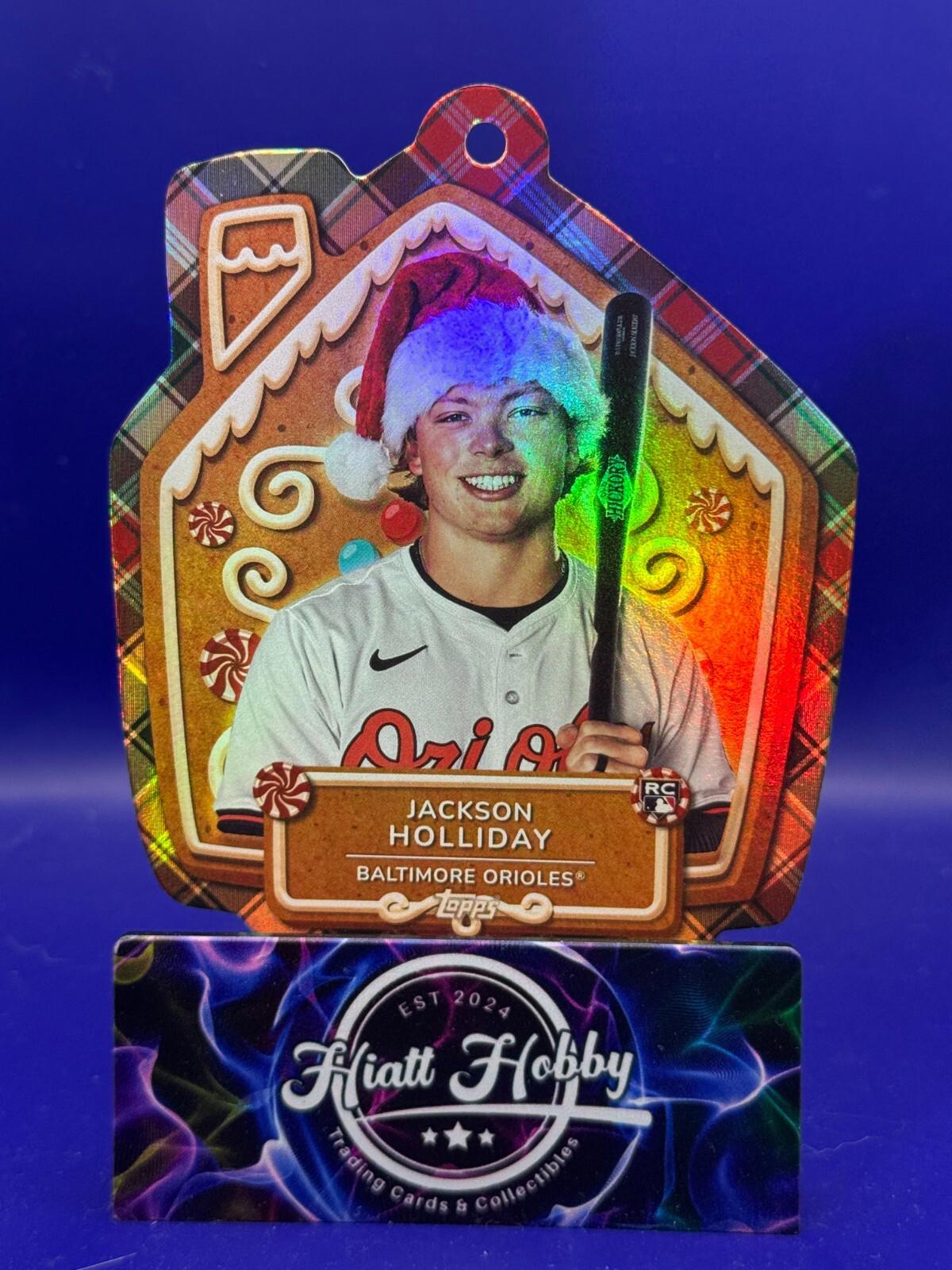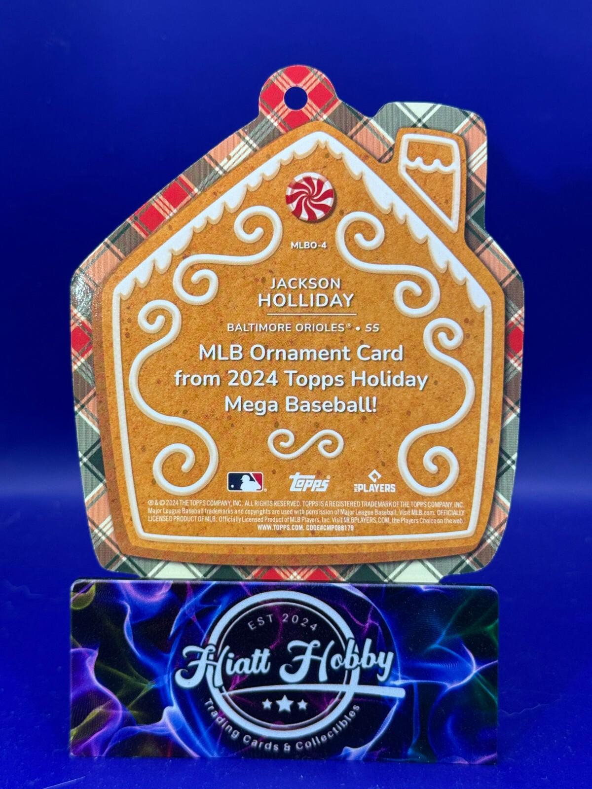Elevate your baseball card collection with the 2024 Topps Holiday Oversized Ornaments Die-Cuts #MLBO-4 featuring the promising talent, Jackson Holliday. As a rookie card, it captures the early career of Holliday with the Baltimore Orioles, an appealing subject for collectors and fans alike. The card is a unique addition from the 2024 Topps Holiday set, well-known for its festive theme and quality craftsmanship.This card boasts the Die-Cut feature, standing out with its intricate design that complements the standard card size. Proudly manufactured in the United States, it is presented in English without autograph embellishments, keeping the focus on the player and his achievements during the MLB World Series event. A must-have for enthusiasts of the sport and collectors of MLB memorabilia.