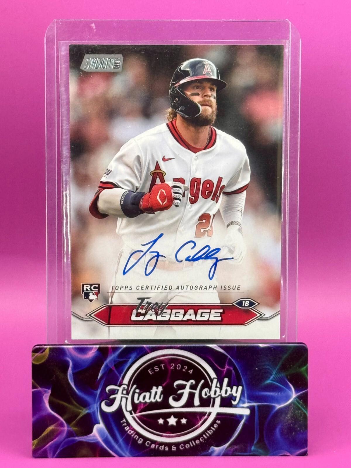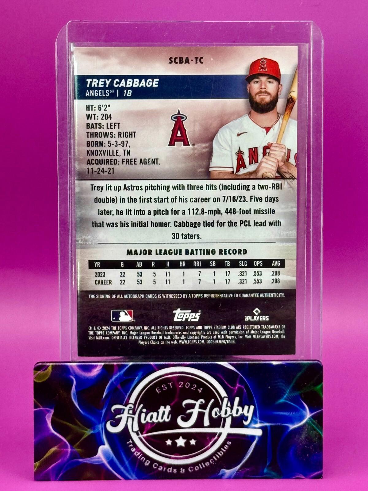 The product is a 2024 Topps Stadium Club autographed sports trading card featuring Trey Cabbage, a rookie player from the Los Angeles Angels. The card is signed by Trey Cabbage in a hard-signed format and is authenticated by Topps. This original card is part of the Major League Baseball (MLB) league, specifically designed for the 2024 MLB World Series. Made in the United States, this standard-sized card is a valuable collectible for baseball fans and collectors alike. Please Read: SHIPPING SCHEDULE We make every attempt to ship your item out quickly.  Our standard shipping schedule is Tuesday, Thursday, and Saturday drops at the post office and we include all items that have been paid for up to 5PM central the day prior.  That is, all purchases that have been paid for by 5PM central on a Monday will be included in the Tuesday shipment.  If the payment is received after the 5PM deadline, it will be part of the Thursday order drop. SHIPPING DETAILS Cards and Magazines are shipped out in padded or rigid envelopes and/or inserts to protect the item.  Individual cards are typically are shipped in a semi rigid card protector and a penny sleeve.  Combined orders will be packaged securely, but may not have a semi-rigid card protector (item will still be well protected) . Larger items are boxed up properly. We cannot control the USPS or UPS when it comes to the timely delivery of an item, their methods and handling of the item. Please DO NOT hold us responsible for the efforts of a delivery service, however, if you suspect damage to the package, please take pictures prior to opening and record the opening.  This would help with any insurance claims and reimbursements. For orders Exceeding $100, a handling charge is added to offset the cost of insuring your purchase.  This fee will ensure that both parties are protected from loss or damage We offer eBay Standard Envelope Shipping for orders at or below $20.  If your order exceeds $20, you must select USPS Ground Advantage for shipping in order for the order to be processed. INTERNATIONAL SHIPPING Any orders outside of the United States are non-returnable. PICTURES For listings that do not have variations, the card depicted in the photo is the card you will receive.  In cases that the listing has variations, the card may not be the same, but each card is inspected to ensure the same level of condition. MULTIPLE PURCHASES When purchasing multiple item from us, please wait to discuss before paying.  We will combine shipping for you and try to save some money. RATINGS & FEEDBACK If you have an issue with something, please try and contact us first so that we may try and work it out. If we come to a satisfactory conclusion, please consider providing a favorable review and positive feedback. Thank you so much for any business that you do with us.