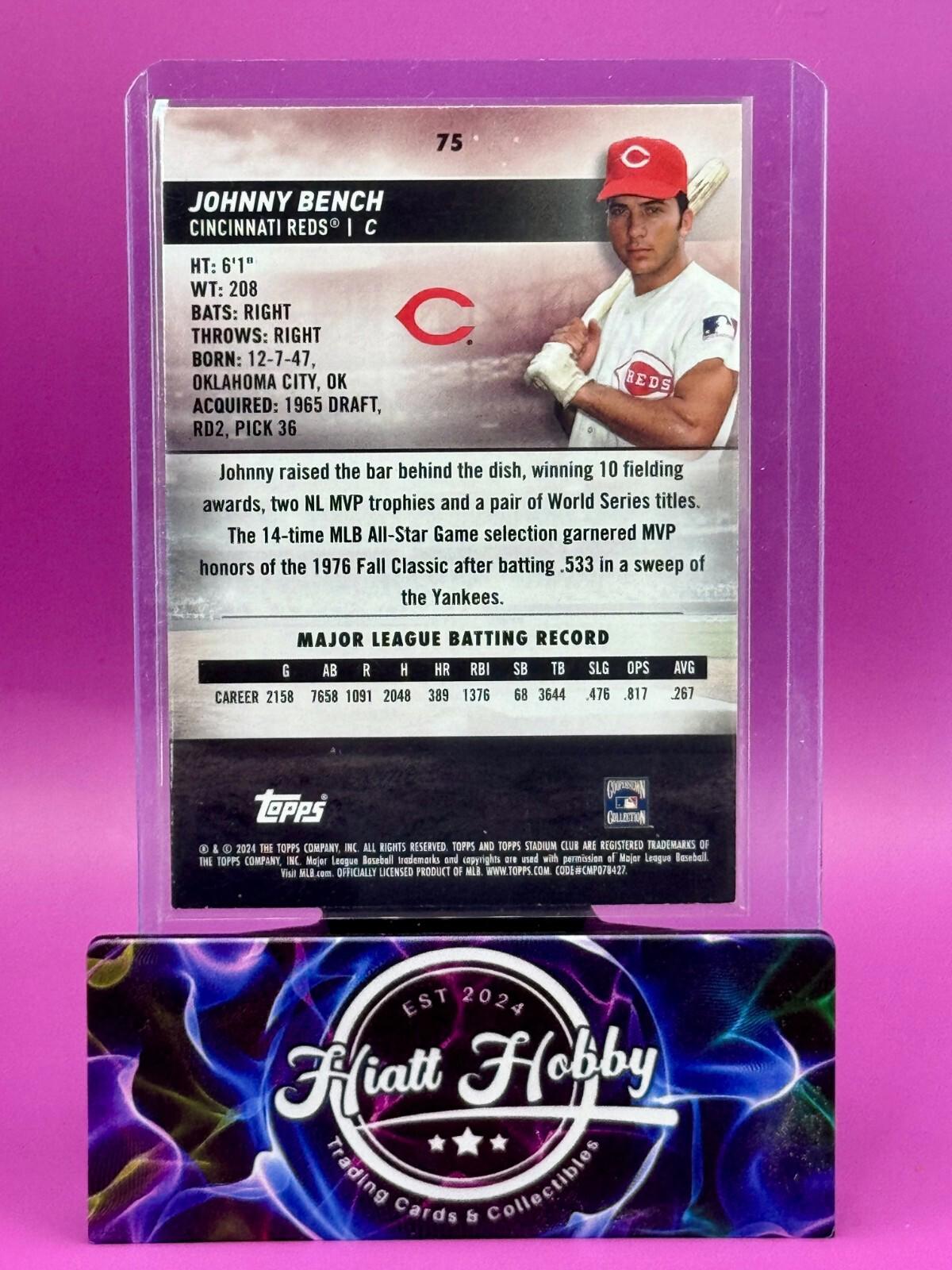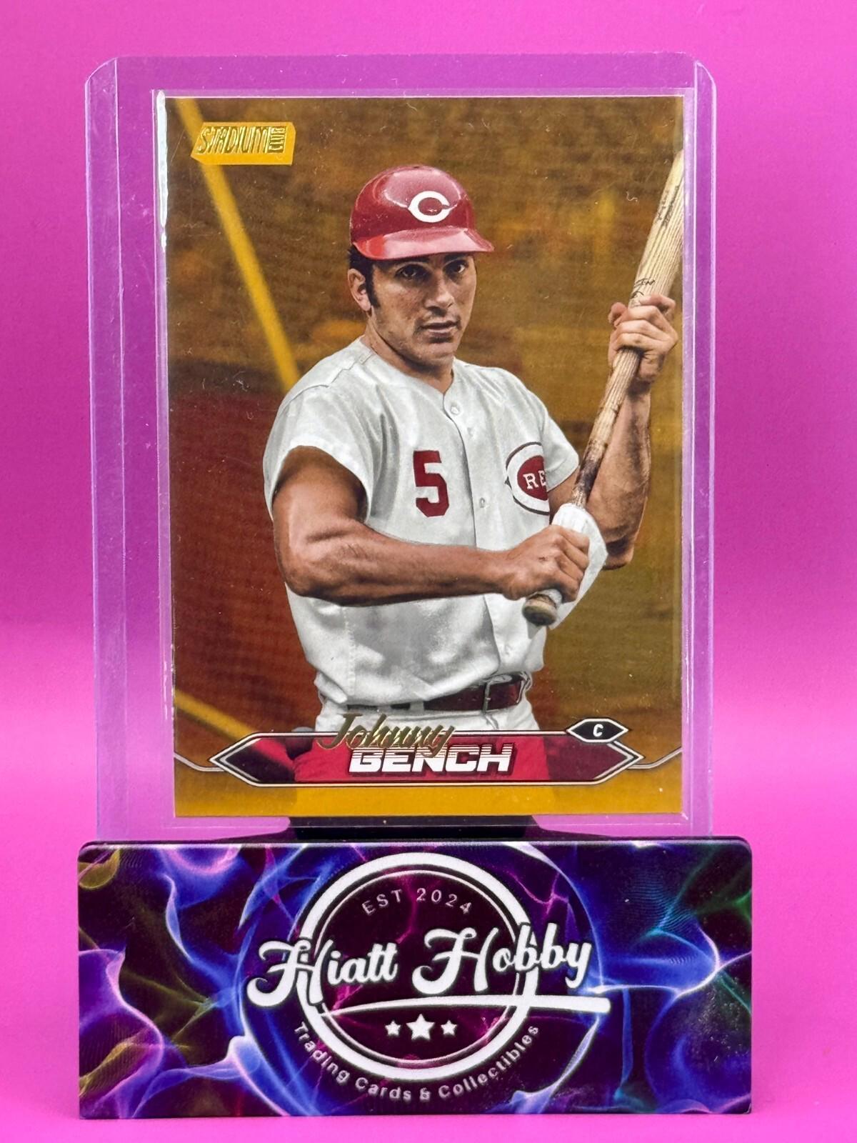 The product is a 2024 Topps Stadium Club baseball trading card featuring Johnny Bench of the Cincinnati Reds. This specific card is a Gold Foil Short Print variation, making it a parallel with a unique design. The card is an original release by Topps and is manufactured on standard card stock. It is not autographed but is part of the MLB World Series event, making it a valuable collectible for fans and collectors alike. The Gold Parallel can only be found in hobby packs at a rate of 1/hobby box.  Estimates suggest a print run of approximately 170 Please Read: SHIPPING SCHEDULE We make every attempt to ship your item out quickly.  Our standard shipping schedule is Tuesday, Thursday, and Saturday drops at the post office and we include all items that have been paid for up to 5PM central the day prior.  That is, all purchases that have been paid for by 5PM central on a Monday will be included in the Tuesday shipment.  If the payment is received after the 5PM deadline, it will be part of the Thursday order drop. SHIPPING DETAILS Cards and Magazines are shipped out in padded or rigid envelopes and/or inserts to protect the item.  Individual cards are typically are shipped in a semi rigid card protector and a penny sleeve.  Combined orders will be packaged securely, but may not have a semi-rigid card protector (item will still be well protected) . Larger items are boxed up properly. We cannot control the USPS or UPS when it comes to the timely delivery of an item, their methods and handling of the item. Please DO NOT hold us responsible for the efforts of a delivery service, however, if you suspect damage to the package, please take pictures prior to opening and record the opening.  This would help with any insurance claims and reimbursements. For orders Exceeding $100, a handling charge is added to offset the cost of insuring your purchase.  This fee will ensure that both parties are protected from loss or damage We offer eBay Standard Envelope Shipping for orders at or below $20.  If your order exceeds $20, you must select USPS Ground Advantage for shipping in order for the order to be processed. INTERNATIONAL SHIPPING Any orders outside of the United States are non-returnable. PICTURES For listings that do not have variations, the card depicted in the photo is the card you will receive.  In cases that the listing has variations, the card may not be the same, but each card is inspected to ensure the same level of condition. MULTIPLE PURCHASES When purchasing multiple item from us, please wait to discuss before paying.  We will combine shipping for you and try to save some money. RATINGS & FEEDBACK If you have an issue with something, please try and contact us first so that we may try and work it out. If we come to a satisfactory conclusion, please consider providing a favorable review and positive feedback. Thank you so much for any business that you do with us.