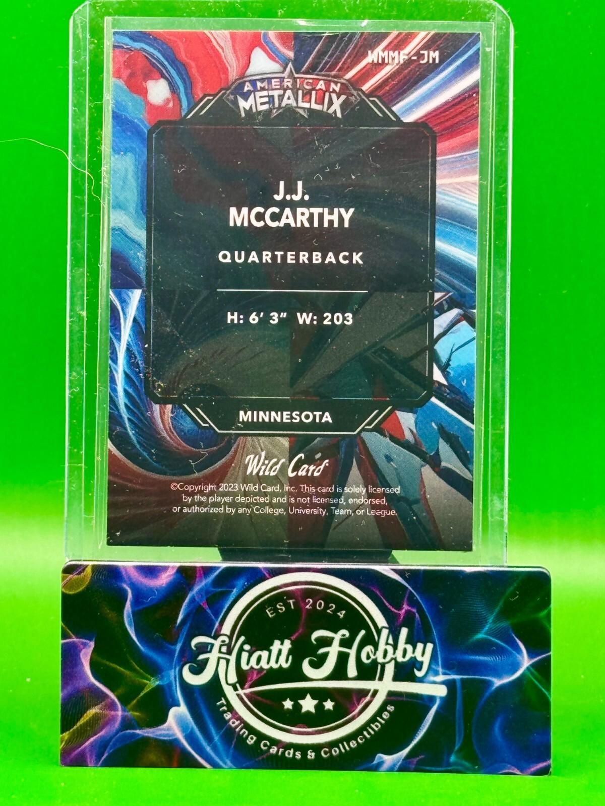 This 2024 Wild Card American Metallix sports trading card features J.J. McCarthy in his Michigan Wolverines and Minnesota Vikings days. The card is a one of a kind chase card with a blue mojo refractor finish. It is a standard sized card made of card stock material. The card is part of the WildMegaFractal insert set and is serial numbered WMMF-JM. It is in near mint or better condition and is an excellent addition to any football fan's collection. This card has not been autographed and is in English language. The card was manufactured in the United States and is a great collector's item for the 2024 NFL season.