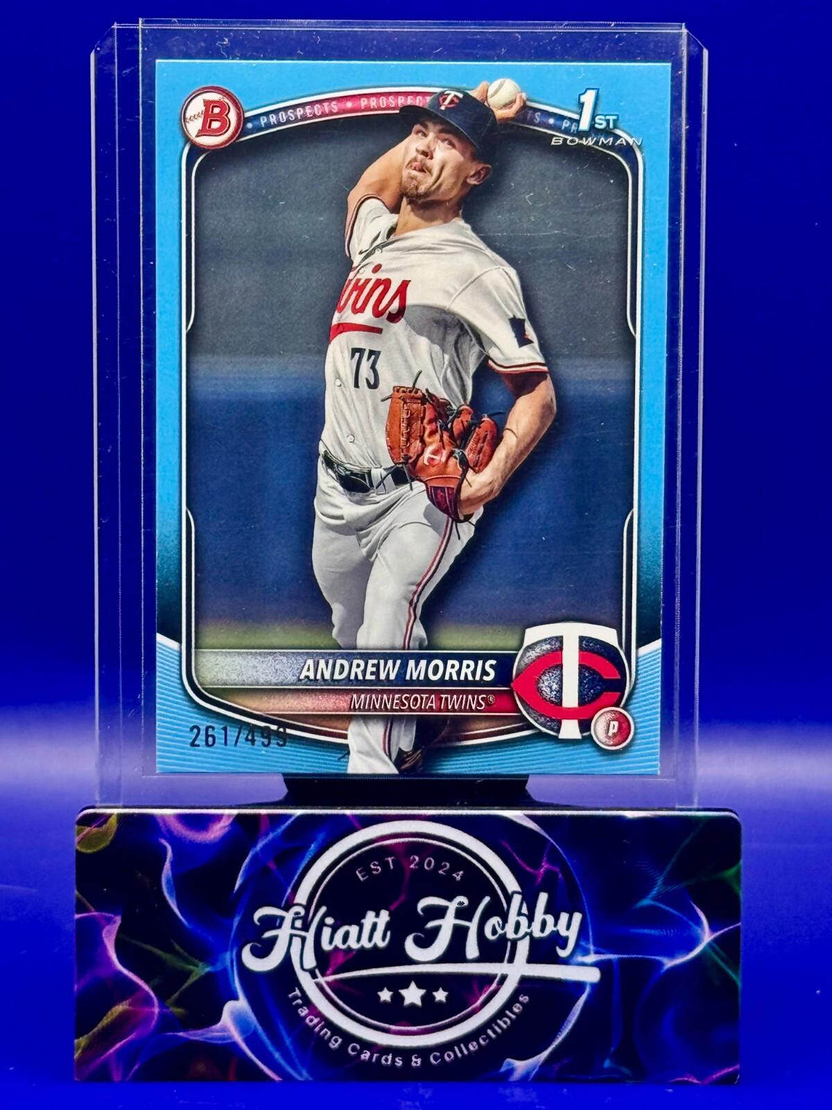 The 2025 Bowman Andrew Morris #BP-90 Blue Sky Border /499 (RC) is an original sports trading card featuring the rookie player from the Minnesota Twins. Manufactured by Topps, this limited edition card is part of the 2025 Bowman set and is serial numbered for authenticity. The sky blue border adds to the uniqueness of this collectible item, making it a desirable piece for baseball fans and collectors alike. Please Read: SHIPPING SCHEDULE We make every attempt to ship your item out quickly.  Our standard shipping schedule is Tuesday, Thursday, and Saturday drops at the post office and we include all items that have been paid for up to 5PM central the day prior.  That is, all purchases that have been paid for by 5PM central on a Monday will be included in the Tuesday shipment.  If the payment is received after the 5PM deadline, it will be part of the Thursday order drop. SHIPPING DETAILS Cards and Magazines are shipped out in padded or rigid envelopes and/or inserts to protect the item.  Individual cards are typically are shipped in a semi rigid card protector and a penny sleeve.  Combined orders will be packaged securely, but may not have a semi-rigid card protector (item will still be well protected) . Larger items are boxed up properly. We cannot control the USPS or UPS when it comes to the timely delivery of an item, their methods and handling of the item. Please DO NOT hold us responsible for the efforts of a delivery service, however, if you suspect damage to the package, please take pictures prior to opening and record the opening.  This would help with any insurance claims and reimbursements. For orders Exceeding $100, a handling charge is added to offset the cost of insuring your purchase.  This fee will ensure that both parties are protected from loss or damage We offer eBay Standard Envelope Shipping for orders at or below $20.  If your order exceeds $20, you must select USPS Ground Advantage for shipping in order for the order to be processed. INTERNATIONAL SHIPPING Any orders outside of the United States are non-returnable. PICTURES For listings that do not have variations, the card depicted in the photo is the card you will receive.  In cases that the listing has variations, the card may not be the same, but each card is inspected to ensure the same level of condition. MULTIPLE PURCHASES When purchasing multiple item from us, please wait to discuss before paying.  We will combine shipping for you and try to save some money. RATINGS & FEEDBACK If you have an issue with something, please try and contact us first so that we may try and work it out. If we come to a satisfactory conclusion, please consider providing a favorable review and positive feedback. Thank you so much for any business that you do with us.