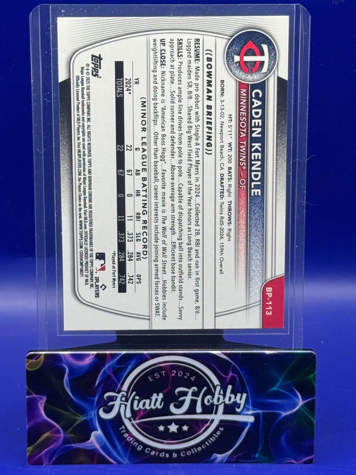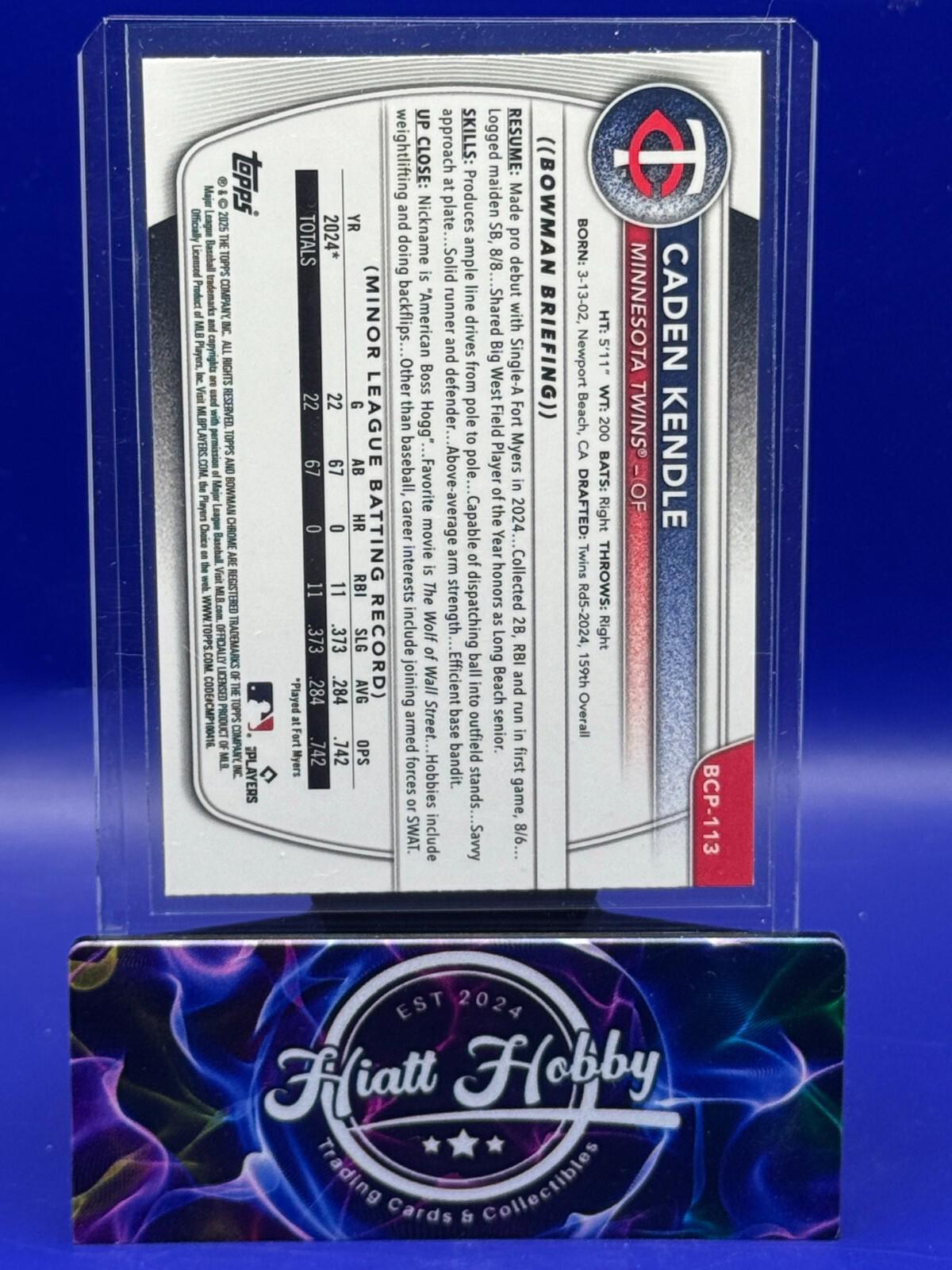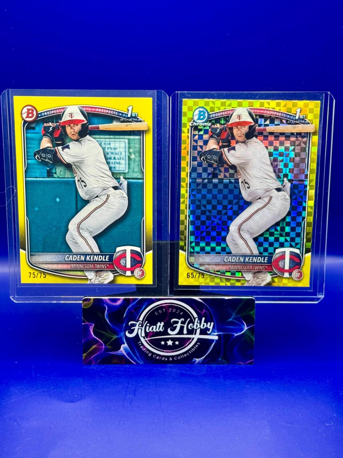 The product is a lot of 2 2025 Bowman trading cards featuring Caden Kendle, a player from the Minnesota Twins. These cards are from the Prospects insert set, with a limited print run of 75. The cards are standard in size, made of yellow paper and yellow X-fractor parallel versions, making them challenging to obtain. As serial numbered rookie cards, they are original releases from Topps for the 2025 MLB season. These collectible cards are a must-have for any baseball card enthusiast looking to add unique pieces to their collection.