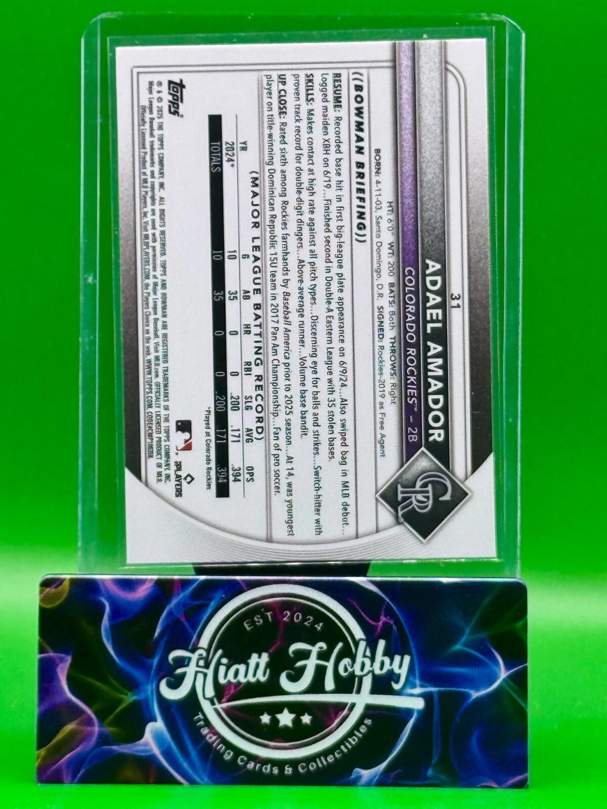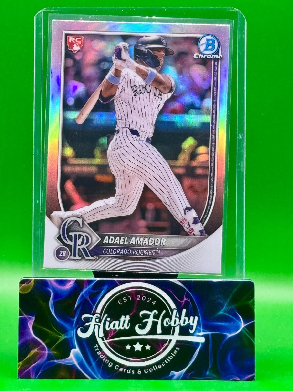 Up for sale is a 2025 Bowman Chrome sports trading card featuring Adael Amador of the Colorado Rockies. This Original rookie card is a Red RC Refractor and is in near mint or better condition. The card is part of the Major League Baseball World Series event/tournament and is manufactured by Topps in the United States. The card is chrome and has a standard card size. The card is not autographed and is in English. The card is a great addition to any baseball fan's collection.
