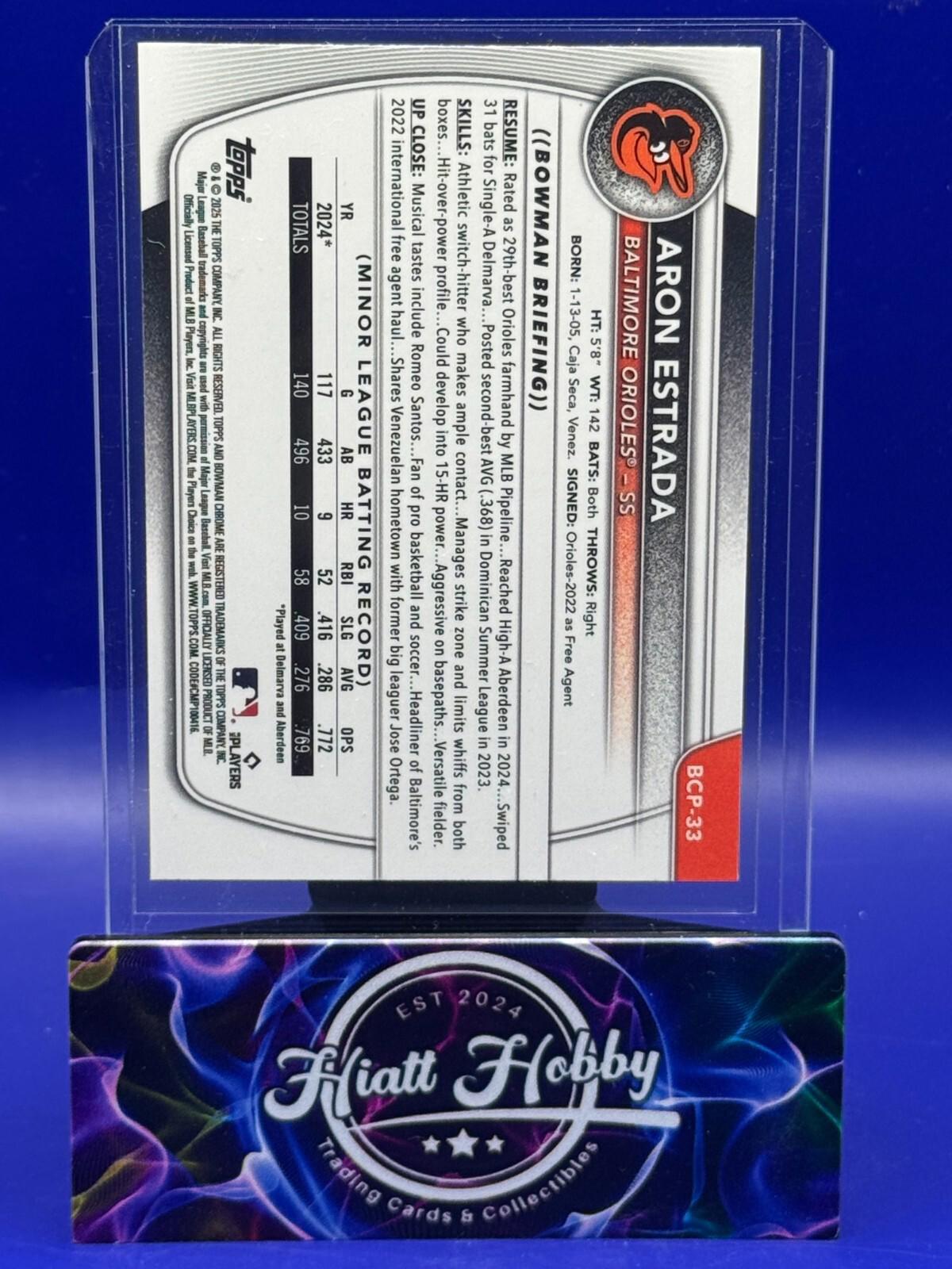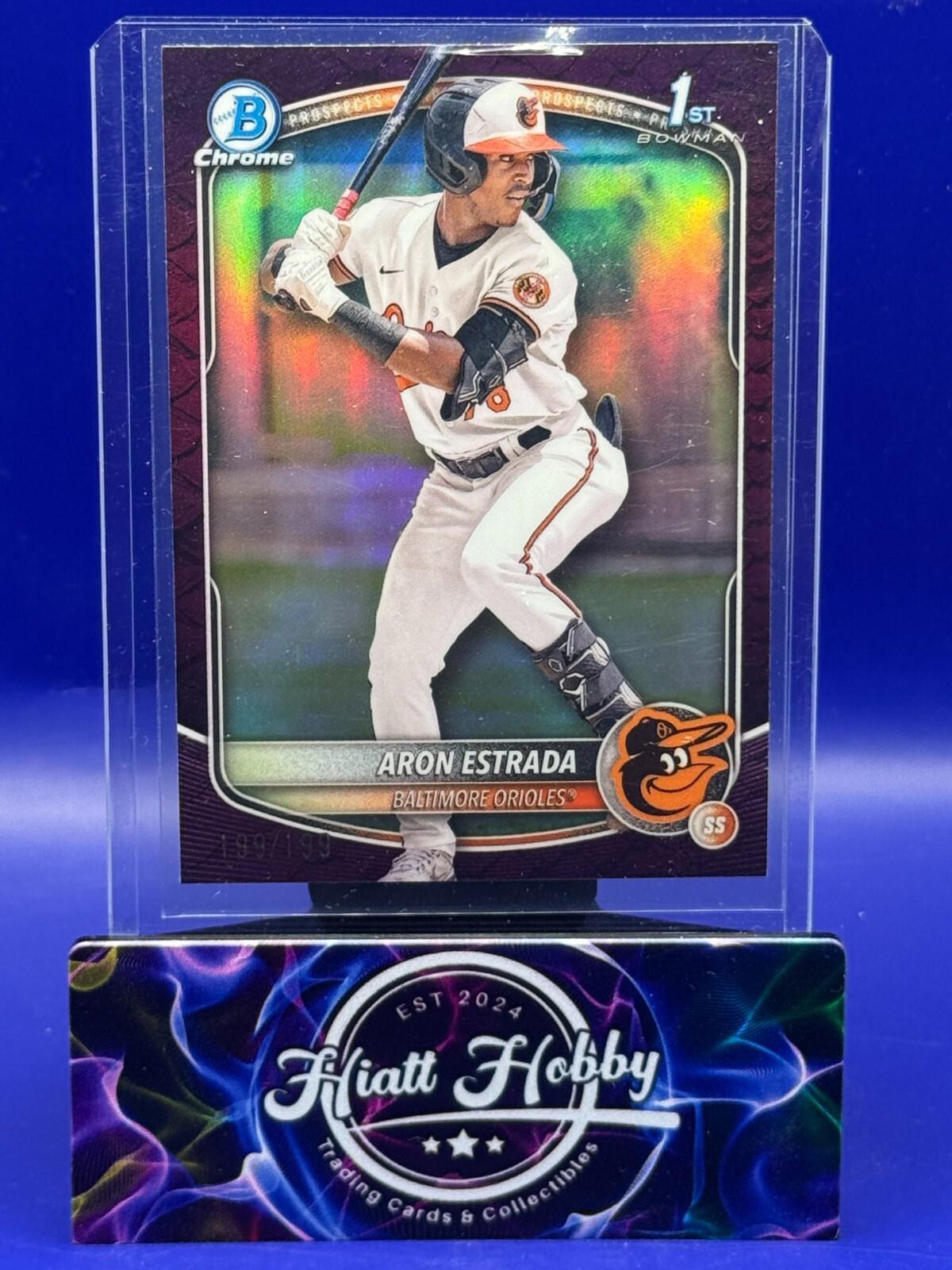 The 2025 Bowman Chrome Aron Estrada #BCP-33 Purple Reptillian 199/199 (RC) trading card is a limited edition collectible featuring the rookie player from the Baltimore Orioles. Produced by Topps, this original sports trading card is part of the Chrome Prospects set for Major League Baseball enthusiasts. The card is serial numbered and is the last on print. It comes in a refractor parallel variety, making it a valuable addition to any baseball card collection. With its unique design and low print run, this card is a sought-after item for fans of Aron Estrada and the MLB World Series.