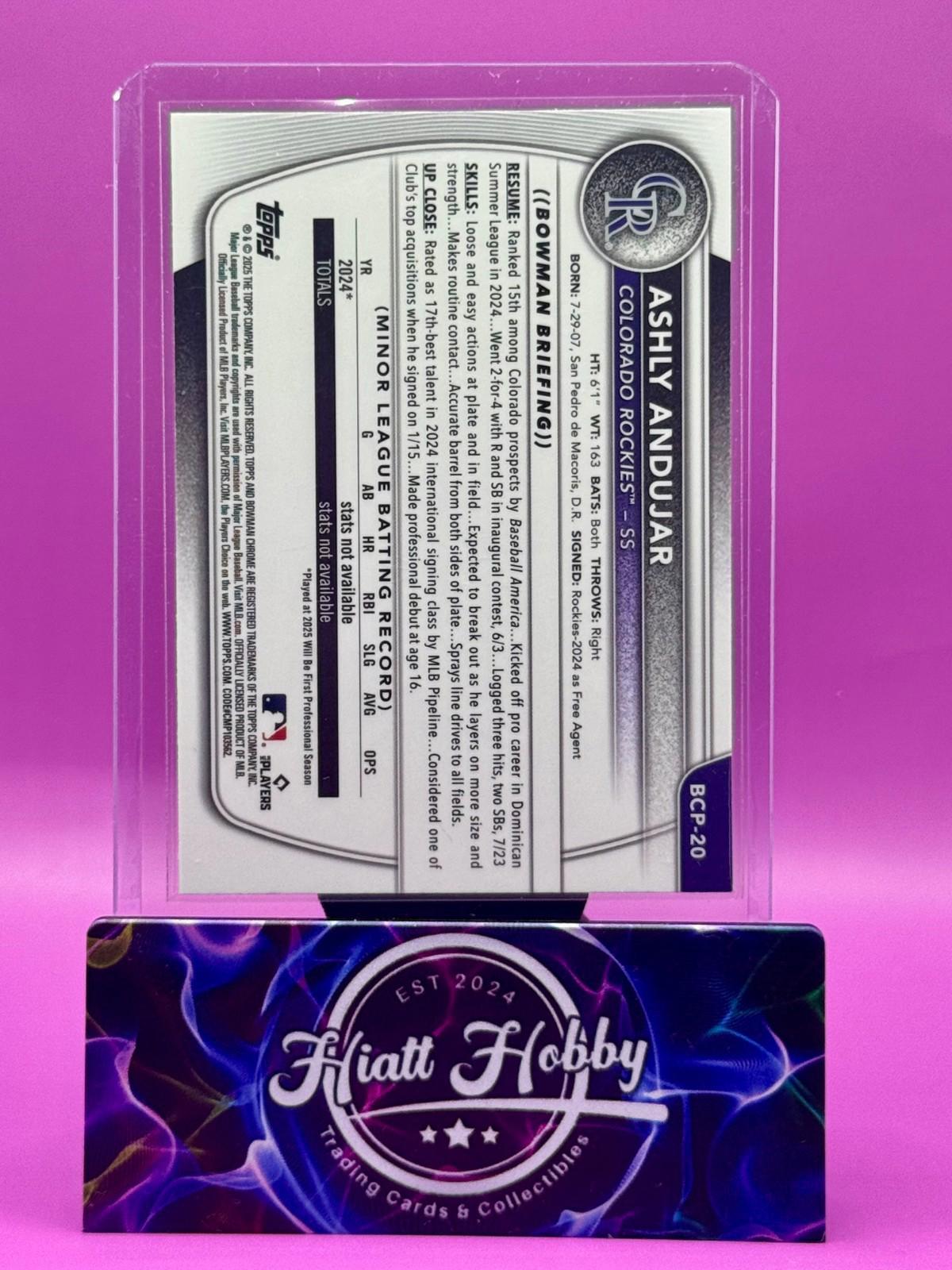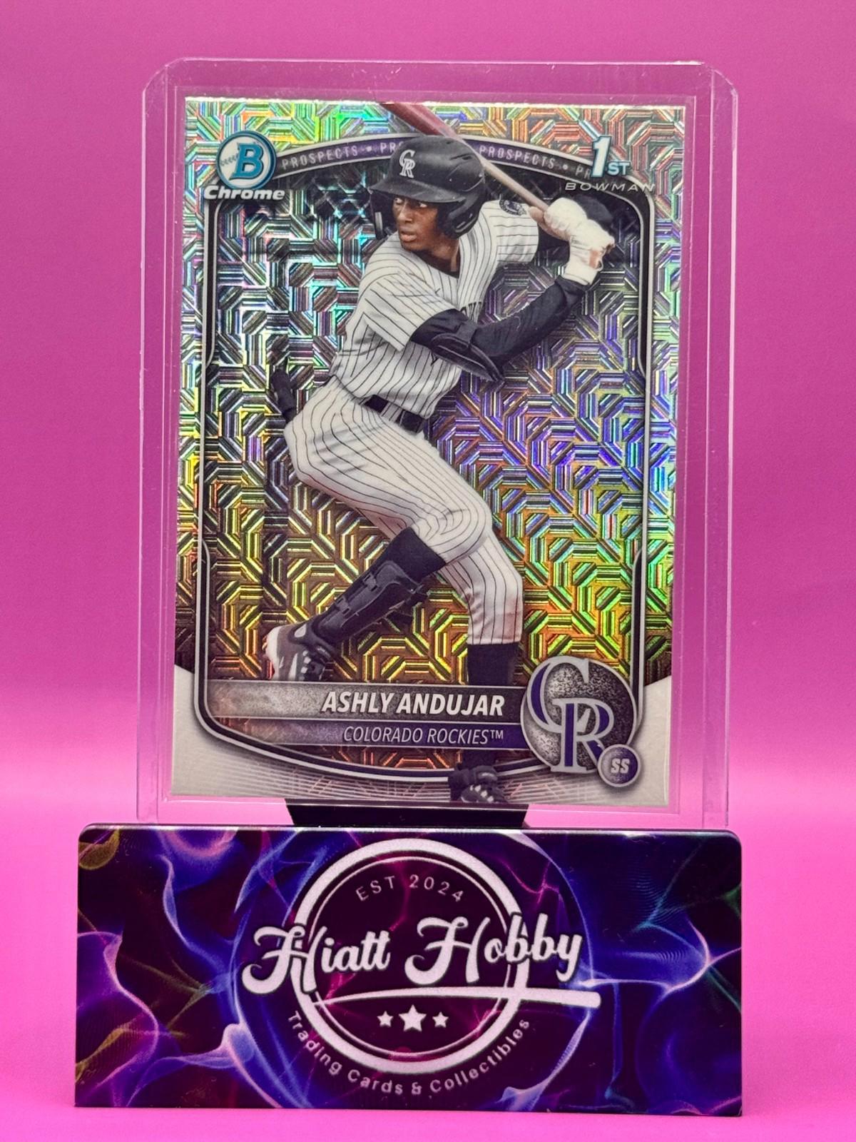 The 2025 Bowman Chrome Ashly Andujar #BCP-20 Mojo Refractor trading card is a highly sought-after collectible in baseball circles. Manufactured by Topps, this original card features a parallel variety design that sets it apart from the standard Bowman Chrome cards. With a focus on the Major League (MLB), this card showcases the young player from the Colorado Rockies and is a part of the Chrome Prospects insert set. While not autographed, this card is a valuable addition to any sports trading card collection, especially for fans of the MLB World Series and baseball enthusiasts. Please Read: SHIPPING SCHEDULE We make every attempt to ship your item out quickly.  Our standard shipping schedule is Tuesday, Thursday, and Saturday drops at the post office and we include all items that have been paid for up to 5PM central the day prior.  That is, all purchases that have been paid for by 5PM central on a Monday will be included in the Tuesday shipment.  If the payment is received after the 5PM deadline, it will be part of the Thursday order drop. SHIPPING DETAILS Cards and Magazines are shipped out in padded or rigid envelopes and/or inserts to protect the item.  Individual cards are typically are shipped in a semi rigid card protector and a penny sleeve.  Combined orders will be packaged securely, but may not have a semi-rigid card protector (item will still be well protected) . Larger items are boxed up properly. We cannot control the USPS or UPS when it comes to the timely delivery of an item, their methods and handling of the item. Please DO NOT hold us responsible for the efforts of a delivery service, however, if you suspect damage to the package, please take pictures prior to opening and record the opening.  This would help with any insurance claims and reimbursements. We offer eBay Standard Envelope Shipping for orders at or below $20.  If your order exceeds $20, you must select USPS Ground Advantage for shipping in order for the order to be processed. SHIPPING INSURANCE Any Items that exceed $100 will include additional handling charges.  This fee is to cover the cost of insuring the item during transit. INTERNATIONAL SHIPPING We are pleased to now offer international shipping! PICTURES All photos are of the item you are bidding on when bidding on single item listings and will not be swapped out for other versions. Items that have multiple quantities will be in similar or better condition. PICTURES For listings that do not have variations, the card depicted in the photo is the card you will receive.  In cases that the listing has variations, the card may not be the same, but each card is inspected to ensure the same level of condition. MULTIPLE PURCHASES When purchasing multiple item from us, please wait to discuss before paying.  We will combine shipping for you and try to save some money. RATINGS & FEEDBACK If you have an issue with something, please try and contact us first so that we may try and work it out. If we come to a satisfactory conclusion, please consider providing a favorable review and positive feedback. Thank you so much for any business that you do with us.