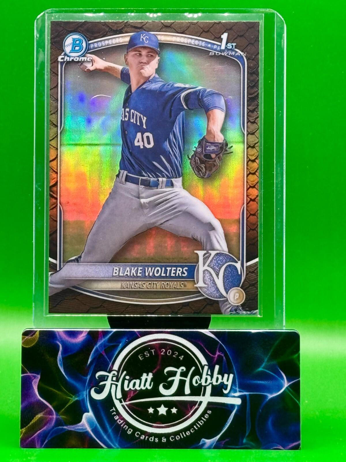 This 2025 Bowman Chrome sports trading card features Blake Wolters, a rookie player for the Kansas City Royals. The card is an original licensed reprint and is part of the Reptillian Refractor parallel/variety set. It is in near mint or better condition and is graded via the original listing. The card is in English language and is manufactured in the United States. The MLB World Series event/tournament is also mentioned in the description. This card is a great addition to any baseball fan's collection. Please Read: SHIPPING SCHEDULE We make every attempt to ship your item out quickly.  Our standard shipping schedule is Tuesday, Thursday, and Saturday drops at the post office and we include all items that have been paid for up to 5PM central the day prior.  That is, all purchases that have been paid for by 5PM central on a Monday will be included in the Tuesday shipment.  If the payment is received after the 5PM deadline, it will be part of the Thursday order drop. SHIPPING DETAILS Cards and Magazines are shipped out in padded or rigid envelopes and/or inserts to protect the item.  Individual cards are typically are shipped in a semi rigid card protector and a penny sleeve.  Combined orders will be packaged securely, but may not have a semi-rigid card protector (item will still be well protected) . Larger items are boxed up properly. We cannot control the USPS or UPS when it comes to the timely delivery of an item, their methods and handling of the item. Please DO NOT hold us responsible for the efforts of a delivery service, however, if you suspect damage to the package, please take pictures prior to opening and record the opening.  This would help with any insurance claims and reimbursements. For orders Exceeding $100, a handling charge is added to offset the cost of insuring your purchase.  This fee will ensure that both parties are protected from loss or damage We offer eBay Standard Envelope Shipping for orders at or below $20.  If your order exceeds $20, you must select USPS Ground Advantage for shipping in order for the order to be processed. INTERNATIONAL SHIPPING We are not offering international shipping at this time. PICTURES All photos are of the item you are bidding on.  Your item will not be swapped out for a similar item. MULTIPLE PURCHASES When purchasing multiple item from us, please wait to discuss before paying.  We will combine shipping for you and try to save some money. RATINGS & FEEDBACK If you have an issue with something, please try and contact us first so that we may try and work it out. If we come to a satisfactory conclusion, please consider providing a favorable review and positive feedback. Thank you so much for any business that you do with us.