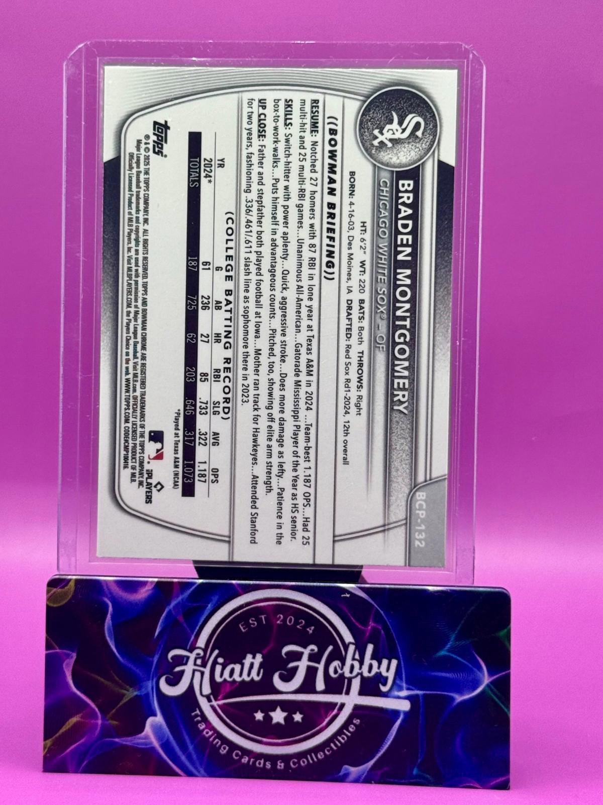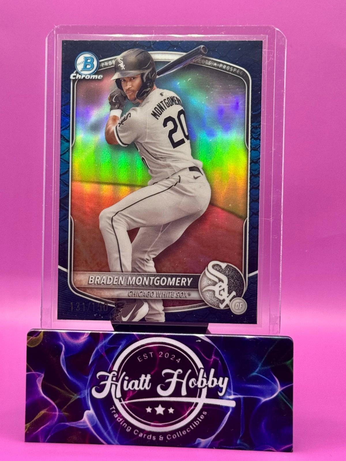 The product is a 2025 Bowman Chrome baseball trading card featuring Braden Montgomery from the Chicago White Sox. This particular card is a Blue Reptilian parallel with a limited print run of only 150. It is part of the Chrome Prospects insert set and is labeled as a rookie card. The card is original and manufactured by Topps, making it a valuable addition to any sports card collection, especially for fans of the MLB World Series.