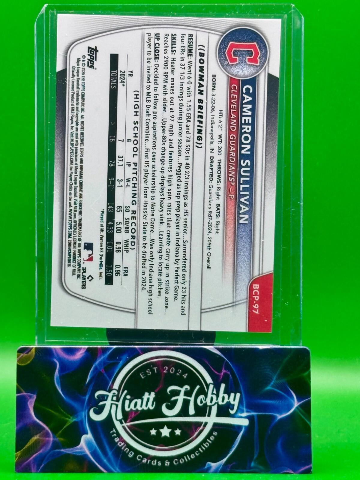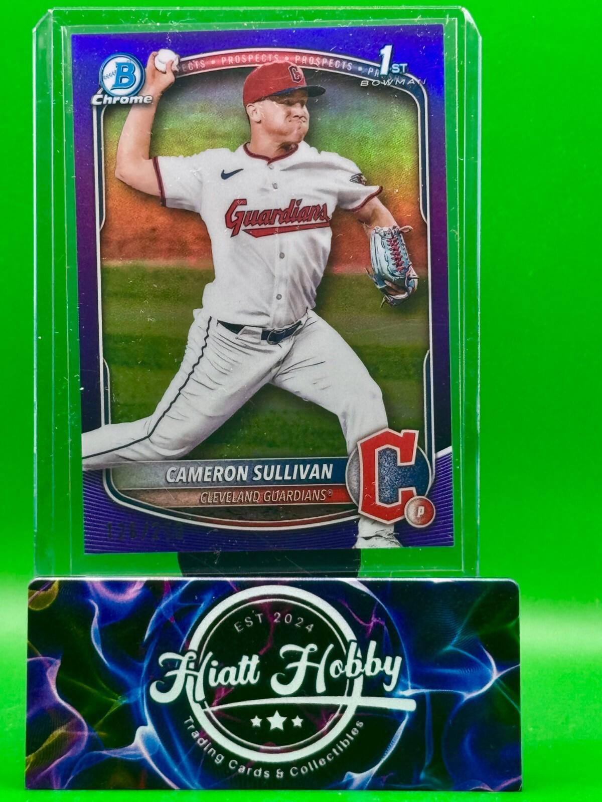 Elevate your baseball card collection with the 2025 Bowman Chrome Cameron Sullivan #BCP-97 card, a must-have for fans and collectors alike. This True Purple Refractor card, limited to a print run of just 250, captures the essence of the promising Cleveland Guardians' talent. With its sleek Chrome finish and standard card stock material, it's a durable and visually stunning piece that celebrates the MLB World Series season.Crafted by Topps, a trusted name in sports memorabilia, this card boasts the sought-after features of a serial number, rookie status, and parallel variety, making it a standout addition. The card is original, not autographed, and presented in English. Collectors will appreciate the detail and quality that reflect the excellence of Cameron Sullivan and the Guardians' organization.