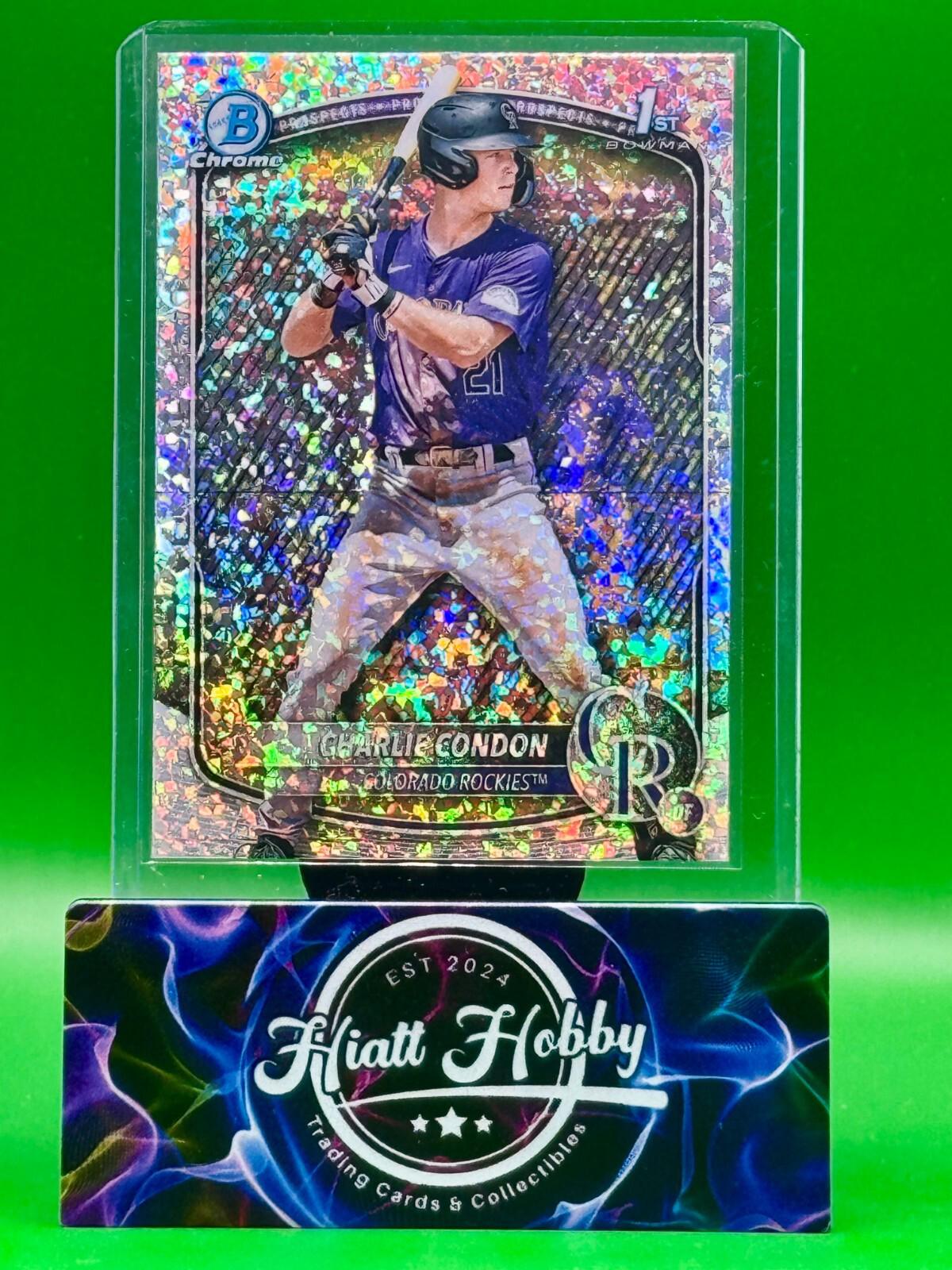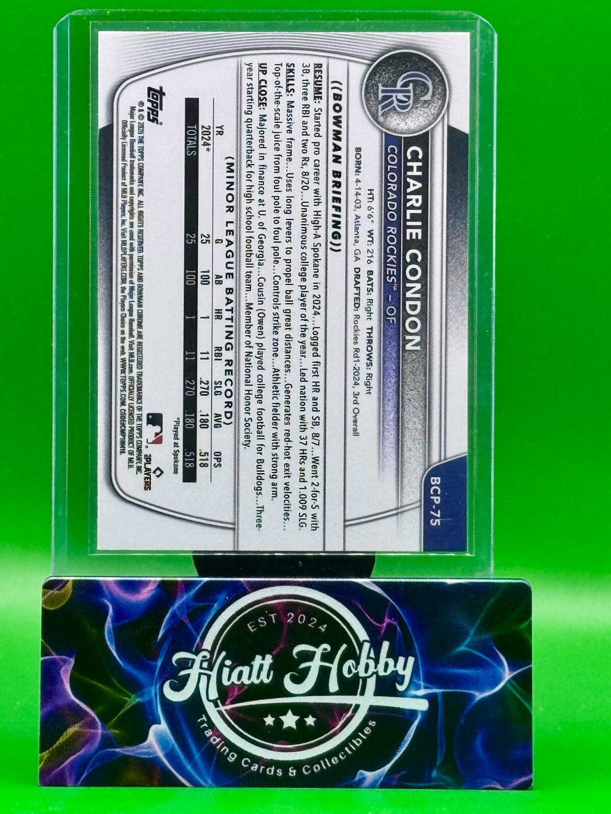 Enhance your baseball card collection with the 2025 Bowman Chrome - Charlie Condon #BCP-75 Mini Diamond Refractor card. This standard-sized card is a brilliant addition for fans of the Colorado Rockies and those who admire the craftsmanship of Topps. The card showcases rookie Charlie Condon in all his athletic glory, capturing the essence of his debut season in the Major League Baseball.The Mini-Diamond Refractor parallel variety adds an extra layer of shine and appeal to this collectible. It's part of the 2025 Bowman Chrome set, a series known for its quality and collectibility. Manufactured in the United States, this card is an original release, ensuring its authenticity. It's a must-have for collectors and enthusiasts looking to commemorate the MLB World Series event and the rising stars of baseball.