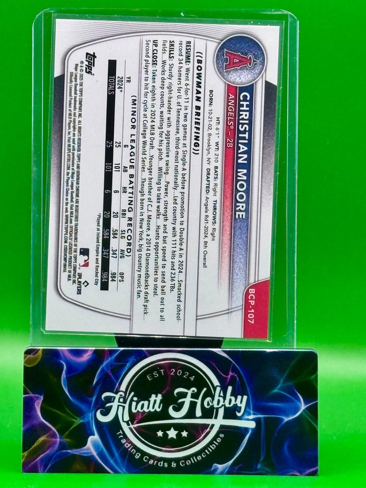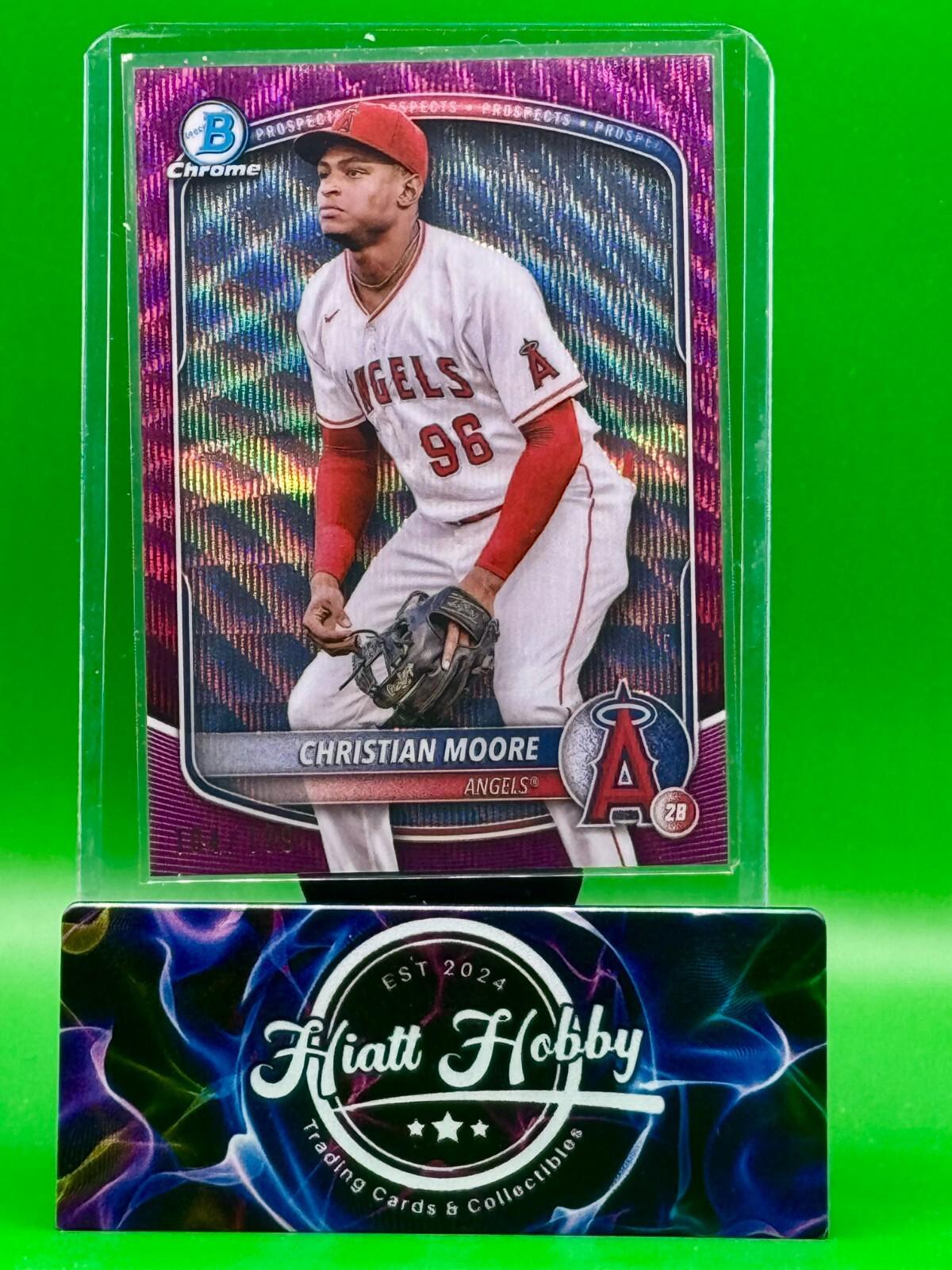 This 2025 Bowman Chrome sports trading card features Christian Moore of the Los Angeles Angels in the Major League (MLB). The card is part of the Bowman Chrome set and has a purple wave parallel/variety. It is serial numbered and has a print run of 199. The card is an original and has not been autographed. It was manufactured by Topps in the United States and features Christian Moore in his rookie season. The card is in near mint or better condition and is a great addition to any baseball fan's collection. Please Read: SHIPPING SCHEDULE We make every attempt to ship your item out quickly.  Our standard shipping schedule is Tuesday, Thursday, and Saturday drops at the post office and we include all items that have been paid for up to 5PM central the day prior.  That is, all purchases that have been paid for by 5PM central on a Monday will be included in the Tuesday shipment.  If the payment is received after the 5PM deadline, it will be part of the Thursday order drop. SHIPPING DETAILS Cards and Magazines are shipped out in padded or rigid envelopes and/or inserts to protect the item.  Individual cards are typically are shipped in a semi rigid card protector and a penny sleeve.  Combined orders will be packaged securely, but may not have a semi-rigid card protector (item will still be well protected) . Larger items are boxed up properly. We cannot control the USPS or UPS when it comes to the timely delivery of an item, their methods and handling of the item. Please DO NOT hold us responsible for the efforts of a delivery service, however, if you suspect damage to the package, please take pictures prior to opening and record the opening.  This would help with any insurance claims and reimbursements. For orders Exceeding $100, a handling charge is added to offset the cost of insuring your purchase.  This fee will ensure that both parties are protected from loss or damage We offer eBay Standard Envelope Shipping for orders at or below $20.  If your order exceeds $20, you must select USPS Ground Advantage for shipping in order for the order to be processed. INTERNATIONAL SHIPPING We are not offering international shipping at this time. PICTURES All photos are of the item you are bidding on.  Your item will not be swapped out for a similar item. MULTIPLE PURCHASES When purchasing multiple item from us, please wait to discuss before paying.  We will combine shipping for you and try to save some money. RATINGS & FEEDBACK If you have an issue with something, please try and contact us first so that we may try and work it out. If we come to a satisfactory conclusion, please consider providing a favorable review and positive feedback. Thank you so much for any business that you do with us.