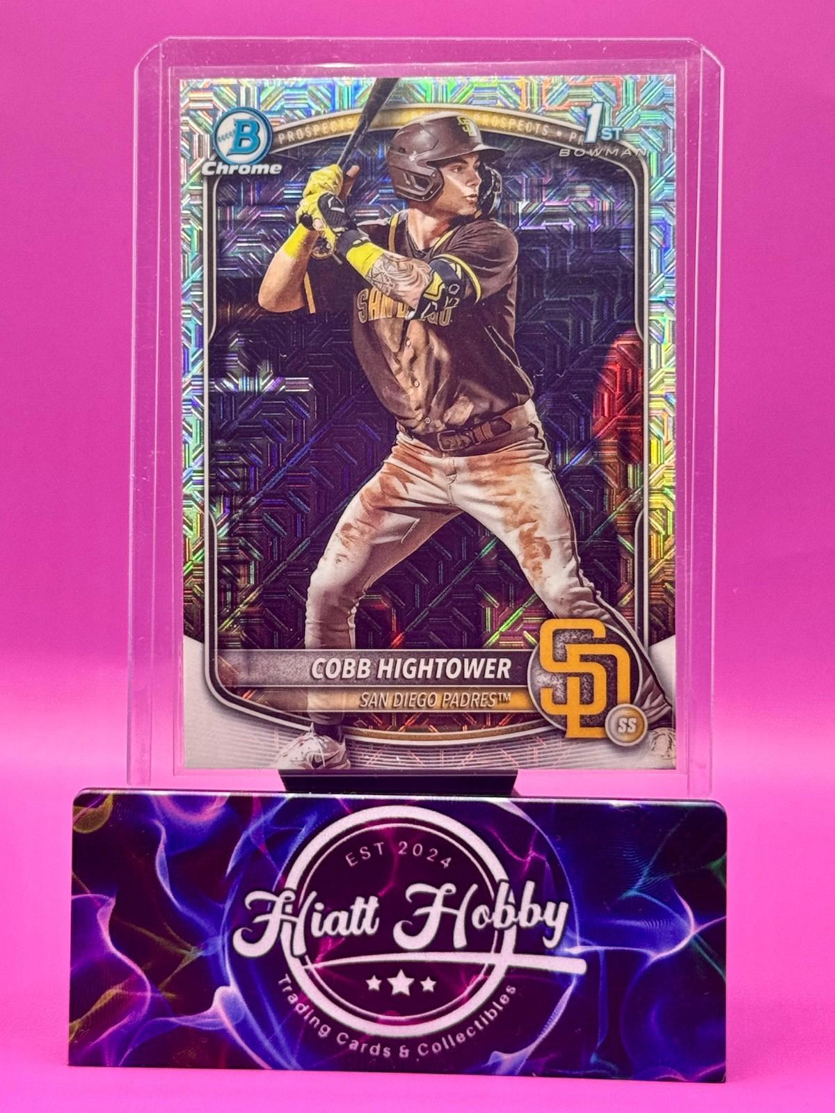 The 2025 Bowman Chrome Cobb Hightower #BCP-104 Mojo Refractor trading card is a highly sought-after collectible in the sports memorabilia market. This baseball card features a vibrant Mojo Refractor design and belongs to the Chrome Prospects insert set from Topps. The card showcases the young player from the San Diego Padres, Cobb Hightower, making it a valuable addition to any MLB fan's collection. With its unique design and limited availability, this card is sure to stand out in any baseball card collection. Please Read: SHIPPING SCHEDULE We make every attempt to ship your item out quickly.  Our standard shipping schedule is Tuesday, Thursday, and Saturday drops at the post office and we include all items that have been paid for up to 5PM central the day prior.  That is, all purchases that have been paid for by 5PM central on a Monday will be included in the Tuesday shipment.  If the payment is received after the 5PM deadline, it will be part of the Thursday order drop. SHIPPING DETAILS Cards and Magazines are shipped out in padded or rigid envelopes and/or inserts to protect the item.  Individual cards are typically are shipped in a semi rigid card protector and a penny sleeve.  Combined orders will be packaged securely, but may not have a semi-rigid card protector (item will still be well protected) . Larger items are boxed up properly. We cannot control the USPS or UPS when it comes to the timely delivery of an item, their methods and handling of the item. Please DO NOT hold us responsible for the efforts of a delivery service, however, if you suspect damage to the package, please take pictures prior to opening and record the opening.  This would help with any insurance claims and reimbursements. We offer eBay Standard Envelope Shipping for orders at or below $20.  If your order exceeds $20, you must select USPS Ground Advantage for shipping in order for the order to be processed. SHIPPING INSURANCE Any Items that exceed $100 will include additional handling charges.  This fee is to cover the cost of insuring the item during transit. INTERNATIONAL SHIPPING We are pleased to now offer international shipping! PICTURES All photos are of the item you are bidding on when bidding on single item listings and will not be swapped out for other versions. Items that have multiple quantities will be in similar or better condition. PICTURES For listings that do not have variations, the card depicted in the photo is the card you will receive.  In cases that the listing has variations, the card may not be the same, but each card is inspected to ensure the same level of condition. MULTIPLE PURCHASES When purchasing multiple item from us, please wait to discuss before paying.  We will combine shipping for you and try to save some money. RATINGS & FEEDBACK If you have an issue with something, please try and contact us first so that we may try and work it out. If we come to a satisfactory conclusion, please consider providing a favorable review and positive feedback. Thank you so much for any business that you do with us.