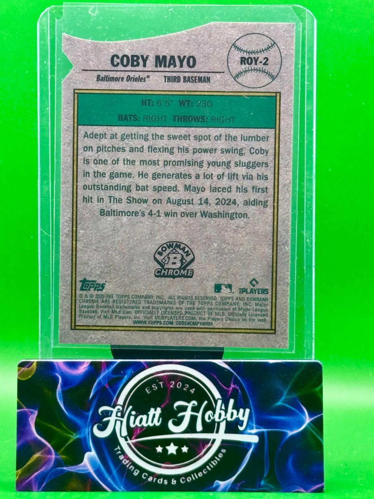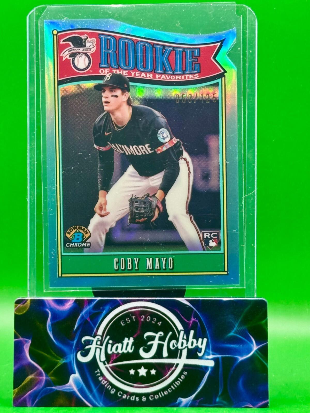 Explore your passion for baseball with the 2025 Bowman Chrome Coby Mayo #ROY-2 card from Rookie of the Year Favorites. This Aqua Refractor card, limited to a print run of 125, is a must-have collectible for fans and collectors alike. It features Coby Mayo, a promising talent for the Baltimore Orioles, captured in stunning detail on premium card stock.The card is a non-autographed original, part of the Major League Baseball series, and exhibits a sleek Aqua parallel variety that adds a unique touch to your collection. Celebrate the thrill of the MLB World Series and add a piece of baseball history to your collection with this ROY-2 card, manufactured in the United States with English language specifics.