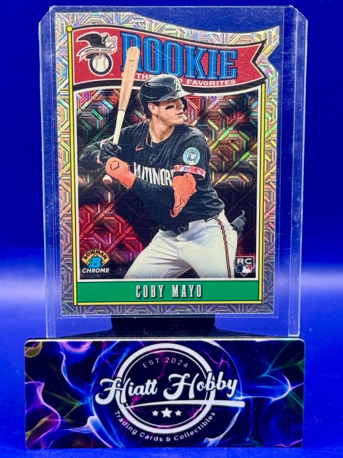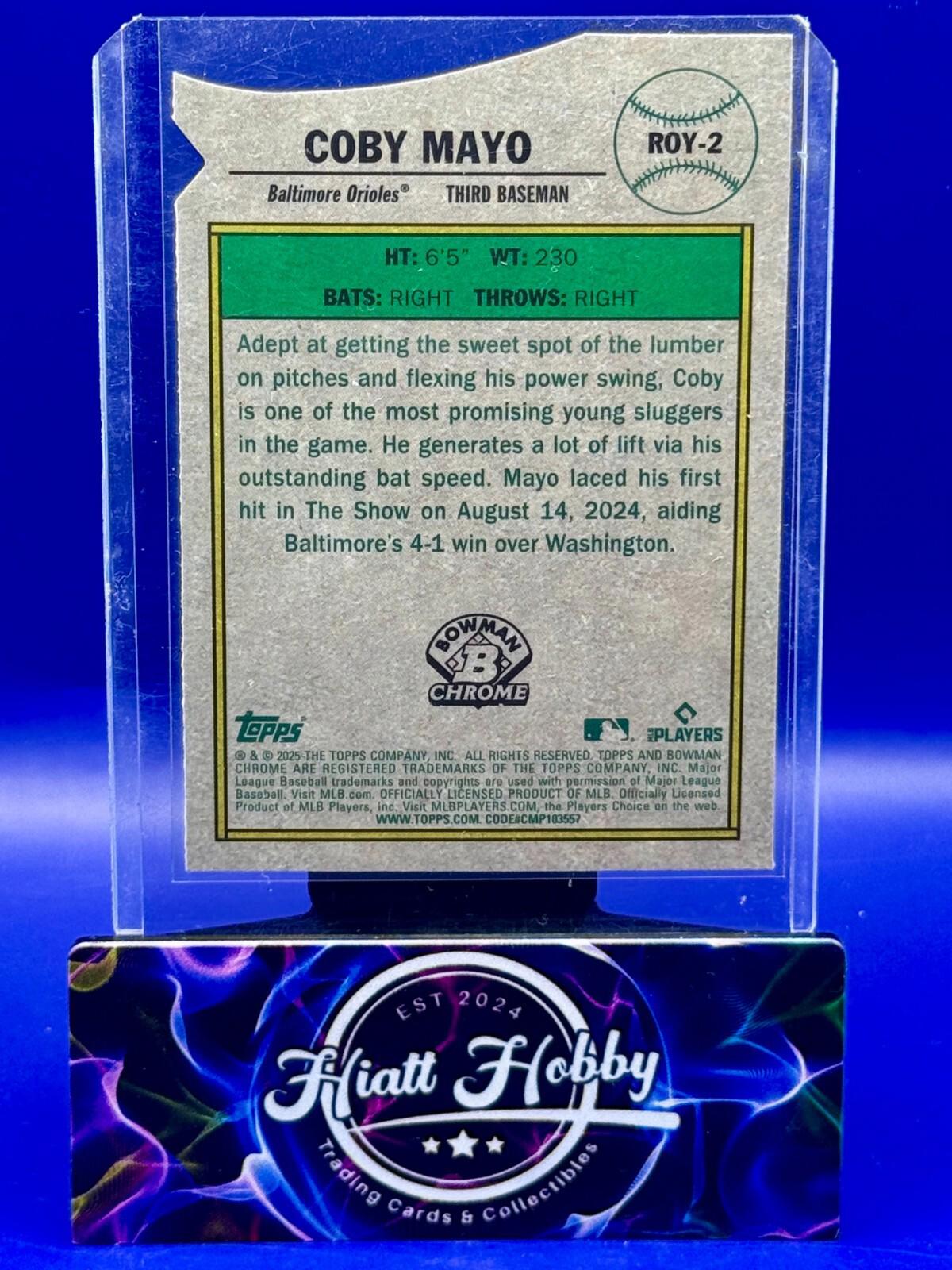 The product is a 2025 Bowman Chrome baseball trading card featuring Coby Mayo of the Baltimore Orioles. This card is part of the Rookie of the Year Favorites insert set and is a Mojo Refractor parallel variety. It is an original card manufactured by Topps in the United States, with a standard size and 35 Pt. card thickness. The card is not autographed and is in English language, catering to fans of Major League Baseball and collectors of sports trading cards.