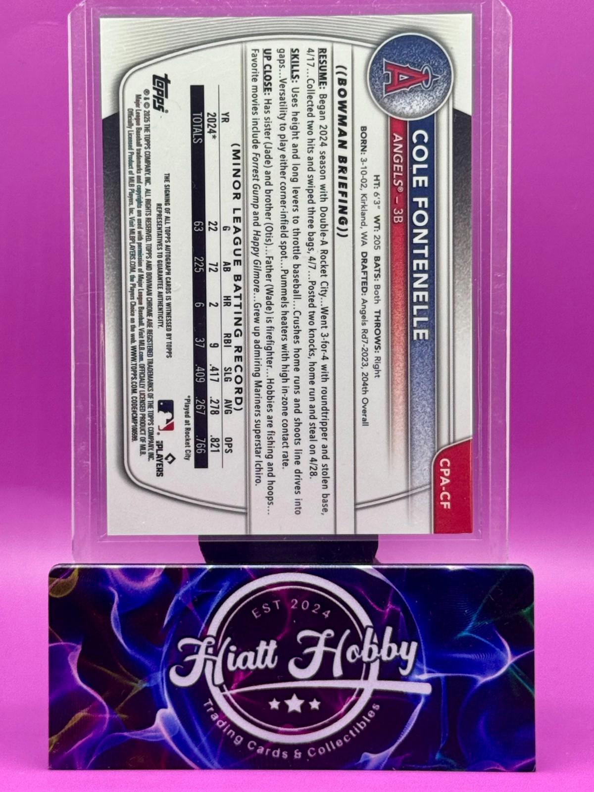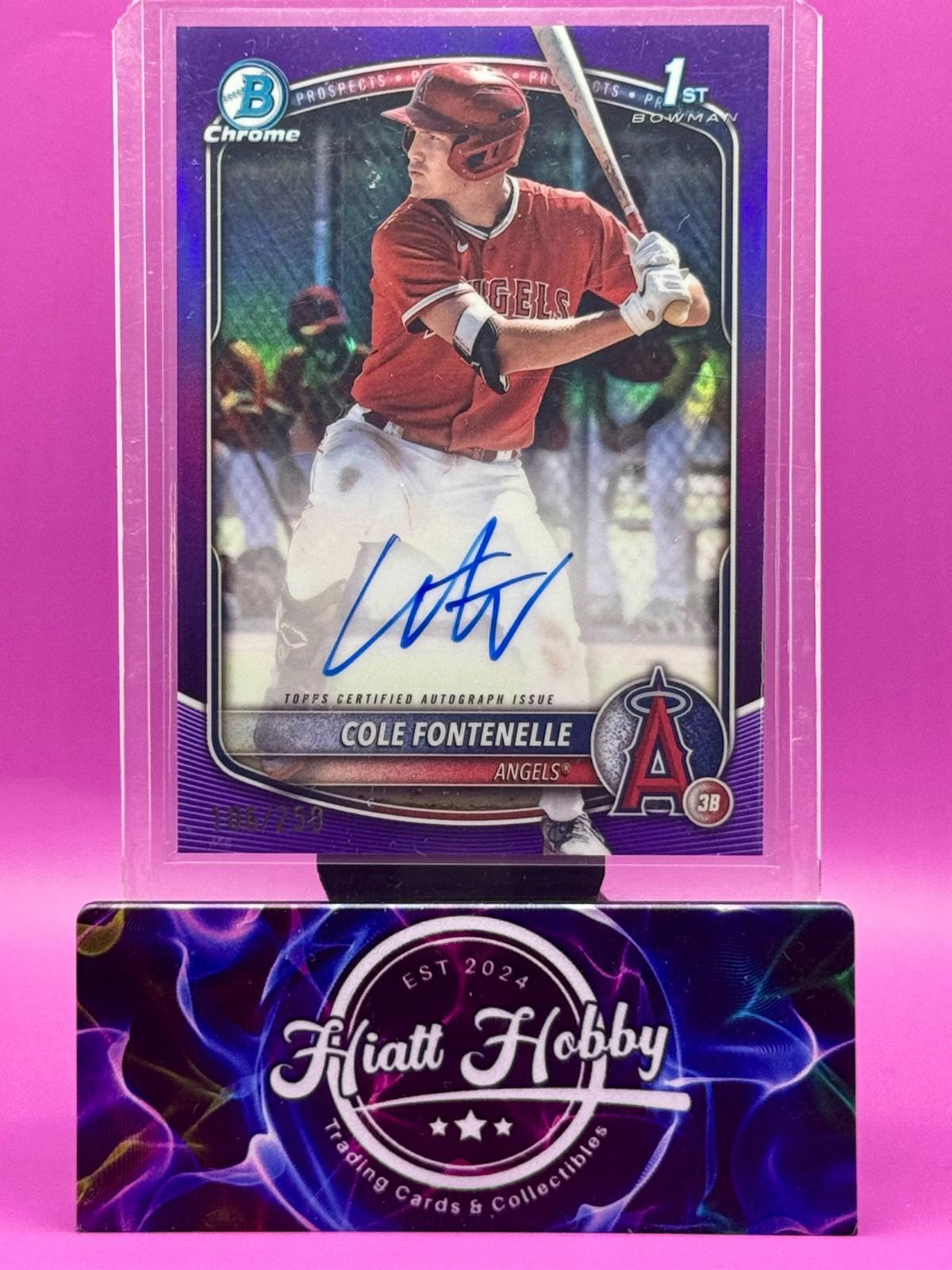 The product is a 2025 Bowman Chrome baseball trading card featuring Cole Fontenelle of the Los Angeles Angels. This particular card is a Purple Refractor parallel, autographed by Fontenelle, and numbered out of 250. It is a rookie card from the Chrome Prospect Autographs insert set, authenticated by Topps, and made of card stock. This collectible item is a valuable addition for fans and collectors of MLB memorabilia, especially those interested in emerging players like Fontenelle.