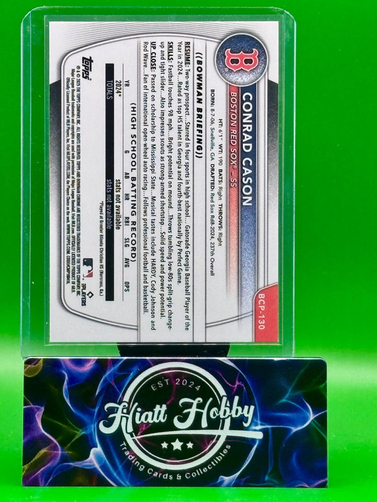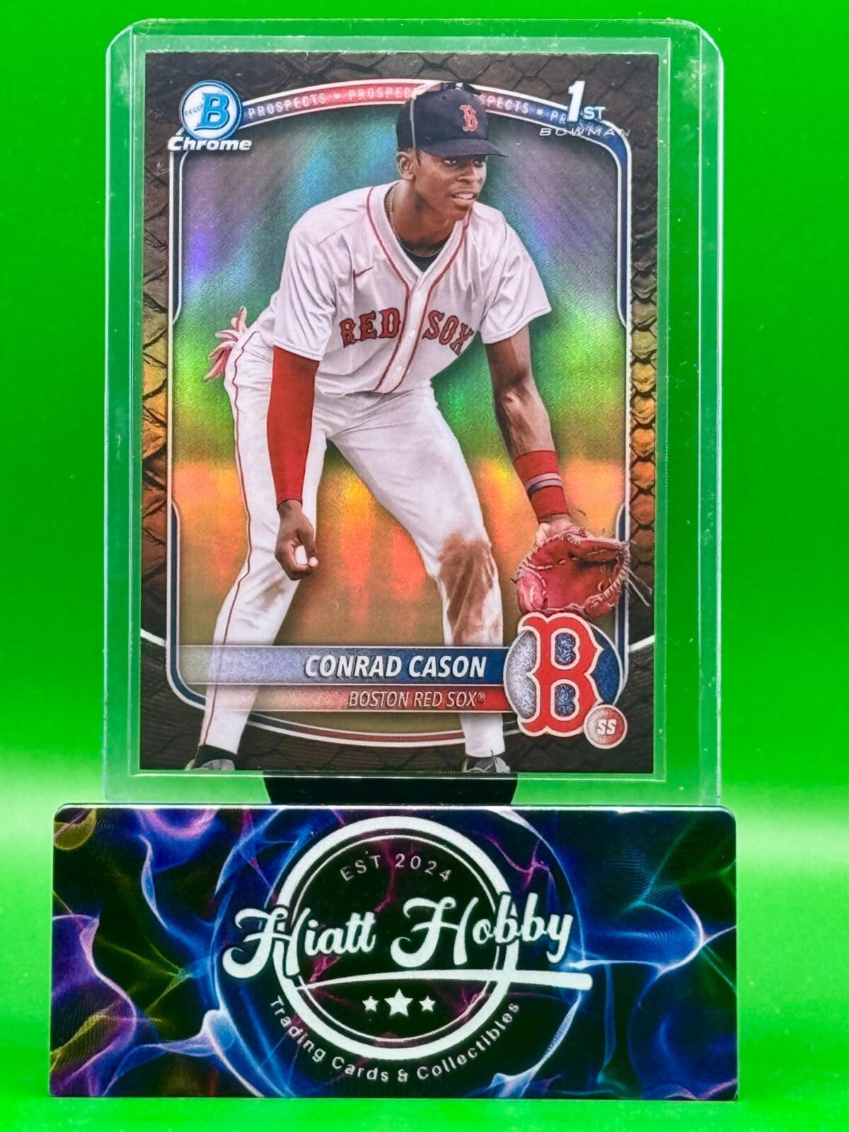 2025 Bowman Chrome offers a striking Conrad Cason #BCP-130 card, featuring the Reptillian Refractor parallel that will captivate collectors and fans alike. This card showcases the Boston Red Sox's promising talent in a design that's both visually appealing and unique, reflecting the excitement of the MLB World Series event.Crafted with quality in the United States, this sports trading card is a must-have for baseball enthusiasts and collectors. Not autographed, this original rookie card is a celebration of the 2025 MLB season and a tribute to the skill and potential of player Conrad Cason. Add this piece of baseball memorabilia to your collection and own a piece of the sport's history.