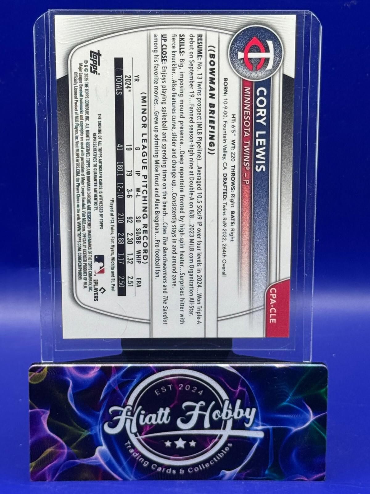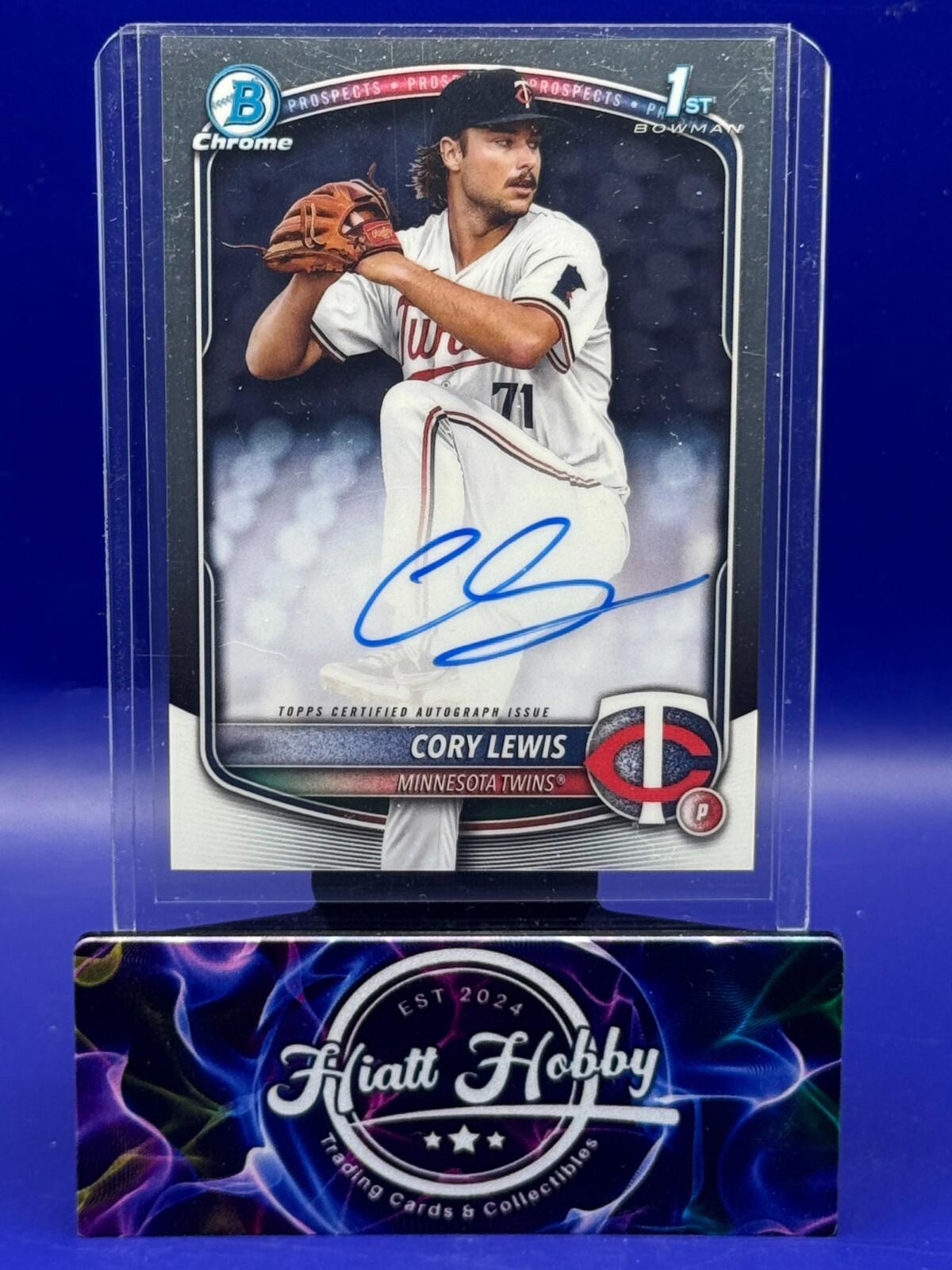 The product is a 2025 Bowman Chrome baseball trading card featuring an autograph of Cory Lewis from the Minnesota Twins. This hard-signed card is an original release by Topps, with authentication from Topps as well. As a rookie card from the MLB World Series, it is a valuable collectible for fans of baseball memorabilia. The card is in English and has a Chrome parallel variety, making it a sought-after item for collectors looking to add unique pieces to their collection. Please Read: SHIPPING SCHEDULE We make every attempt to ship your item out quickly.  Our standard shipping schedule is Tuesday, Thursday, and Saturday drops at the post office and we include all items that have been paid for up to 5PM central the day prior.  That is, all purchases that have been paid for by 5PM central on a Monday will be included in the Tuesday shipment.  If the payment is received after the 5PM deadline, it will be part of the Thursday order drop. SHIPPING DETAILS Cards and Magazines are shipped out in padded or rigid envelopes and/or inserts to protect the item.  Individual cards are typically are shipped in a semi rigid card protector and a penny sleeve.  Combined orders will be packaged securely, but may not have a semi-rigid card protector (item will still be well protected) . Larger items are boxed up properly. We cannot control the USPS or UPS when it comes to the timely delivery of an item, their methods and handling of the item. Please DO NOT hold us responsible for the efforts of a delivery service, however, if you suspect damage to the package, please take pictures prior to opening and record the opening.  This would help with any insurance claims and reimbursements. For orders Exceeding $100, a handling charge is added to offset the cost of insuring your purchase.  This fee will ensure that both parties are protected from loss or damage We offer eBay Standard Envelope Shipping for orders at or below $20.  If your order exceeds $20, you must select USPS Ground Advantage for shipping in order for the order to be processed. INTERNATIONAL SHIPPING Any orders outside of the United States are non-returnable. PICTURES For listings that do not have variations, the card depicted in the photo is the card you will receive.  In cases that the listing has variations, the card may not be the same, but each card is inspected to ensure the same level of condition. MULTIPLE PURCHASES When purchasing multiple item from us, please wait to discuss before paying.  We will combine shipping for you and try to save some money. RATINGS & FEEDBACK If you have an issue with something, please try and contact us first so that we may try and work it out. If we come to a satisfactory conclusion, please consider providing a favorable review and positive feedback. Thank you so much for any business that you do with us.