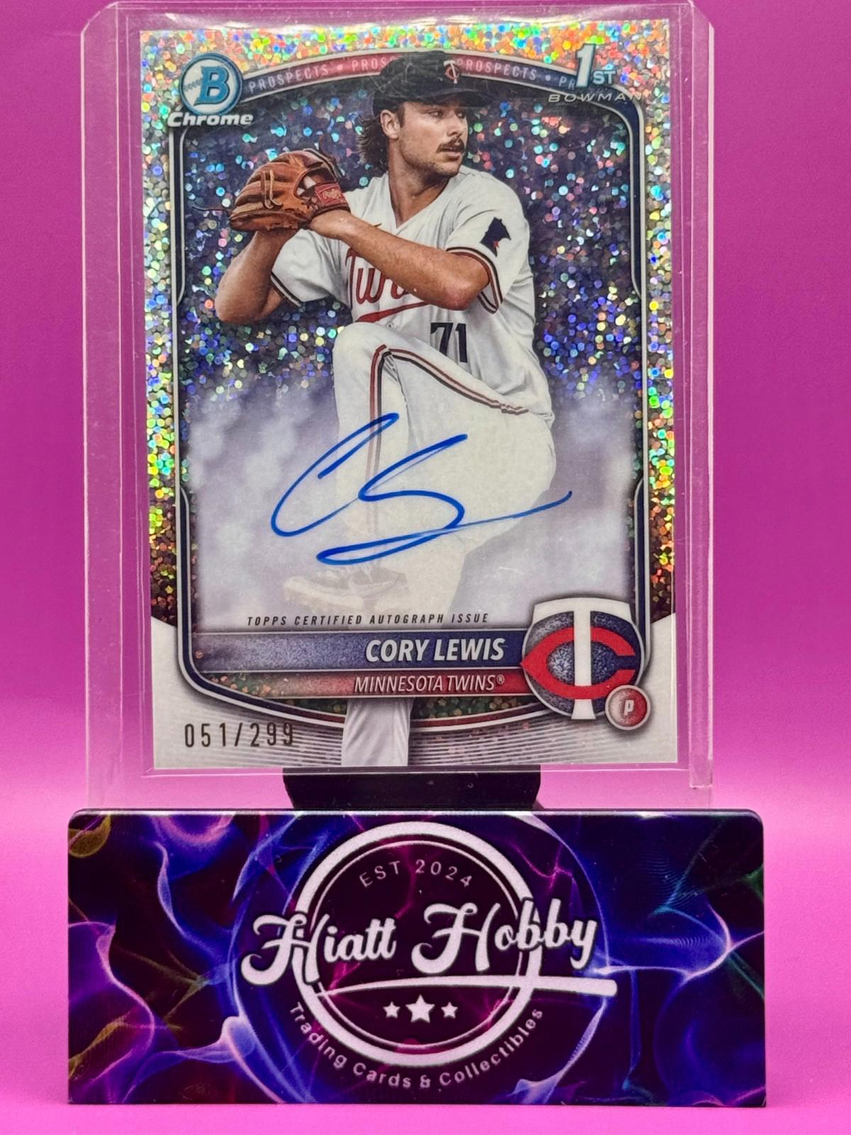The product is a 2025 Bowman Chrome sports trading card featuring Major League Baseball player Cory Lewis of the Minnesota Twins. This specific card is a Speckle Refractor Auto with a serial number of /299, making it a rare and valuable collectible for fans and collectors. Authenticated by Topps, this hard-signed autograph on card stock is a standout addition to any baseball card collection, showcasing the player's signature and image in English language.
