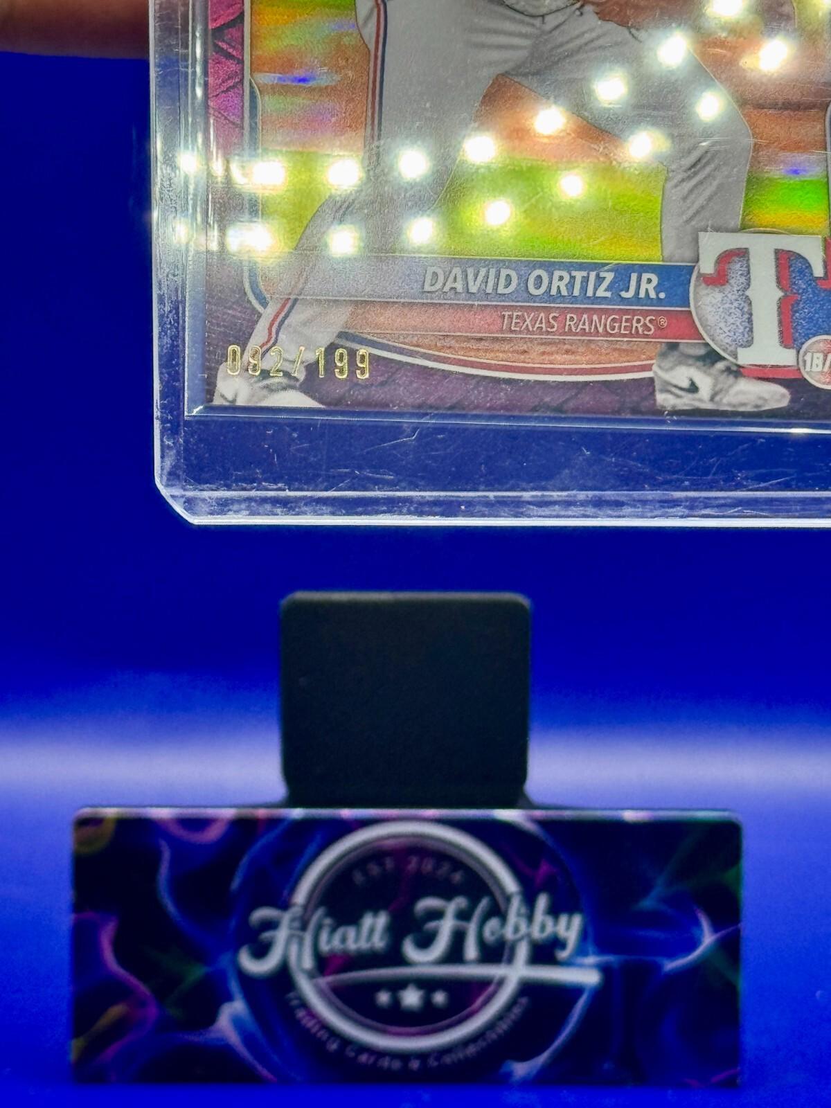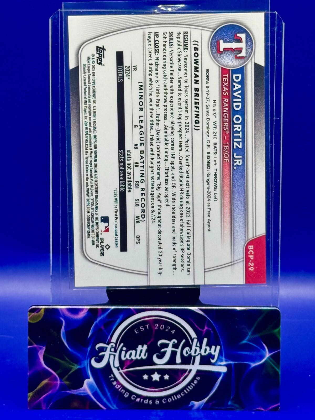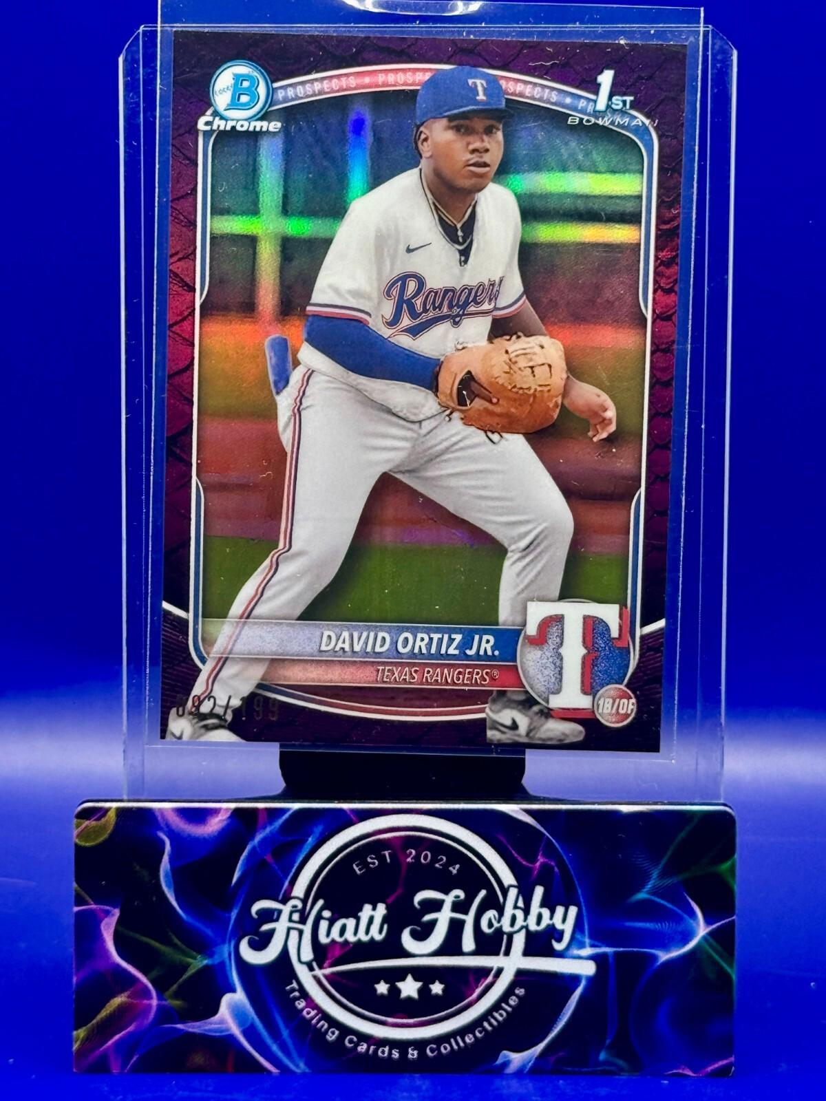 The product is a 2025 Bowman Chrome baseball trading card featuring David Ortiz Jr. of the Texas Rangers. This particular card is a Purple Reptillian Refractor parallel, limited to a print run of 199. Manufactured by Topps in the United States, it is an original card from the set and is a rookie card as well. The card is not autographed and is in English, making it a valuable addition for collectors and fans of Major League Baseball. Please Read: SHIPPING SCHEDULE We make every attempt to ship your item out quickly.  Our standard shipping schedule is Tuesday, Thursday, and Saturday drops at the post office and we include all items that have been paid for up to 5PM central the day prior.  That is, all purchases that have been paid for by 5PM central on a Monday will be included in the Tuesday shipment.  If the payment is received after the 5PM deadline, it will be part of the Thursday order drop. SHIPPING DETAILS Cards and Magazines are shipped out in padded or rigid envelopes and/or inserts to protect the item.  Individual cards are typically are shipped in a semi rigid card protector and a penny sleeve.  Combined orders will be packaged securely, but may not have a semi-rigid card protector (item will still be well protected) . Larger items are boxed up properly. We cannot control the USPS or UPS when it comes to the timely delivery of an item, their methods and handling of the item. Please DO NOT hold us responsible for the efforts of a delivery service, however, if you suspect damage to the package, please take pictures prior to opening and record the opening.  This would help with any insurance claims and reimbursements. For orders Exceeding $100, a handling charge is added to offset the cost of insuring your purchase.  This fee will ensure that both parties are protected from loss or damage We offer eBay Standard Envelope Shipping for orders at or below $20.  If your order exceeds $20, you must select USPS Ground Advantage for shipping in order for the order to be processed. INTERNATIONAL SHIPPING Any orders outside of the United States are non-returnable. PICTURES For listings that do not have variations, the card depicted in the photo is the card you will receive.  In cases that the listing has variations, the card may not be the same, but each card is inspected to ensure the same level of condition. MULTIPLE PURCHASES When purchasing multiple item from us, please wait to discuss before paying.  We will combine shipping for you and try to save some money. RATINGS & FEEDBACK If you have an issue with something, please try and contact us first so that we may try and work it out. If we come to a satisfactory conclusion, please consider providing a favorable review and positive feedback. Thank you so much for any business that you do with us.