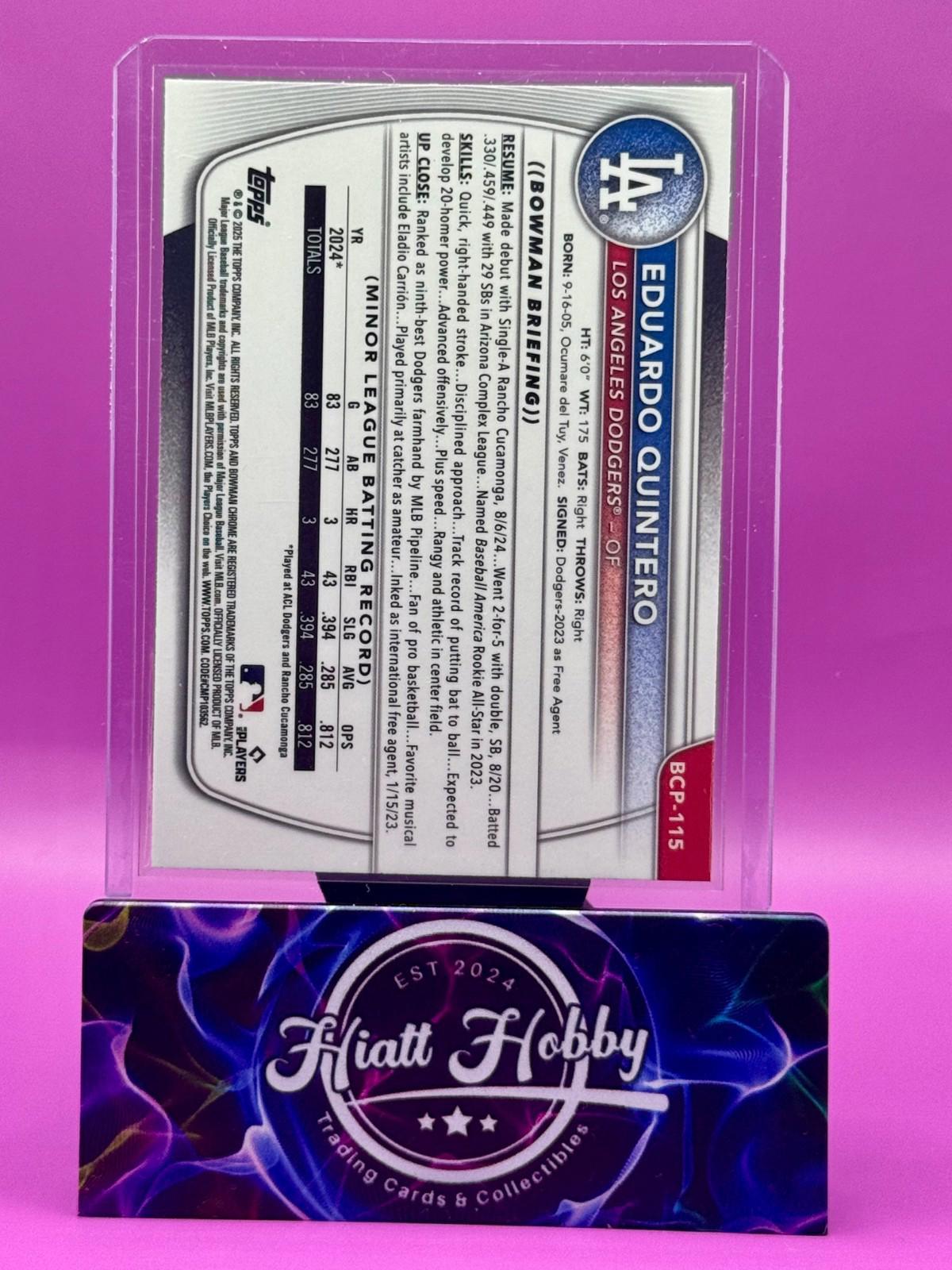 The product is a 2025 Bowman Chrome baseball trading card featuring Eduardo Quintero from the Los Angeles Dodgers. This particular card is a Mojo Refractor parallel, making it a sought-after variety for collectors. Produced by Topps, this original card is part of the Chrome Prospects insert set and showcases Quintero as a rookie player in Major League Baseball. With a standard size and in English language, this collectible is a valuable addition to any baseball card collection.