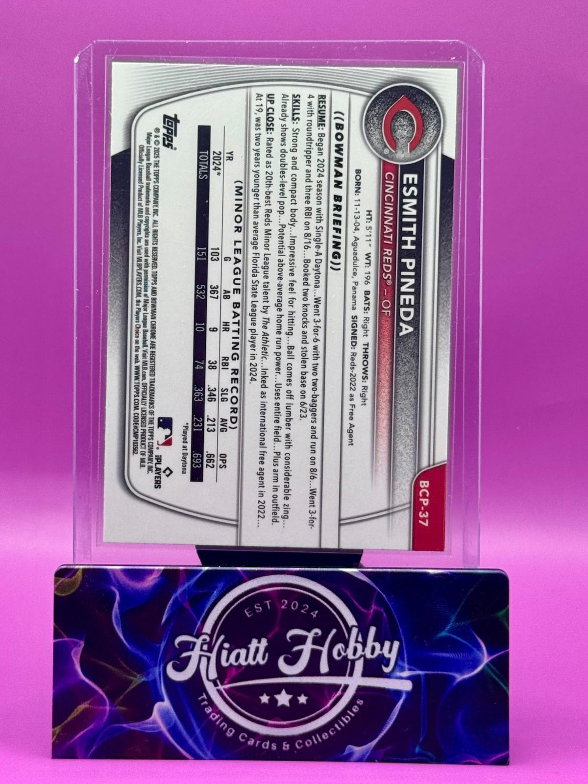 The product is a 2025 Bowman Chrome baseball trading card featuring Esmith Pineda of the Cincinnati Reds. This Mojo Refractor card is part of the Chrome Prospects insert set and is an original release by Topps. It is a standard-sized card in English language, manufactured in the United States. It is a collectible item for fans of Major League Baseball, specifically the MLB World Series tournament.