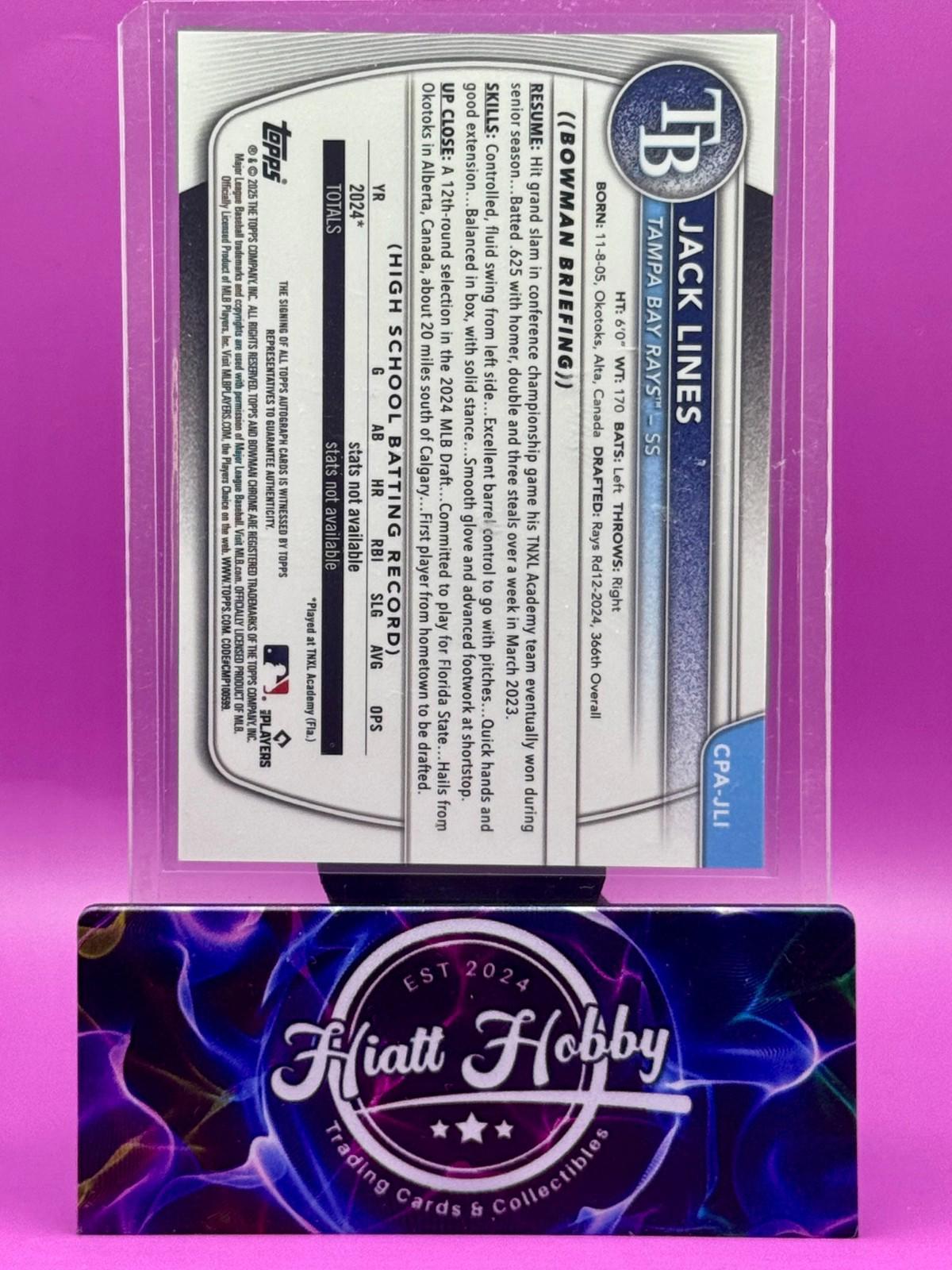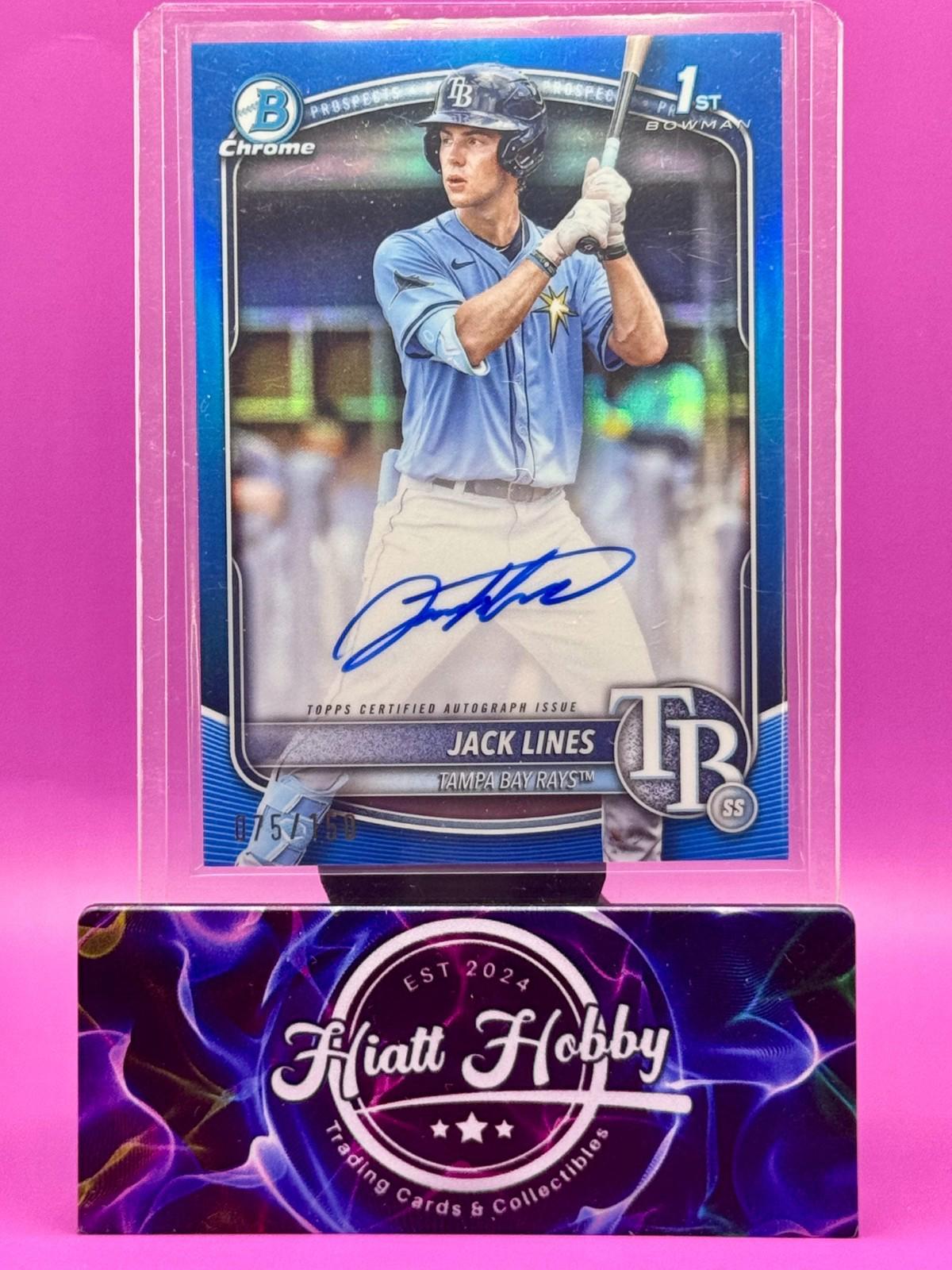 The product is a 2025 Bowman Chrome sports trading card featuring an autograph from Jack Lines of the Tampa Bay Rays. This Blue Refractor parallel card is part of the Chrome Prospect Autographs insert set and is serial numbered to a print run of 150. The hard-signed autograph is authenticated by Topps and the card is manufactured by Topps in the United States. This rookie card is made of card stock and is part of the MLB World Series event/tournament for baseball fans.