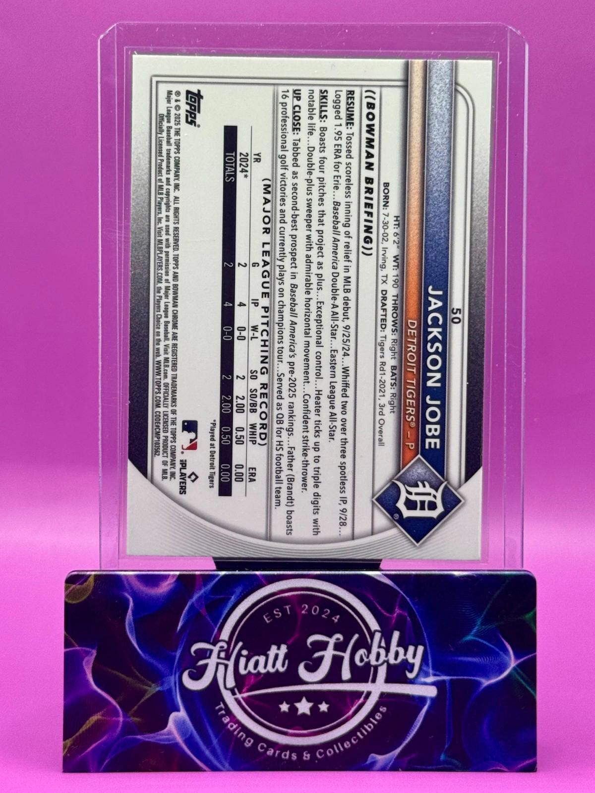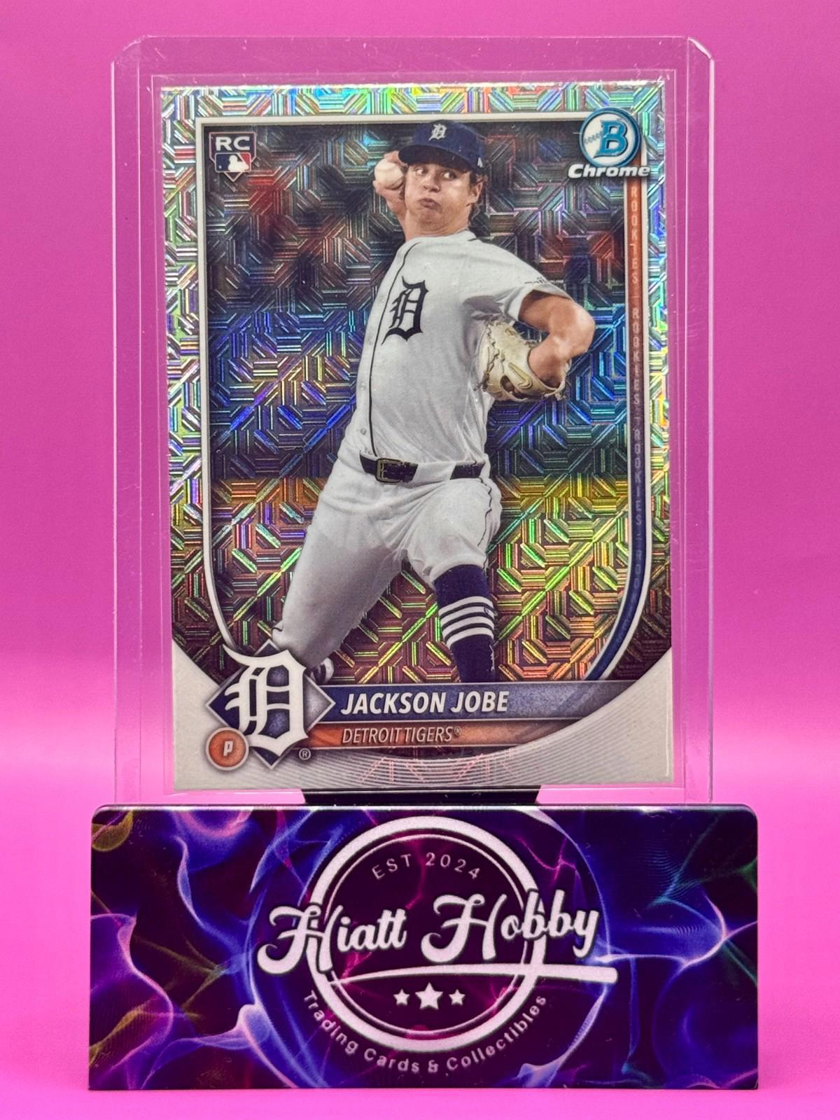 The product is a 2025 Bowman Chrome baseball trading card featuring pitcher Jackson Jobe from the Detroit Tigers. This card is a Mojo Refractor parallel variety with a unique design. It is an original card manufactured by Topps in the United States. The card is not autographed and is part of the MLB World Series set for the 2025 season. This collectible item is a standard size sports trading card in English language.
