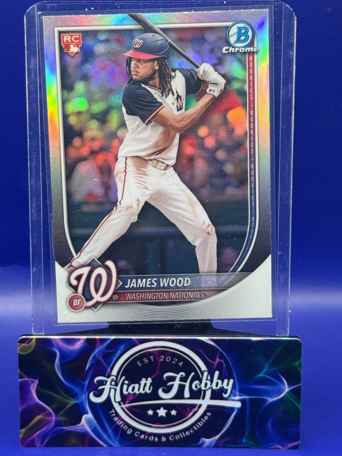 The 2025 Bowman Chrome James Wood #29 Red RC Redemption is a baseball sports trading card featuring the rookie player from the Washington Nationals. This original card manufactured by Topps is part of the 2025 Bowman Chrome set, with a chrome refractor parallel variety. The card is standard-sized and made of card stock, making it a valuable collectible for fans of Major League Baseball and baseball card collectors alike.