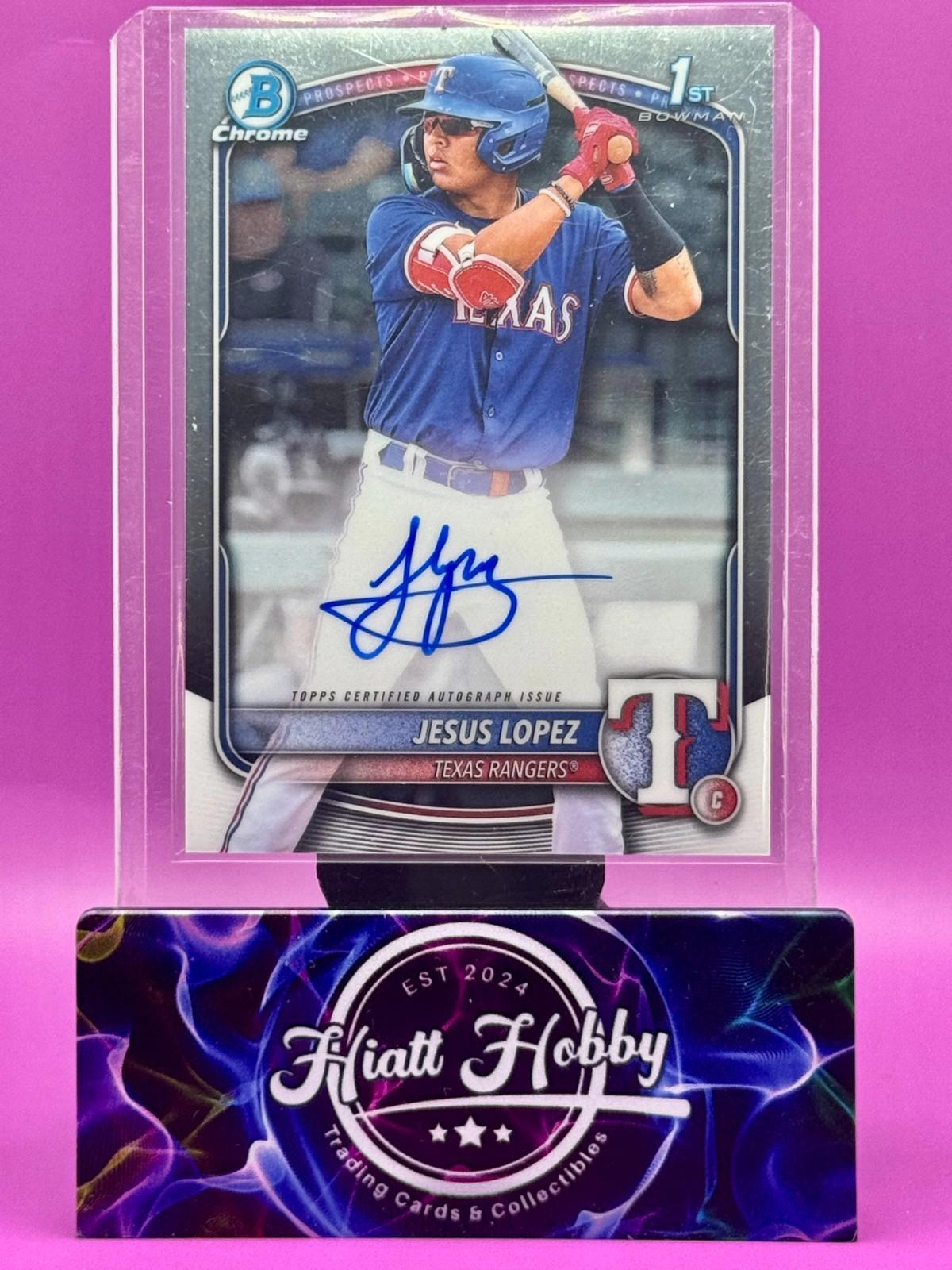 The product is a 2025 Bowman Chrome baseball trading card featuring an autograph from Jesus Lopez, signed in hard format. This card is part of the Chrome Prospect Autographs insert set, with an original design. It is a rookie card that is authenticated by Topps and manufactured by Topps in the United States. The card showcases Lopez as a player for the Texas Rangers in Major League Baseball, making it a valuable collectible for fans and collectors.