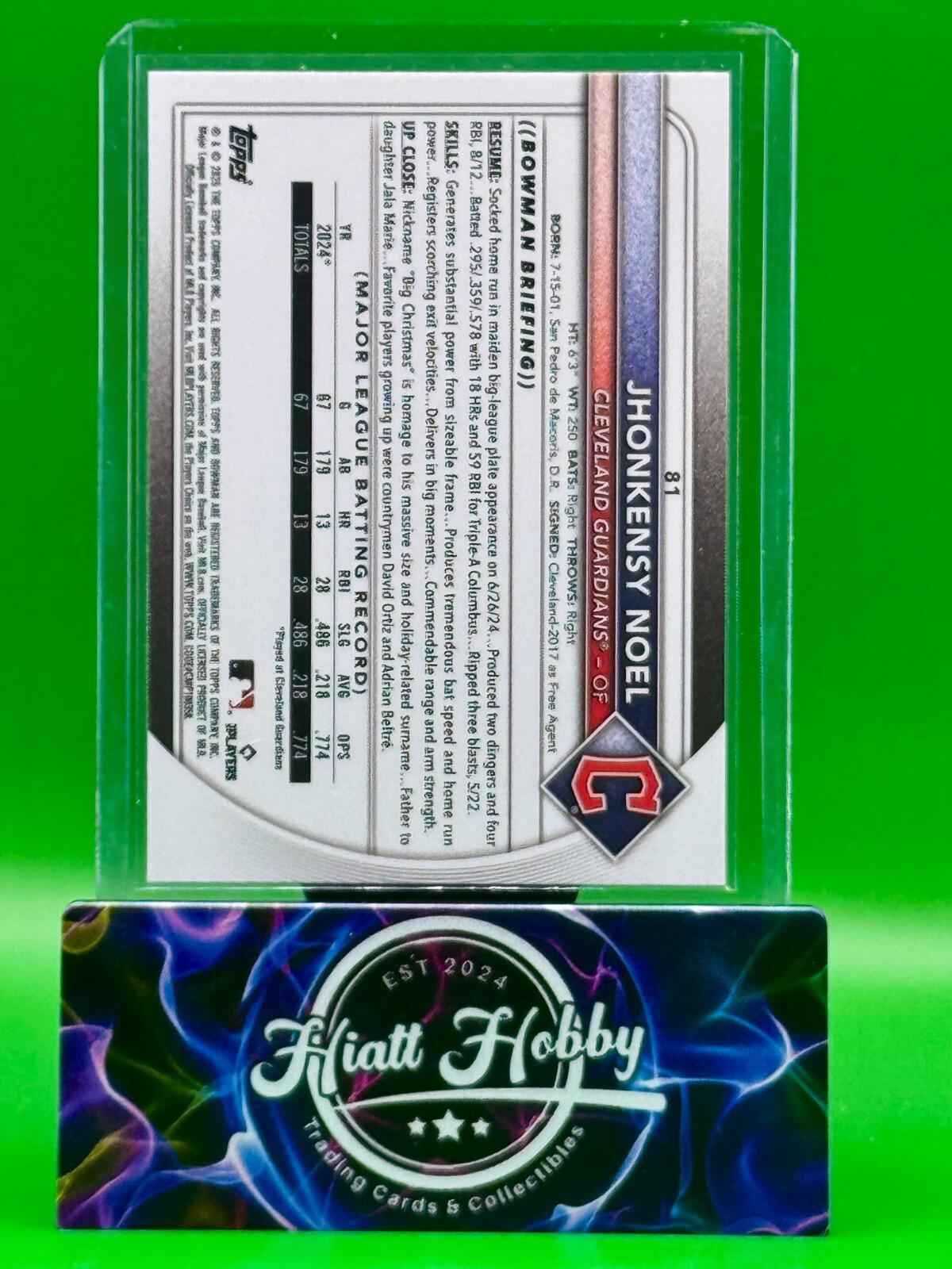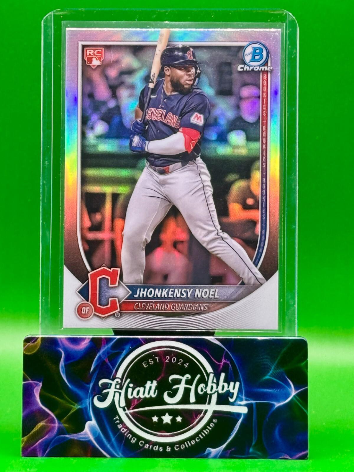 Capture a slice of baseball history with the 2025 Bowman Chrome Jhonkensy Noel #81 Red RC Refractor card. This collectible card showcases the promising talent of Jhonkensy Noel, a key player for the Cleveland Guardians, and is a must-have for any avid baseball card enthusiast or Guardians supporter. Its stunning chrome refractor finish adds a layer of elegance and rarity that is highly sought after in the baseball card community.This original card, part of the Major League Baseball (MLB) 2025 season set, is a non-autographed, standard-sized gem from Topps, the well-known manufacturer of sports trading cards. The card celebrates the MLB World Series event and features the Rookie and Parallel/Variety highlights, making it an exceptional piece for your collection. With its crisp, clear imagery and detailed design, this card is a testament to the craftsmanship of American-made sports memorabilia.